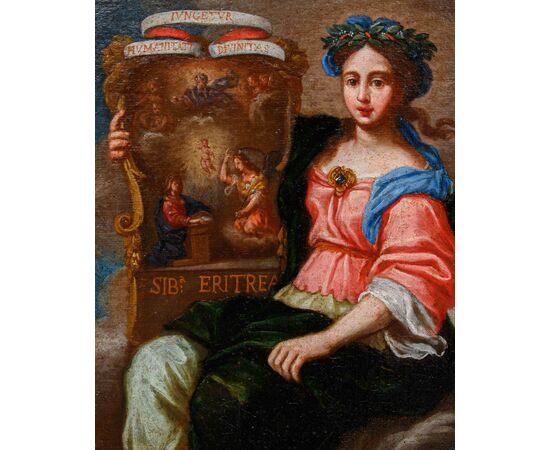 Il dipinto in questione ritrae una figura femminile seduta, identificabile come la Sibilla Eritrea grazie all'iscrizione "SIB ERITREA" visibile sulla base lignea su cui si innesta una cornice lignea entro cui è appunto raffigurata l’Annunciazione. La Sibilla è rappresentata con un'espressione pensierosa e serena. Indossa una veste con maniche ampie di colore rosa salmone, drappeggiata con un tessuto azzurro sulle spalle. Una spilla dorata con una pietra centrale decora il suo petto. La parte inferiore del suo abito è di un verde scuro vellutato, e le sue gambe sono coperte da una stoffa più chiara, forse bianca o avorio, che si increspa delicatamente. Ai piedi indossa dei sandali rossastri che si allacciano intorno alle caviglie. La sua testa è adornata da una corona di fiori blu e foglie verdi, e i suoi capelli castani sono raccolti in parte dietro la nuca. Il suo sguardo è rivolto leggermente verso destra, conferendo un senso di contemplazione. Nella sezione superiore dei grandi rotoli di pergamena su impalcatura lignea sono presenti tre cartigli che recano le scritte “HUMANITATI”, “IUNGETUR” e “DIVINITAS”, termini che se letti insieme si tradurrebbero con la divinità si unisce all’umanità. Nella tradizione cristiana, infatti, alla sibilla eritrea è attribuita una profezia sulla nascita del Redentore e, più in generale, la Redenzione dell’umanità; concordemente con la profezia nell’ edicola è rappresentato un’Annunciazione con la discesa dello Spirito Santo e del Bambino presso la Vergine che sta ricevendo l’annuncio dall’arcangelo Gabriele. In ultimo, se si considera la parola “DIVINITAS”, essa può essere anche interpretata come divinazione o dono della profezia, dando così una sfumatura di significato vicino al ruolo dell’effigiata.