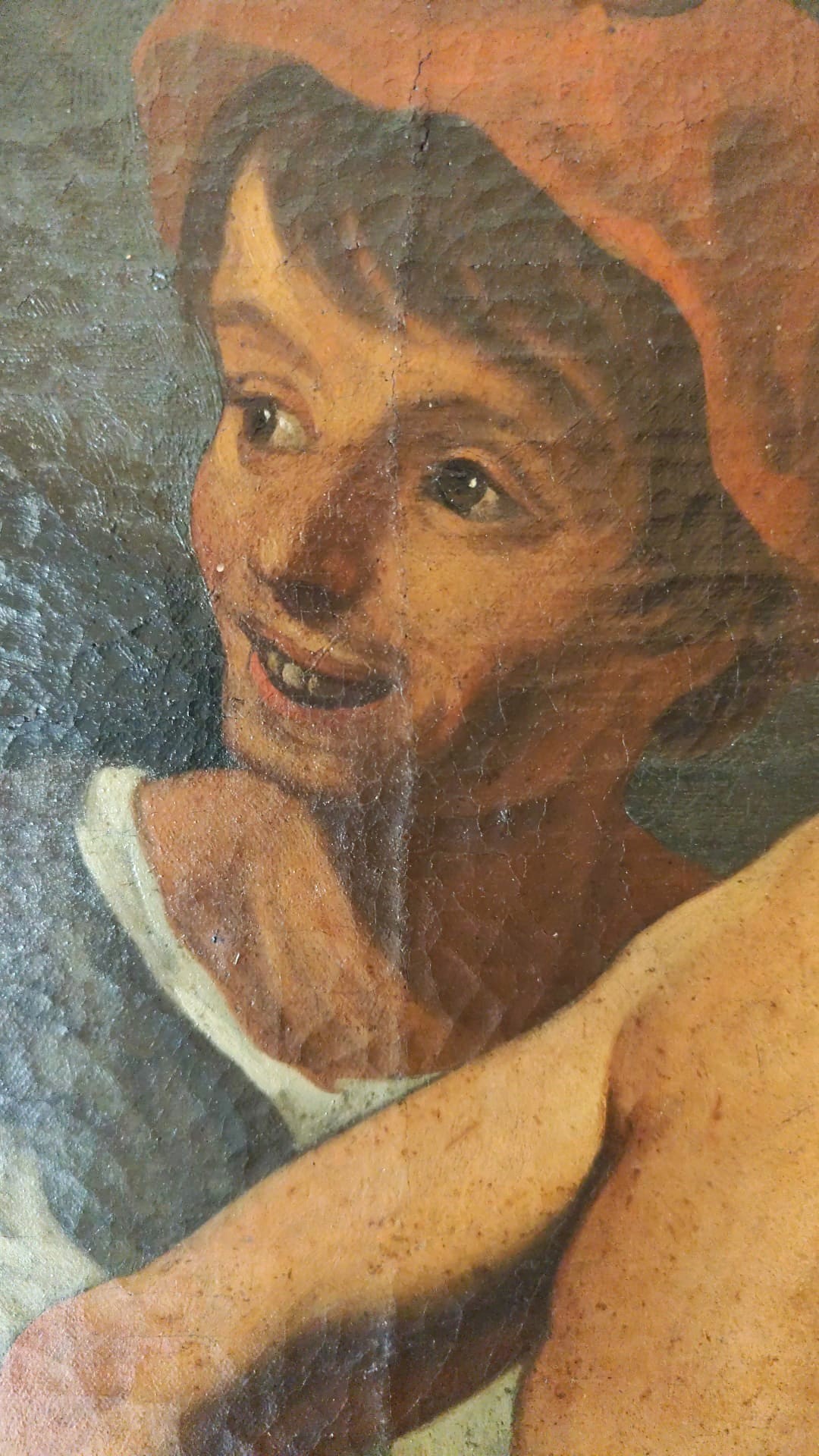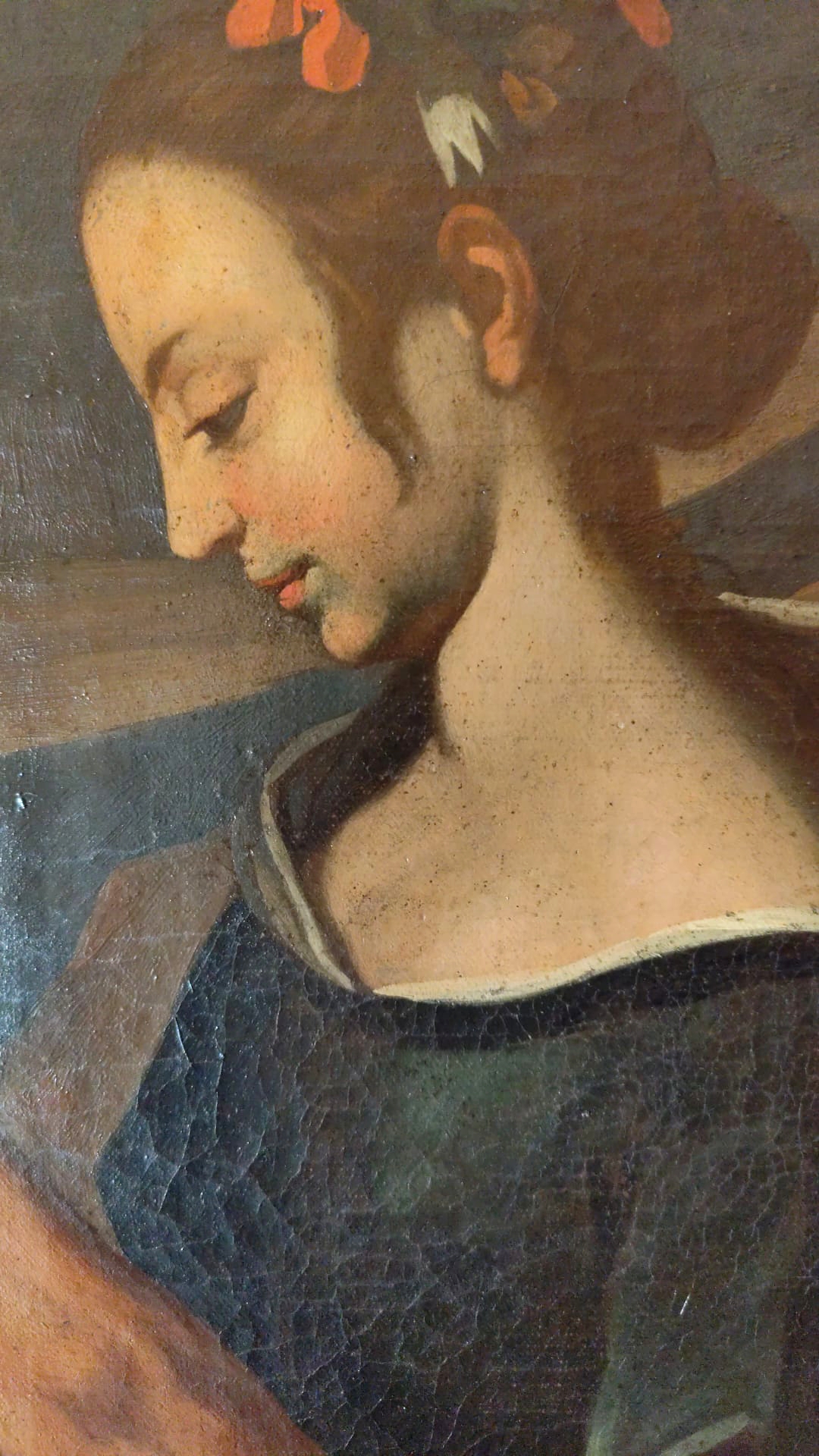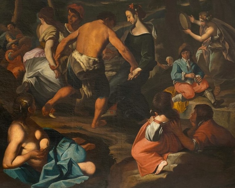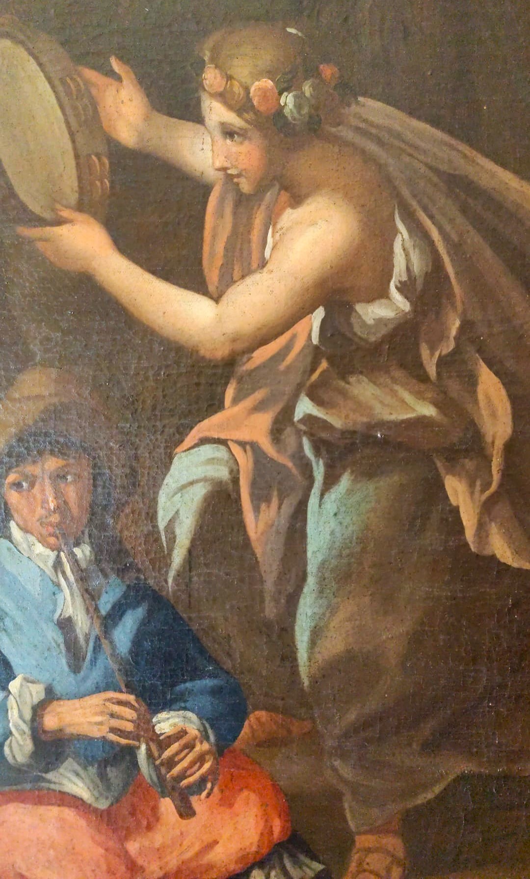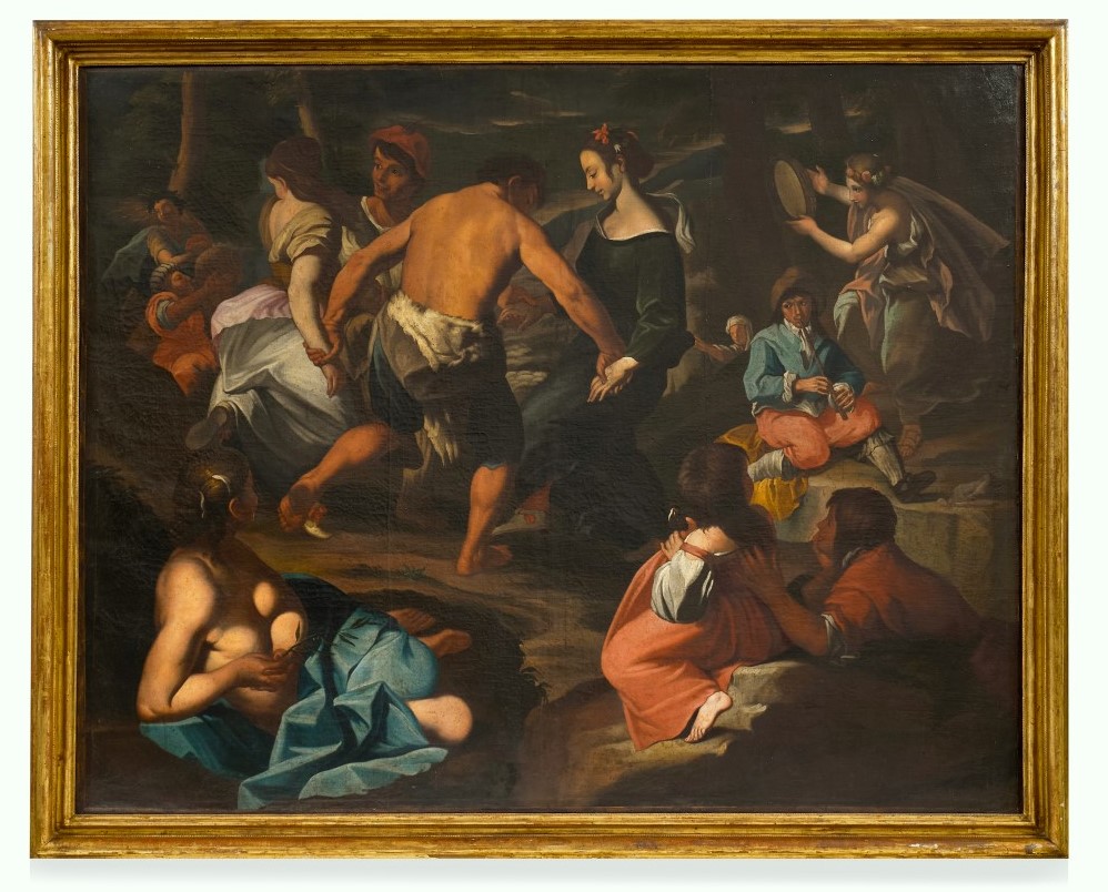 The follower of Guarini organizes the scene harmoniously: the figures, in fact, converse with each other with fluid gestures, while the wooded background envelops the group in a natural embrace. The painter integrates grazing lights that strike musical instruments and faces, generating warm reflections and soft shadows. In fact, a profound knowledge of anatomy is perceived, therefore each character appears alive and three-dimensional.