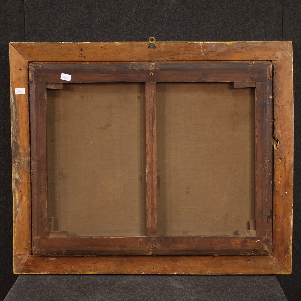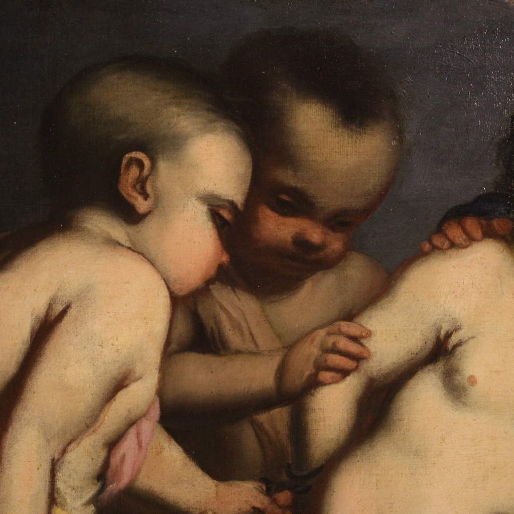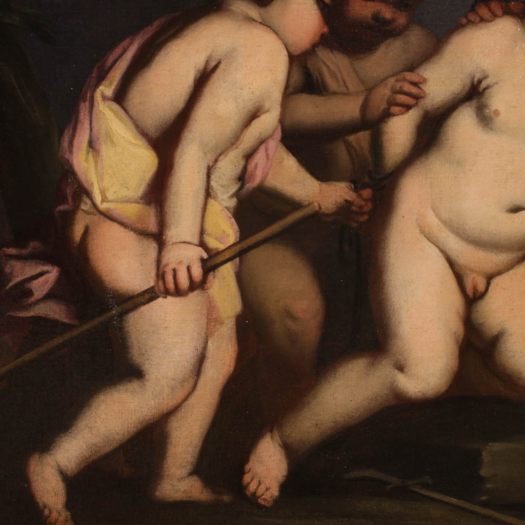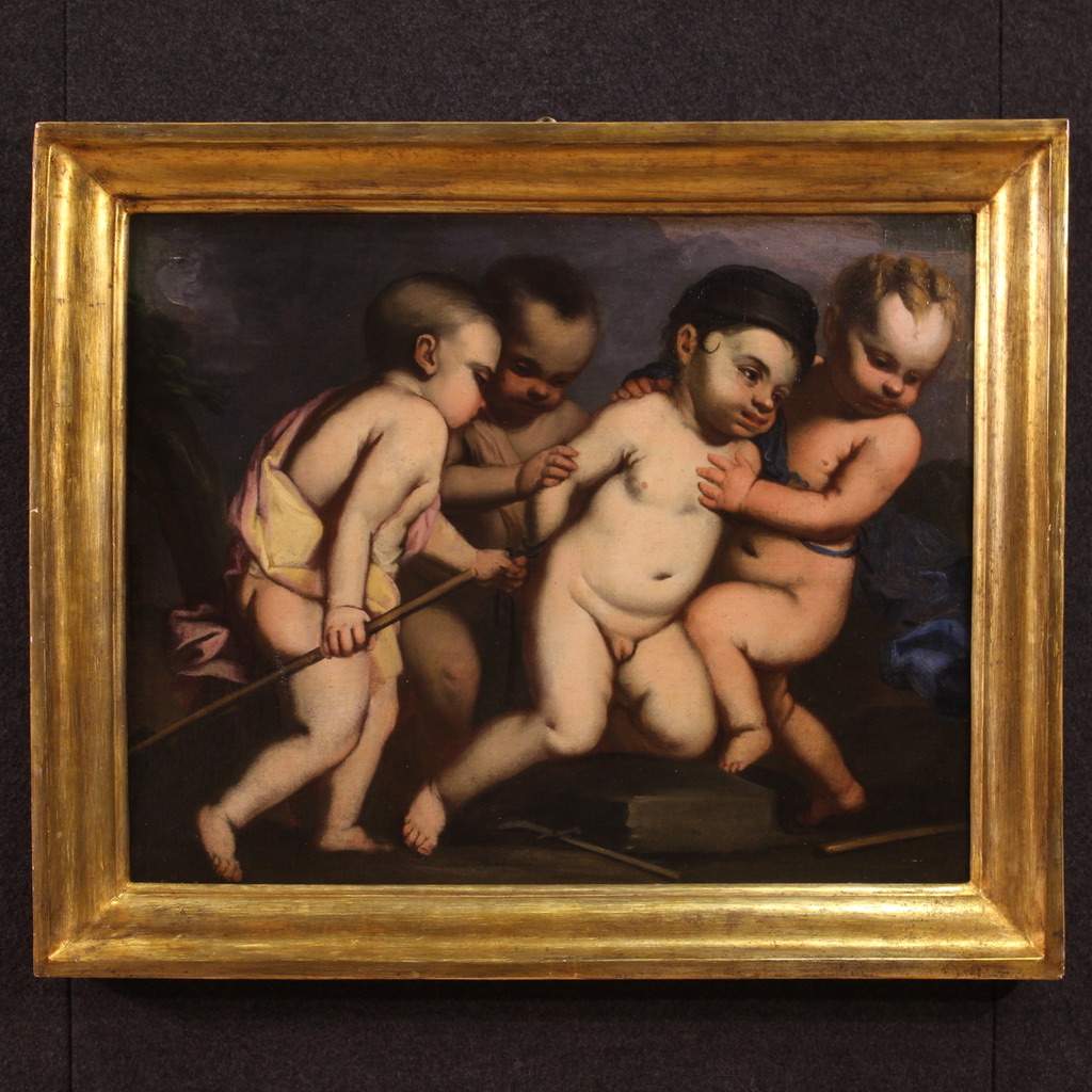 Antique Italian painting from the first half of the 17th century. Oil artwork on canvas depicting an allegorical subject, Game of cherubs, of excellent pictorial quality. Painting of beautiful size and proportion adorned with a non-coeval 19th century wooden frame, carved and gilded (gilding resumed in the 20th century). Painting that develops horizontally from the particular subject, in fact the cherubs delight in the game of war with soldiers and prisoner and fake wooden swords abandoned at their feet (see photo). Artwork of great pictorial quality, note how the characters are distributed on different perspective planes of the composition. Furthermore, the creation of the flesh tones and the skilful use of chiaroscuro denote great mastery. Painting attributable to the Neapolitan painter Massimo Stanzione (1585-1656), lacking additional documentation. Painting that has undergone conservative restoration, relining, replacement of the frame and recovery of color in some places (see photo). Overall in good condition. Sight size H 64 x W 81 cm.