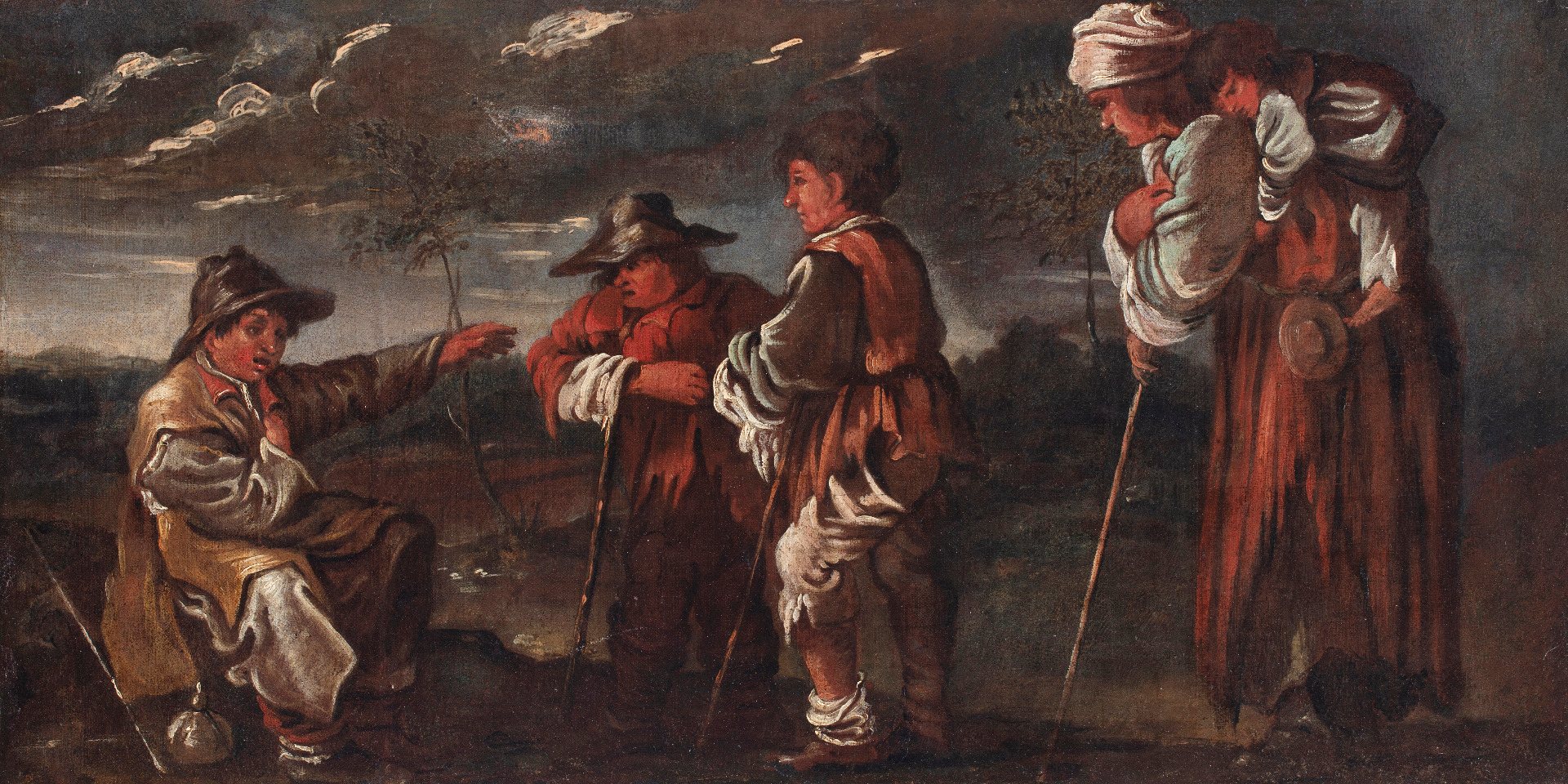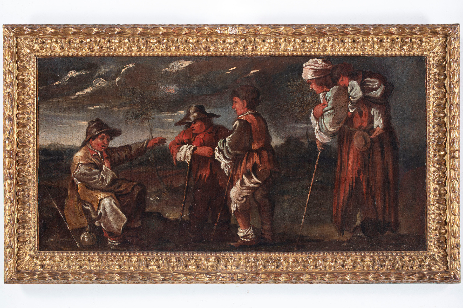 Attributed to Matteo Ghidoni, known as dei Pitocchi (Florence 1626-Padua 1689), Pair of genre scenes, oil on canvas, dimensions 38.5x77.5 cm, with frame dimensions 50x88 cm.