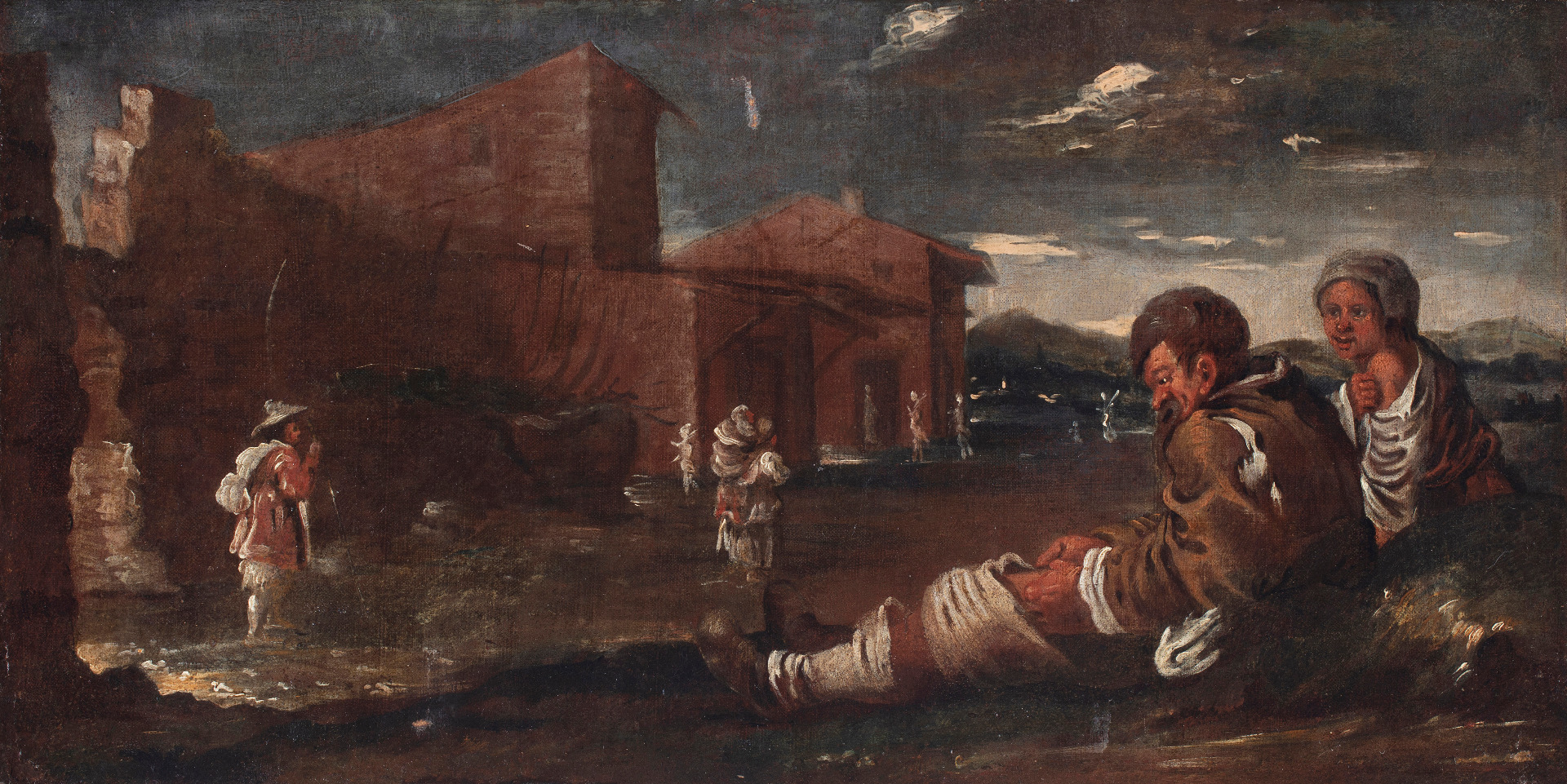 Attributed to Matteo Ghidoni, known as dei Pitocchi (Florence 1626-Padua 1689), Pair of genre scenes, oil on canvas, dimensions 38.5x77.5 cm, with frame dimensions 50x88 cm.