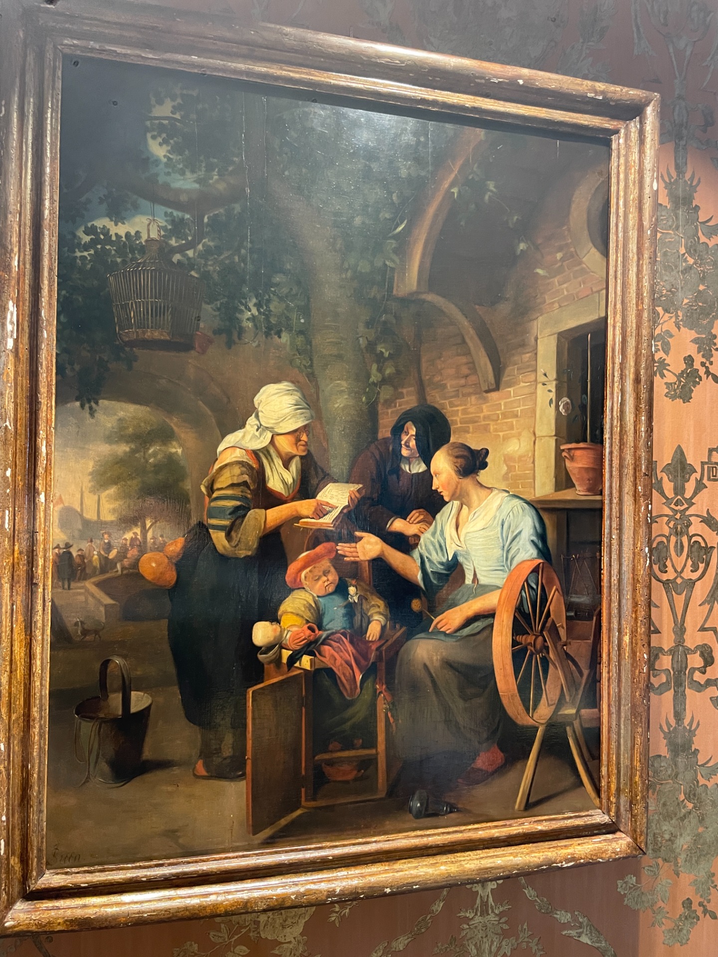 The fine painting, executed in oil on panel, depicts a genre scene in which a fortune teller, holding a book to read fortunes, illustrates her interpretation to a young woman sitting in front of her, while an elderly woman with a covered head watches curiously. The young woman, perhaps a spinner, as suggested by the spinning wheel depicted next to her, holds a biscuit in her hand. On a small wooden chair, a child has fallen asleep, still holding two dolls in its arms. It is a scene of everyday life of humble people, set outdoors in a courtyard in front of a brick house. A tree and an arch in the background create a backdrop, making the environment intimate and welcoming. Beyond the arch, a bustling crowd enlivens what must be a road running along the seashore. In the distance, a galleon can be seen. The work features a meticulous description of details: the painter inserts various details and small objects that, in addition to animating the scene, provide precise information about life in the Golden Age in Holland. The high pictorial and stylistic quality, the descriptive and compositional rendering, are clearly an artistic expression of a master. The work is signed lower left "JSteen". This is the famous Dutch painter Jan Havickszoon Steen (Leiden, 1626 –1679), one of the most established artists in 17th-century Holland. His extensive production includes both genre scenes and mythological and biblical subjects, self-portraits, still lifes and landscapes. His favorite theme was everyday life, especially of the middle and lower classes of society, which he portrays in their ordinary habits or in festivities, sometimes implying allegorical or moralizing meanings. Psychological introspection, irony and a lively chromatic palette are the characteristics that distinguish his style. Jan Steen was born in Leiden, into a wealthy Catholic family. He trained with Nicolaes Knüpfer, a German painter known for his historical or narrative paintings set in Utrecht. His painting was also influenced by Adriaen van Ostade, a painter of rural scenes, who lived in Haarlem, although it is not known if there was any contact between the two. In 1648 Steen was among the founders of the Sint-Lucasgilde ("Guild of Saint Luke") of Leiden, and shortly after, he became an assistant in The Hague to the renowned landscape painter Jan van Goyen. On 3 October 1649 he married Margriet, daughter of van Goyen, with whom he had eight children. Steen worked with his father-in-law until 1654. He then lived in Delft, Warmond and Haarlem, where he was very productive. In 1670, following the death of his father and that of his wife, which occurred a year earlier, Steen returned to Leiden, where he had inherited his father's house, in which he lived until his death.