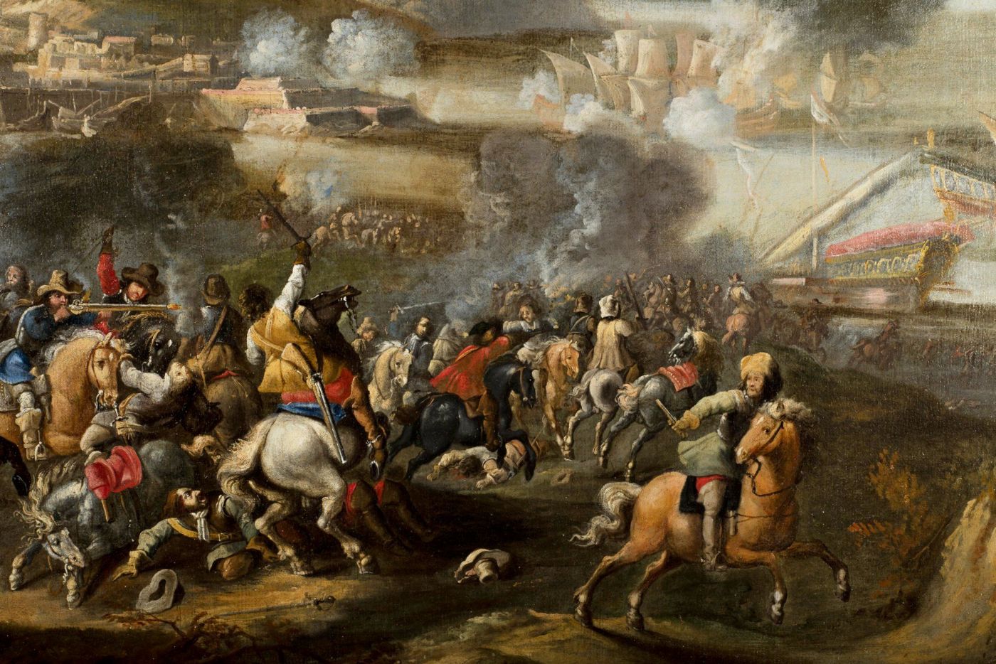 Marzio Masturzo, Battle between cavalry and vessels with fortified city on the left, oil on canvas, 17th century