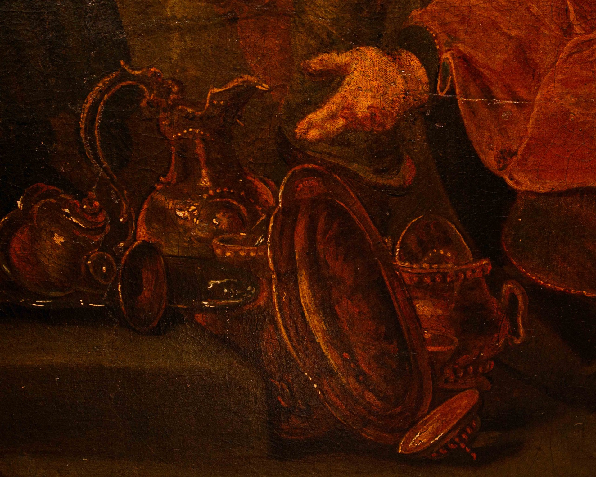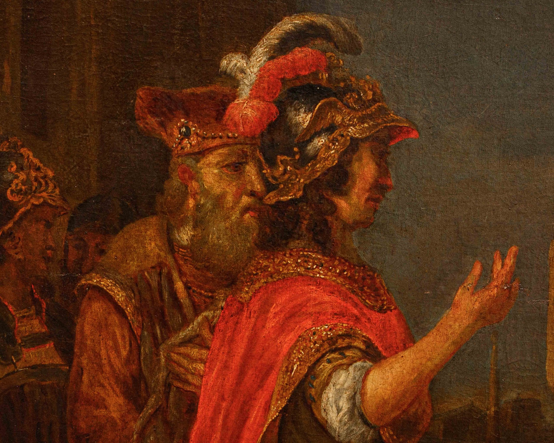 Gerbrand van den Eeckhout, (Amsterdam, 1621 – ivi, 1674) La continenza di Scipione Olio su tela, cm 181 x 170 Con cornice 197 x 186 Seguace di Ferdinand Bol, Nicolaes Maes e Govert Flinck, ma sopra tutti del genio di Rembrandt, Van den Eeckhout coniugò il segno lasciato dall’arte dell’oreficeria, conosciuta nella bottega paterna, con il lessico più aggiornato della pittura fiamminga. L’inserimento entro il cosiddetto barocco olandese, di cui l’artista si fece fervido testimone in qualità del rinnovato espressionismo dei suoi dipinti storici, si accordò alla sua lezione con crescente interesse; Van den Eeckhout anticipò nell’evanescenza sottile dei preziosi oggetti ritratti, veri e propri scenari di dosate vicende umane, quanto avrebbe poi fatto Pieter de Hooch, e come questi molti altri allievi. La particolare predilezione per soggetti storici, sia biblici che di mondo, derivarono all’artista dal forte accademismo allora in voga nella città di Amsterdam, foriero di commesse internazionali che scoprirono nella controparte meridionale europea, soprattutto nella Francia, la principale richiedente sul mercato. L’accostamento a Rembrandt si consumò per Van den Eeckhout attorno agli anni Trenta del XVII secolo, permanendo tuttavia nel suo ductus pittorico, sia pure rinnovato e disciplinato in maniera spiccatamente originale attraverso la partecipata dosatura del colore. Se i toni scuri e il particolareggiato stacco luministico sono riconoscibili anche nello stile del maestro, la voce di Van den Eeckhout si disvela nel sentito lirismo che effonde dai visi dei ritratti, stigma sentimentale della vicenda narrata, capace di far pervenire allo spettatore con maggior veemenza il significato morale dell’immagine. La scena, di natura storica, si riferisce a quanto tràdito da Tito Livio (Ab Urbe Condita, XXVI, 50, 1-13 passim), successivamente romanzato dal Petrarca (Africa, IV, 375-388), tematica davvero ricercata entro il mondo della storia dell’arte. Nell’ambito della Seconda Guerra Punica, il generale Publio Cornelio Scipione (234 a.C. – 183 a.C.) cinse d’assedio e fece capitolare la città di Nuova Cartagine, in Spagna. Nell’ottica dell’offerta al nuovo conquistatore attraverso libagioni e omaggi, alcuni cittadini estesero a Scipione gran copia di argenti nonché una fanciulla, già promessa sposa di tal Allucius. Scipione ripiegò l’offerta, rendendo la fanciulla al promesso sposo. La vicenda entrò nel novero degli episodi paradigmatici del notorio altruismo romano, insieme al genuino sentimento di misericordia, poi accostato da una certa letteratura critica al rispetto cristiano, che aveva riscoperto Scipione. Il presente dipinto risulta allo stato odierno degli studi accostabile a terze repliche eseguite dallo stesso Van den Eeckhout, conservate nelle collezioni del Museo d’arte di Toledo, del Rijksmuseum di Amsterdam (1653) e del Philadelphia Museum of Art (1659); proveniente dalla Galleria Accorsi, l’opera introduce, al pari delle similari tele, ma non in riproposizione pedissequa, una precisa teoria di vasellame argenteo - che Scipione rifiuta-, esemplata sui pezzi seicenteschi eseguiti da Adam van Vianen. La linfa orgogliosamente fiamminga è offerta, nel presente, dalla vividezza dei toni dorati e rossi, che infiammano la composizione. La calibrata presentazione dei personaggi, cadenzata linearmene in primo piano, al pari delle processioni paratattiche sugli antichi fregi romani, organizza un modo ascendente dal lato destro del dipinto al sinistro, facendo così coincidere il punto di massima tensione nella persona di Scipione, eccellente vir romano, mosso dalla pietas e non già dal turpe imbarbarimento del conquistatore. Il fascio di sole che inonda le architetture sullo sfondo riverbera nel pendant lumeggiato che scorre sulle ricche vesti dei personaggi. Certo non i prossimi sposi, e nemmeno i parenti della giovane indossano vesti romano-ispaniche; la moda è quella del periodo d’oro fiammingo, magnificamente elogiata nel tripudio di morbide pieghe che disegnano il mantello di Scipione e dell’uomo inginocchiato, nonché nel purpureo velluto della donna in basso a destra. La decisa e materica pennellata, pregna di densità plastica, riempie con generosità tutte le campiture del dipinto, rincorrendo fin nel più minuto dettaglio le candide gocce di bagliore solare, che spiccano sui preziosi accatastati e sulle armature dei militi. L’intensità del brano storico, musicato attraverso splendide rifiniture artistiche, si concentra così in una monumentale istantanea politica, di vibrante apparire estatico, di vividamente felice insegnamento allegorico. Esulando ora dalla critica artistica, a conferma dell’importanza dell’opera, riteniamo opportuno segnalare la provenienza del dipinto dalla collezione Accorsi di Torino, poi trasposto in importante collezione milanese come ultima proprietà. È stata altresì presentata documentazione cartacea, di cui vi è traccia registrata, attestante lo scambio epistolare avvenuto durante la metà degli anni ’80 tra la proprietà ed il Museo di Belle arti di Lille rappresentato dal Direttore e conservatore generale Arnaud Brejan de Lavergnèe e Mr. Robert Labati. Il carteggio ripercorre il lungo iter che aveva portato alla richiesta di donazione dell’opera al suddetto ente dopo visita del 28 Dicembre, non accolta dai proprietari del dipinto.