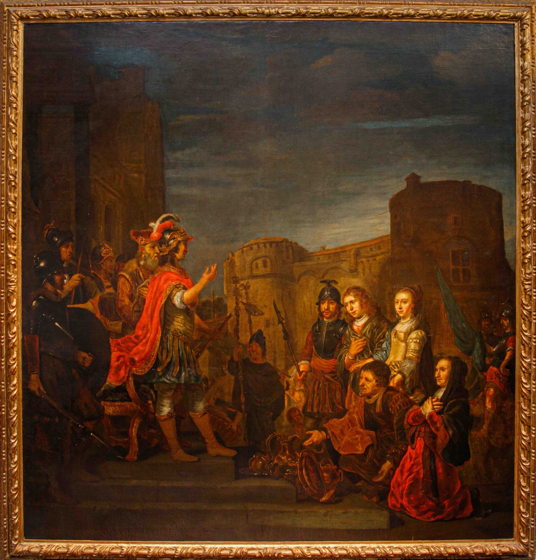 Gerbrand van den Eeckhout, (Amsterdam, 1621 – ivi, 1674) La continenza di Scipione Olio su tela, cm 181 x 170 Con cornice 197 x 186 Seguace di Ferdinand Bol, Nicolaes Maes e Govert Flinck, ma sopra tutti del genio di Rembrandt, Van den Eeckhout coniugò il segno...