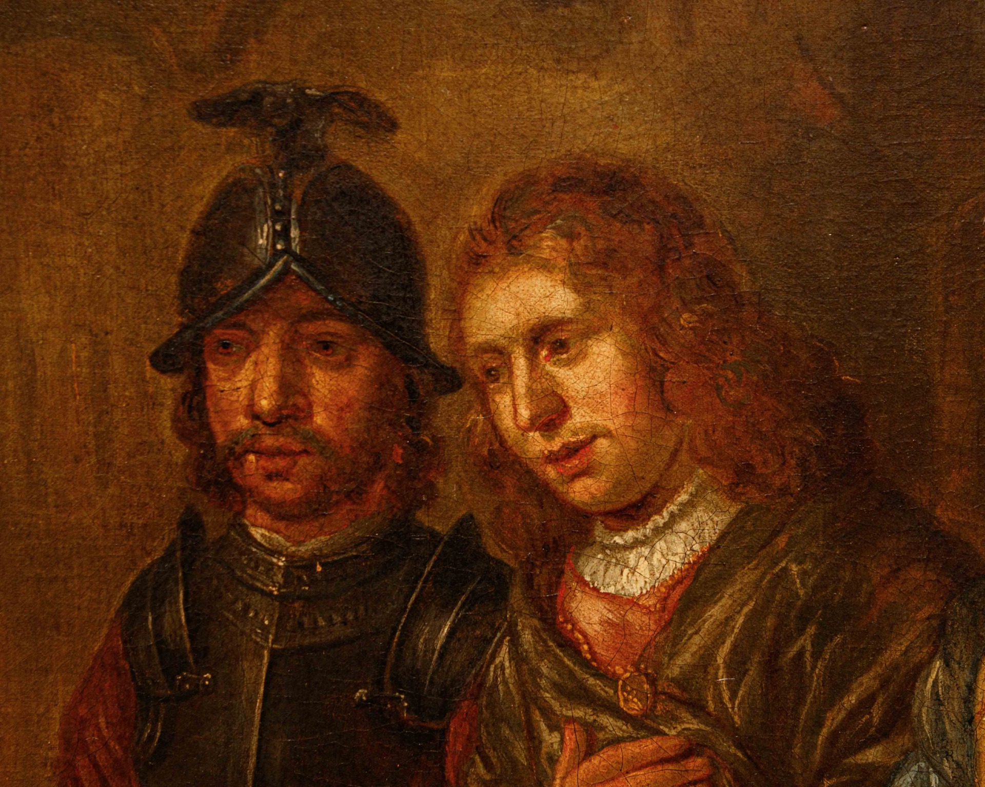 Gerbrand van den Eeckhout, (Amsterdam, 1621 – ivi, 1674) La continenza di Scipione Olio su tela, cm 181 x 170 Con cornice 197 x 186 Seguace di Ferdinand Bol, Nicolaes Maes e Govert Flinck, ma sopra tutti del genio di Rembrandt, Van den Eeckhout coniugò il segno lasciato dall’arte dell’oreficeria, conosciuta nella bottega paterna, con il lessico più aggiornato della pittura fiamminga. L’inserimento entro il cosiddetto barocco olandese, di cui l’artista si fece fervido testimone in qualità del rinnovato espressionismo dei suoi dipinti storici, si accordò alla sua lezione con crescente interesse; Van den Eeckhout anticipò nell’evanescenza sottile dei preziosi oggetti ritratti, veri e propri scenari di dosate vicende umane, quanto avrebbe poi fatto Pieter de Hooch, e come questi molti altri allievi. La particolare predilezione per soggetti storici, sia biblici che di mondo, derivarono all’artista dal forte accademismo allora in voga nella città di Amsterdam, foriero di commesse internazionali che scoprirono nella controparte meridionale europea, soprattutto nella Francia, la principale richiedente sul mercato. L’accostamento a Rembrandt si consumò per Van den Eeckhout attorno agli anni Trenta del XVII secolo, permanendo tuttavia nel suo ductus pittorico, sia pure rinnovato e disciplinato in maniera spiccatamente originale attraverso la partecipata dosatura del colore. Se i toni scuri e il particolareggiato stacco luministico sono riconoscibili anche nello stile del maestro, la voce di Van den Eeckhout si disvela nel sentito lirismo che effonde dai visi dei ritratti, stigma sentimentale della vicenda narrata, capace di far pervenire allo spettatore con maggior veemenza il significato morale dell’immagine. La scena, di natura storica, si riferisce a quanto tràdito da Tito Livio (Ab Urbe Condita, XXVI, 50, 1-13 passim), successivamente romanzato dal Petrarca (Africa, IV, 375-388), tematica davvero ricercata entro il mondo della storia dell’arte. Nell’ambito della Seconda Guerra Punica, il generale Publio Cornelio Scipione (234 a.C. – 183 a.C.) cinse d’assedio e fece capitolare la città di Nuova Cartagine, in Spagna. Nell’ottica dell’offerta al nuovo conquistatore attraverso libagioni e omaggi, alcuni cittadini estesero a Scipione gran copia di argenti nonché una fanciulla, già promessa sposa di tal Allucius. Scipione ripiegò l’offerta, rendendo la fanciulla al promesso sposo. La vicenda entrò nel novero degli episodi paradigmatici del notorio altruismo romano, insieme al genuino sentimento di misericordia, poi accostato da una certa letteratura critica al rispetto cristiano, che aveva riscoperto Scipione. Il presente dipinto risulta allo stato odierno degli studi accostabile a terze repliche eseguite dallo stesso Van den Eeckhout, conservate nelle collezioni del Museo d’arte di Toledo, del Rijksmuseum di Amsterdam (1653) e del Philadelphia Museum of Art (1659); proveniente dalla Galleria Accorsi, l’opera introduce, al pari delle similari tele, ma non in riproposizione pedissequa, una precisa teoria di vasellame argenteo - che Scipione rifiuta-, esemplata sui pezzi seicenteschi eseguiti da Adam van Vianen. La linfa orgogliosamente fiamminga è offerta, nel presente, dalla vividezza dei toni dorati e rossi, che infiammano la composizione. La calibrata presentazione dei personaggi, cadenzata linearmene in primo piano, al pari delle processioni paratattiche sugli antichi fregi romani, organizza un modo ascendente dal lato destro del dipinto al sinistro, facendo così coincidere il punto di massima tensione nella persona di Scipione, eccellente vir romano, mosso dalla pietas e non già dal turpe imbarbarimento del conquistatore. Il fascio di sole che inonda le architetture sullo sfondo riverbera nel pendant lumeggiato che scorre sulle ricche vesti dei personaggi. Certo non i prossimi sposi, e nemmeno i parenti della giovane indossano vesti romano-ispaniche; la moda è quella del periodo d’oro fiammingo, magnificamente elogiata nel tripudio di morbide pieghe che disegnano il mantello di Scipione e dell’uomo inginocchiato, nonché nel purpureo velluto della donna in basso a destra. La decisa e materica pennellata, pregna di densità plastica, riempie con generosità tutte le campiture del dipinto, rincorrendo fin nel più minuto dettaglio le candide gocce di bagliore solare, che spiccano sui preziosi accatastati e sulle armature dei militi. L’intensità del brano storico, musicato attraverso splendide rifiniture artistiche, si concentra così in una monumentale istantanea politica, di vibrante apparire estatico, di vividamente felice insegnamento allegorico. Esulando ora dalla critica artistica, a conferma dell’importanza dell’opera, riteniamo opportuno segnalare la provenienza del dipinto dalla collezione Accorsi di Torino, poi trasposto in importante collezione milanese come ultima proprietà. È stata altresì presentata documentazione cartacea, di cui vi è traccia registrata, attestante lo scambio epistolare avvenuto durante la metà degli anni ’80 tra la proprietà ed il Museo di Belle arti di Lille rappresentato dal Direttore e conservatore generale Arnaud Brejan de Lavergnèe e Mr. Robert Labati. Il carteggio ripercorre il lungo iter che aveva portato alla richiesta di donazione dell’opera al suddetto ente dopo visita del 28 Dicembre, non accolta dai proprietari del dipinto.