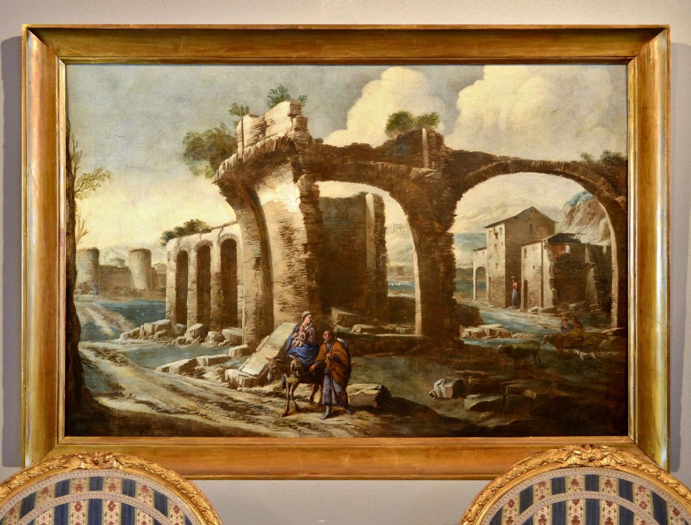 The beautiful painting published, a large landscape with architectural ruins, fully reflects the pictorial poetics of Antonio Travi (Sestri Ponente 1608 - Genoa 1665), the first landscape painter of the Genoese pictorial school; poetics that remains constant throughout his prolific career: from his beginnings as a pupil of Bernardo Strozzi, until his death in 1668, when his flourishing workshop was flanked by numerous sons and pupils. The imposing ruins, highlighted by an algid and luminous brightness, are the backdrop to the biblical episode of the Flight into Egypt, with the Holy Family in the foreground.