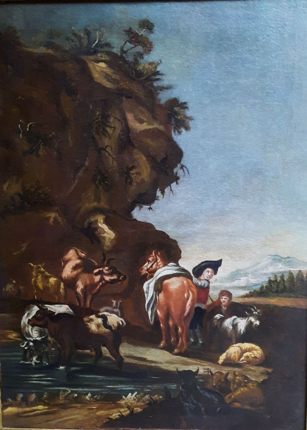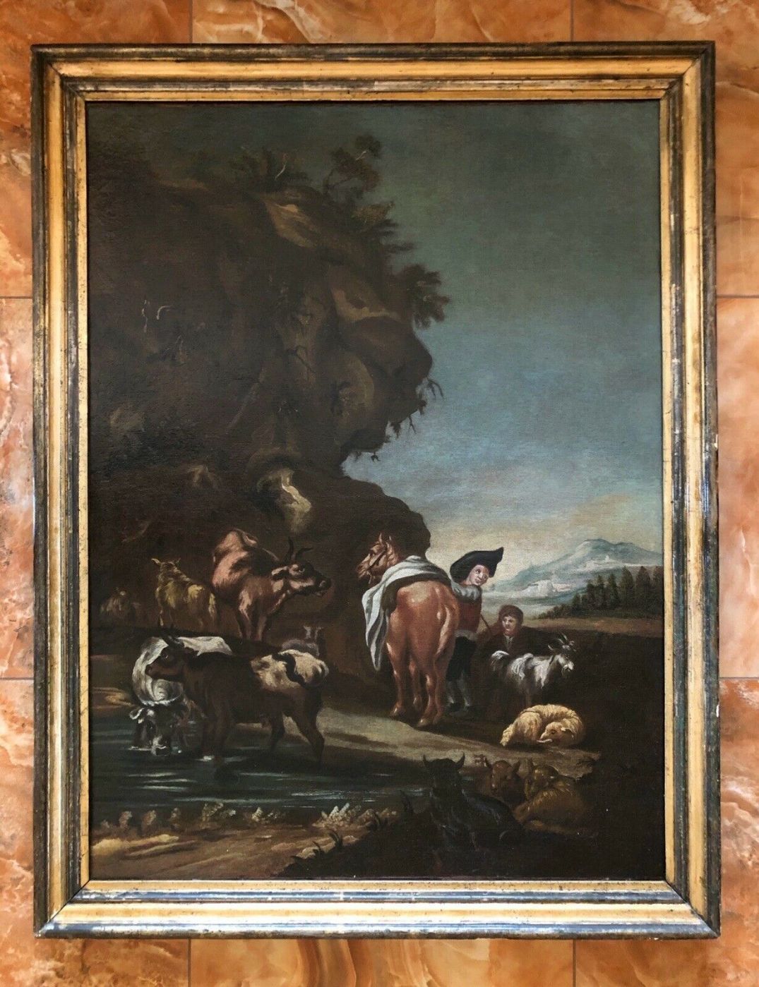 Le dimensioni totali del quadro sono 109 x 84,5 cm la tela 98,5 × 73,5 cm come si può vedere dalle foto il quadro è stato rintelato,si notano piccoli segni del tempo sulla cornice, ma il tutto in perfetto stato da appendere.