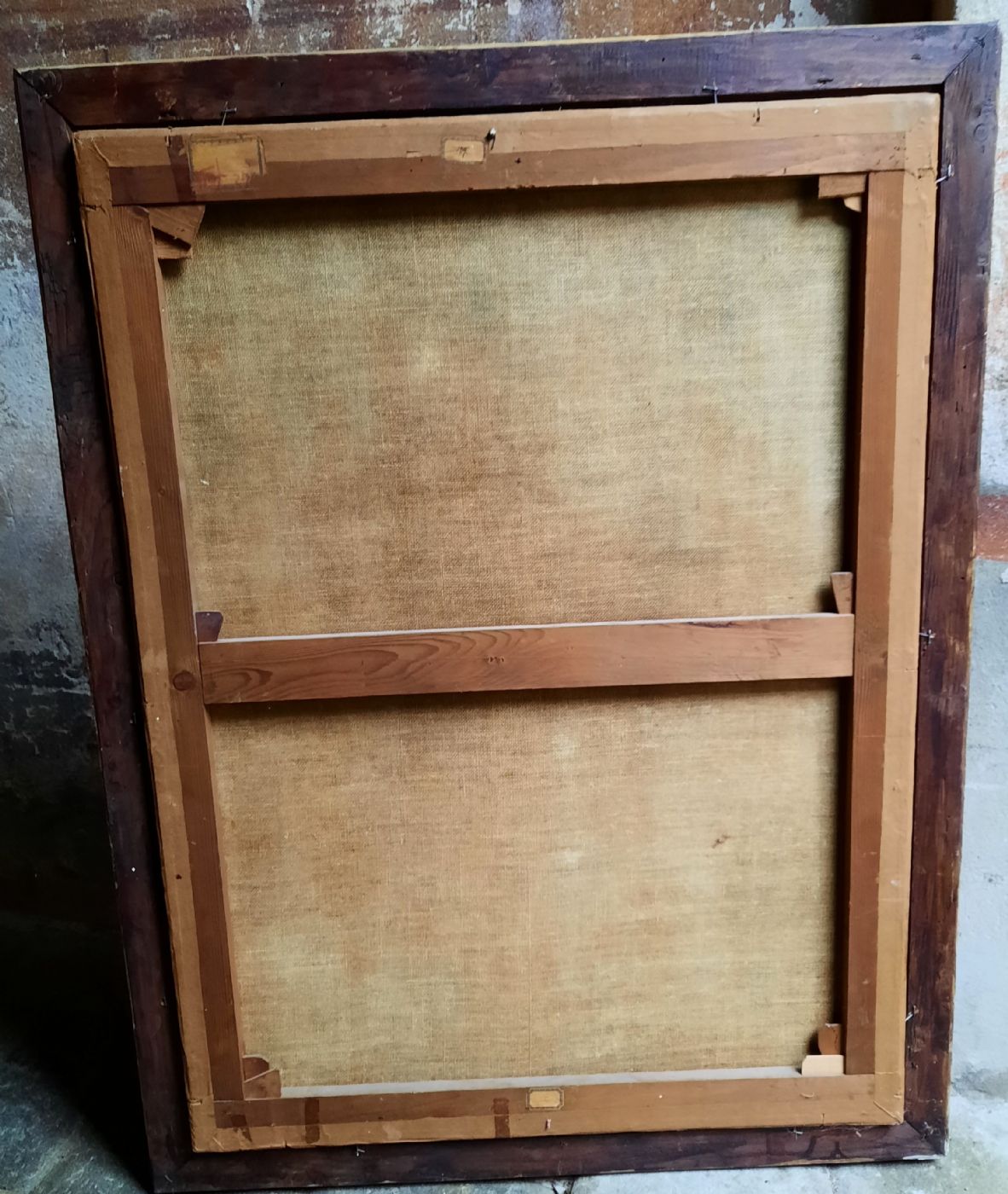 Le dimensioni totali del quadro sono 109 x 84,5 cm la tela 98,5 × 73,5 cm come si può vedere dalle foto il quadro è stato rintelato,si notano piccoli segni del tempo sulla cornice, ma il tutto in perfetto stato da appendere.