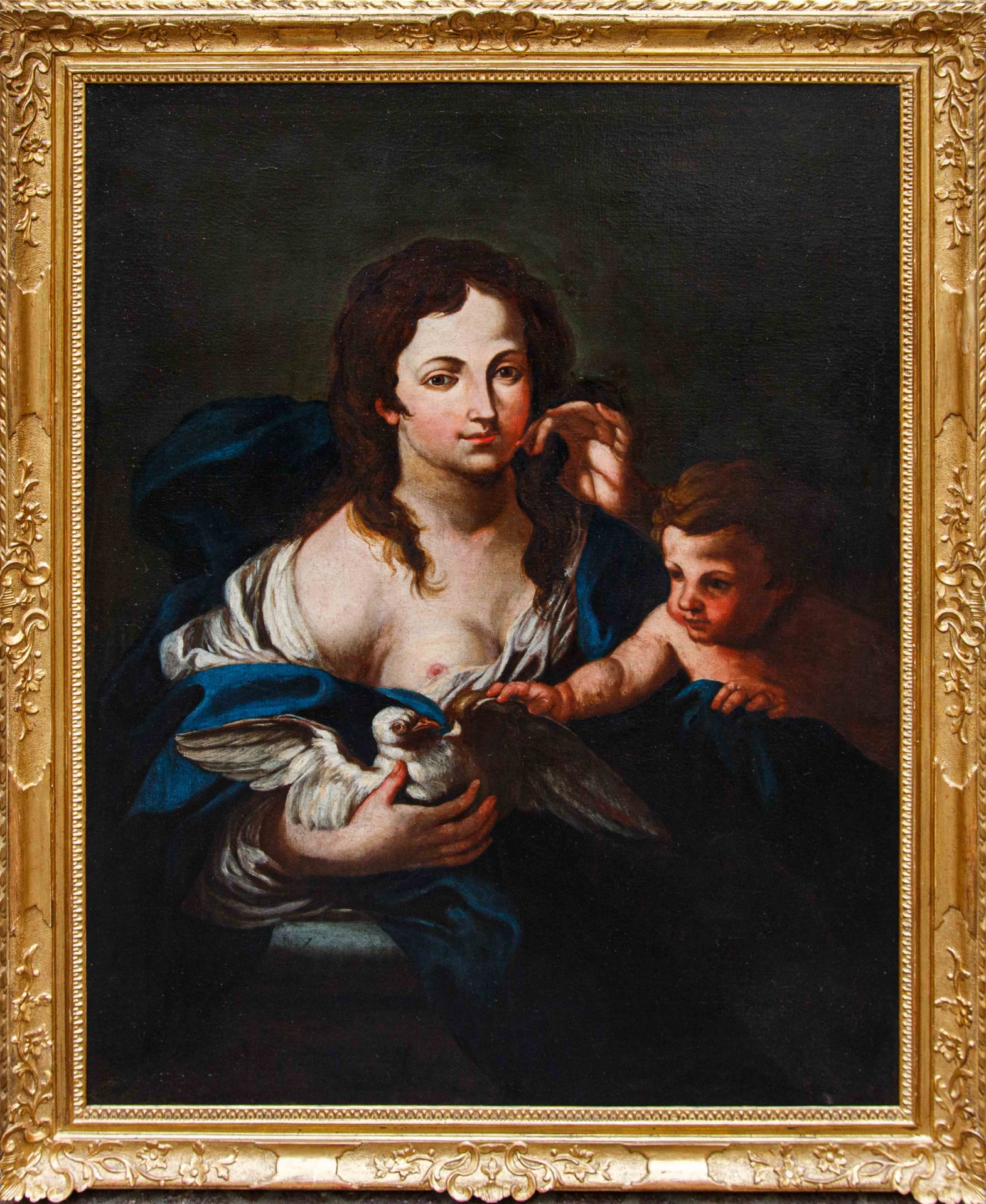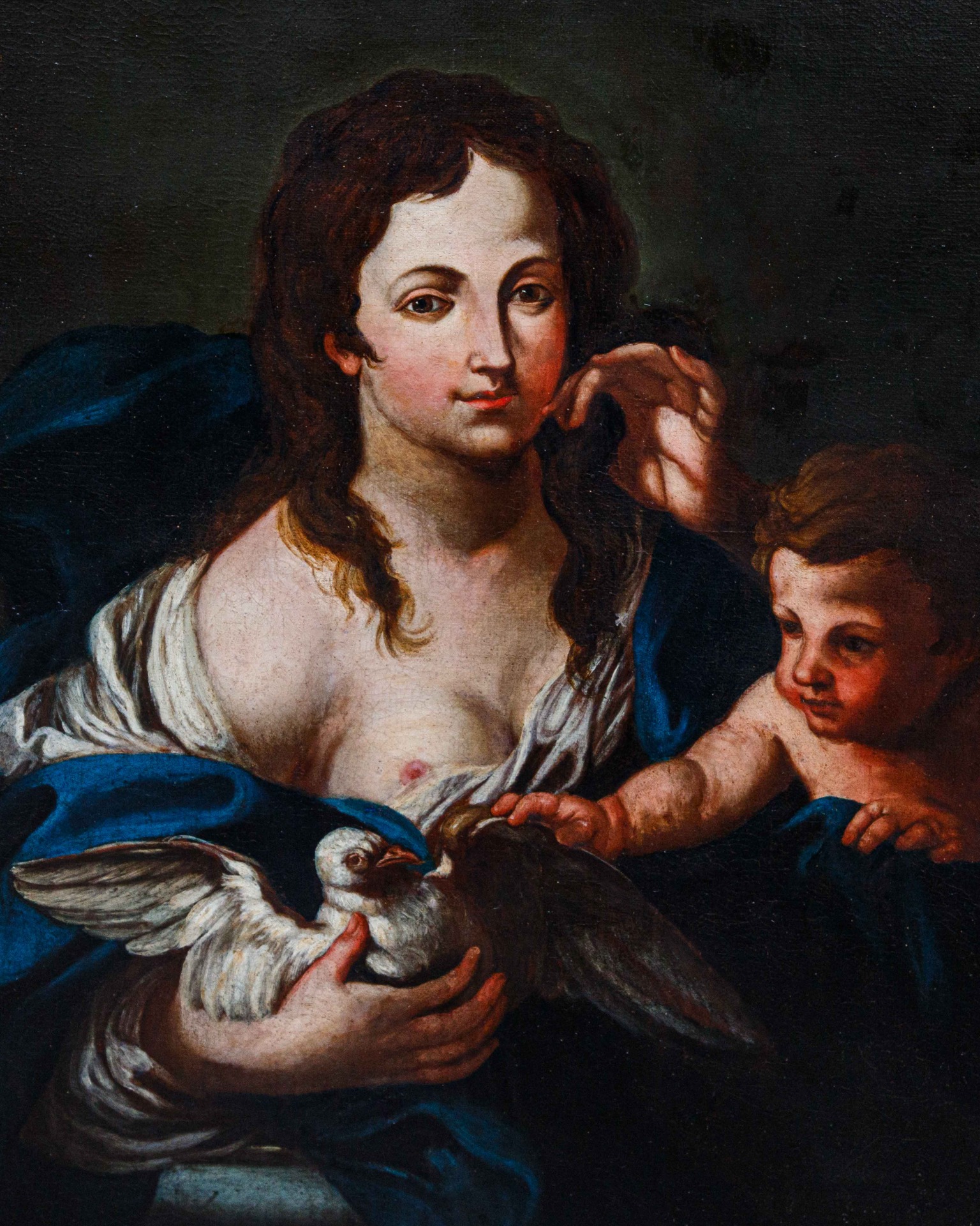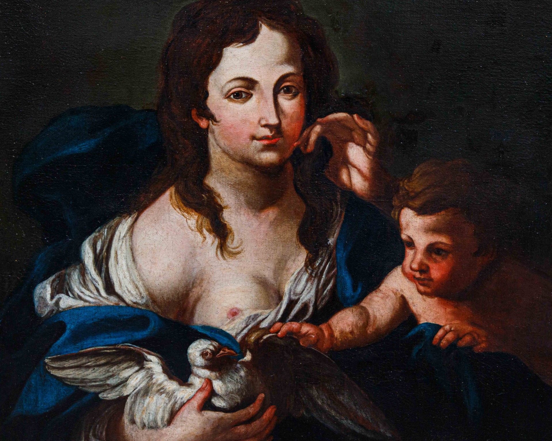 The proud and enigmatic gaze turned towards the viewer, the sensually suggestive pose as well as the presence of a dove and a small cherub, identified as Cupid, allow us to recognize in this enigmatic female figure the features of Venus, goddess of Love and Beauty.