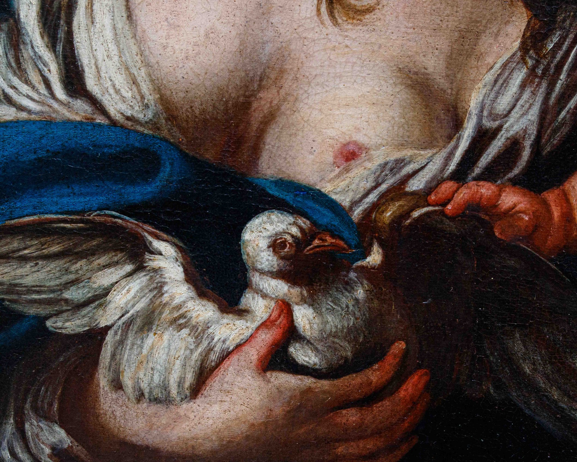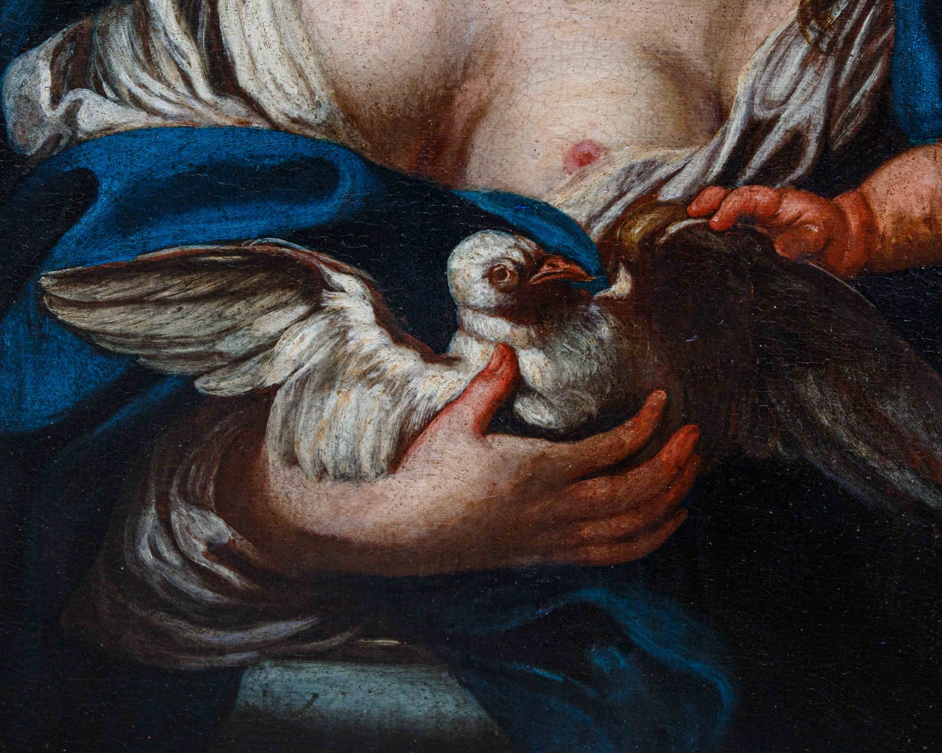 Regarding the present painting, as comparisons, it is impossible not to connect the heroic women painted by Elisabetta Sirani and her workshop of students, celebrated in the psychological type and in the technicalities used, in the present, to shape the volumes of the flesh and to sprout feathers and crumpled robes of characters and figured animals.