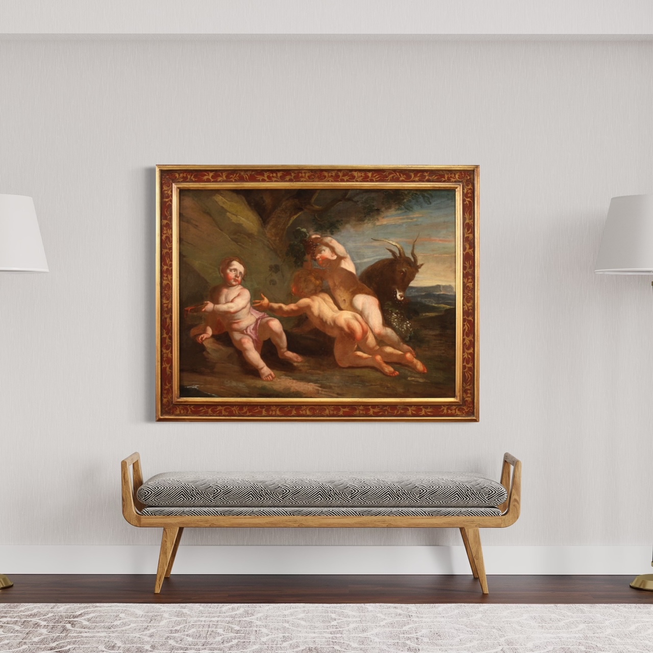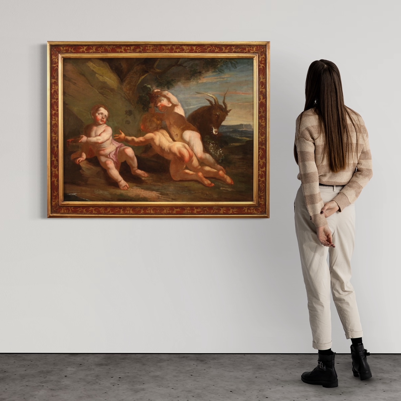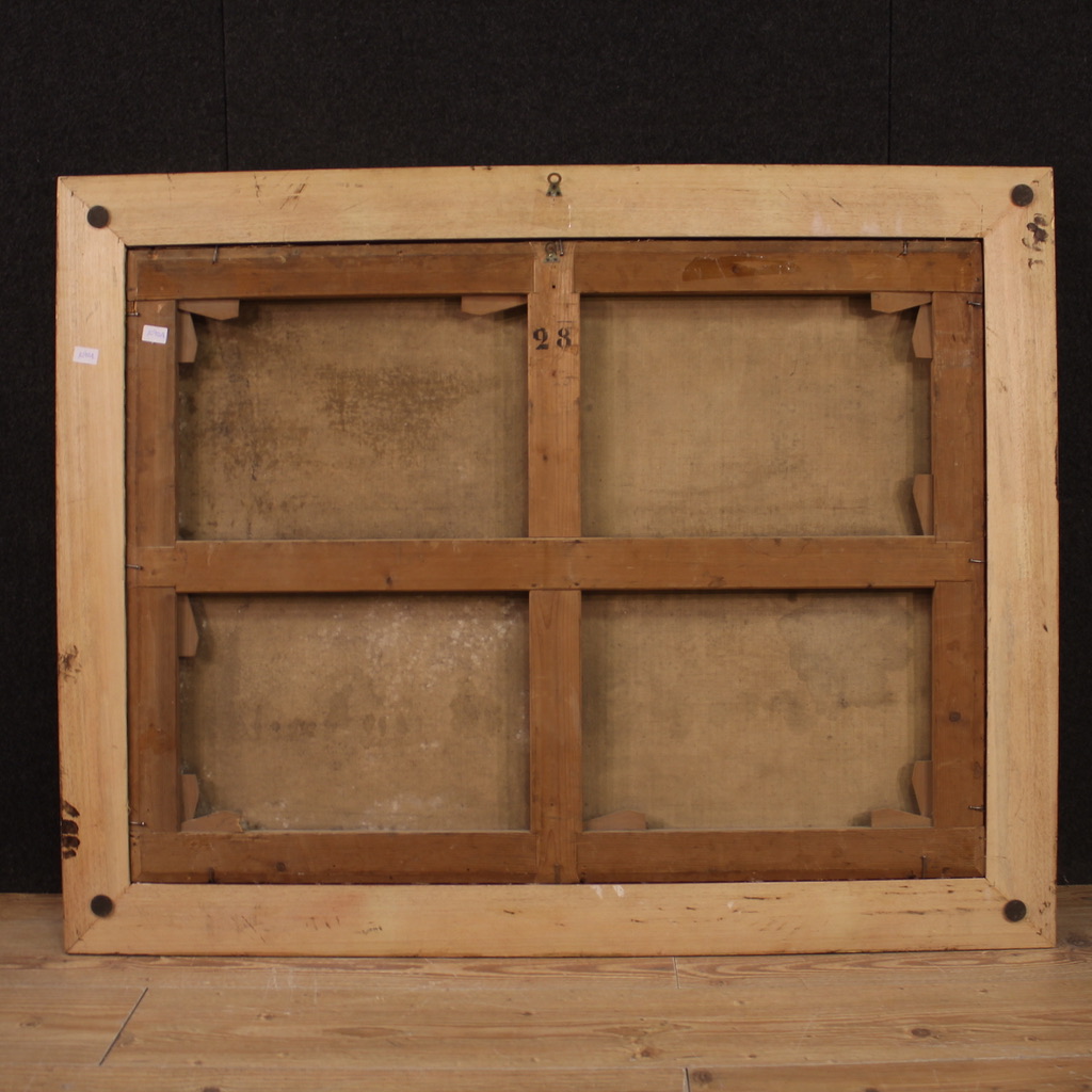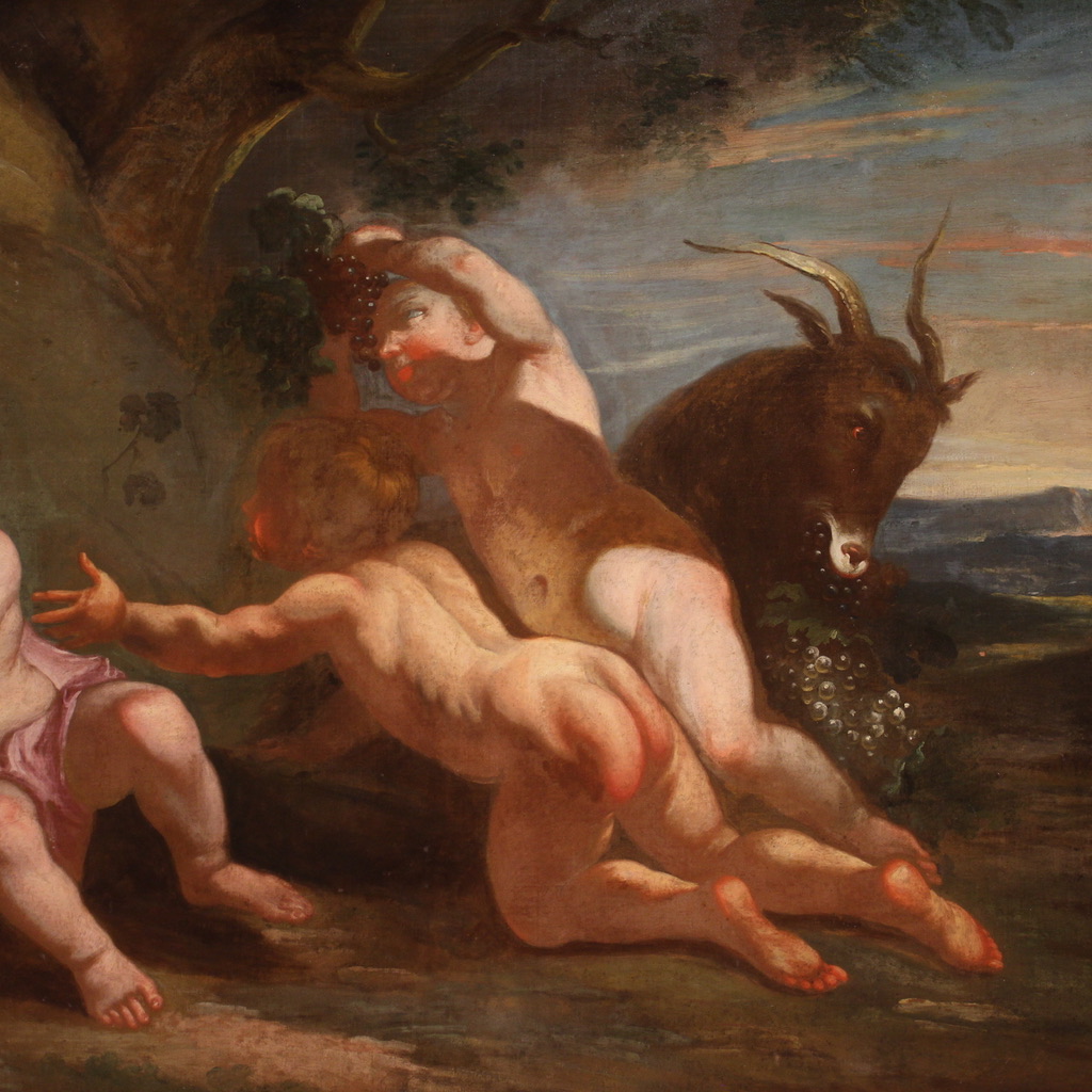 COD: 10701Antique Italian painting from the 17th century. Oil on canvas artwork of the Neapolitan school depicting Bacchanal of cherubs of excellent pictorial quality. Painting of great size and impact adorned with a modern lacquered, gilded and painted wooden frame with floral decorations. The quality of the complexion is remarkable which, thanks to the use of chiaroscuro, gives volume and plasticity to the characters (see photo). A cherub slips away with the bowl containing wine on the left, the central cherub leans towards him while the one on the right is portrayed in the gesture of picking a bunch of grapes next to a goat. Painting of great pleasure and joy, easy setting. Painting that has undergone a conservative restoration, relining, replacement of the stretcher and color recovery in some places (see photo). Artwork in good condition. Sight size H 85 x W 115 cm.