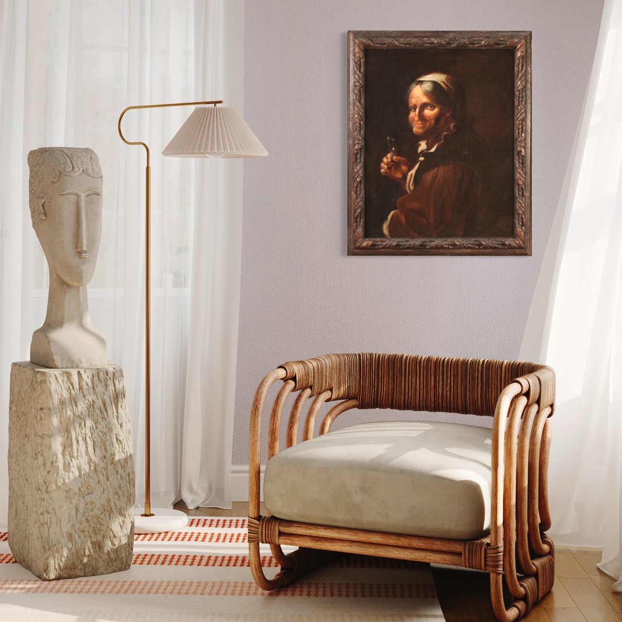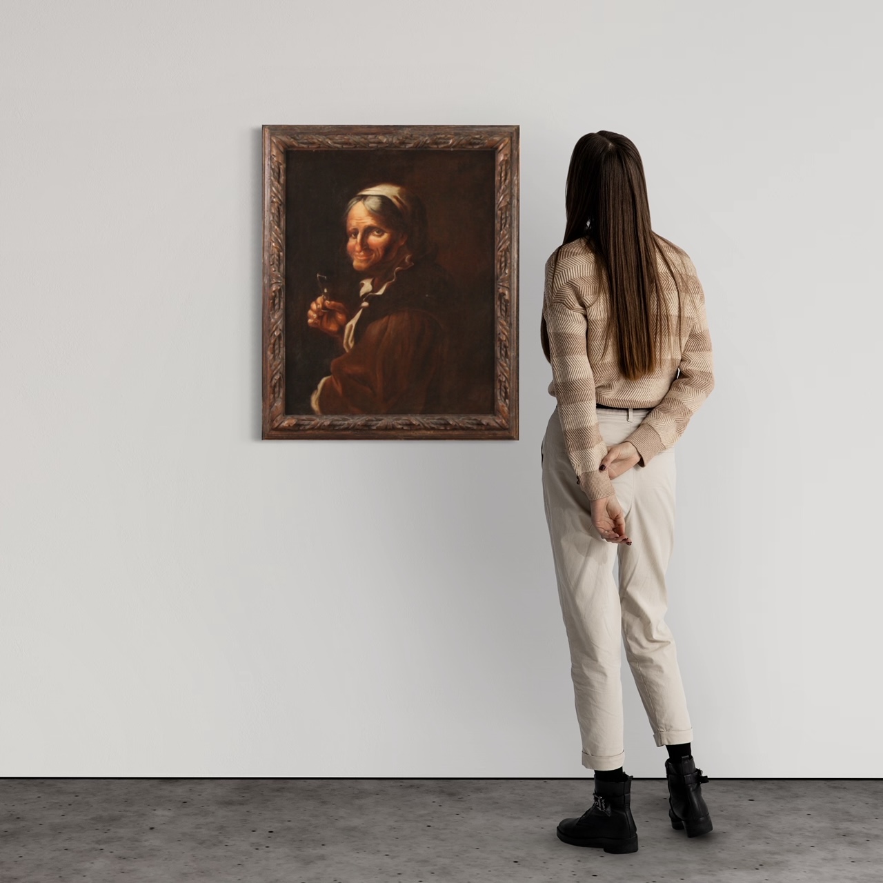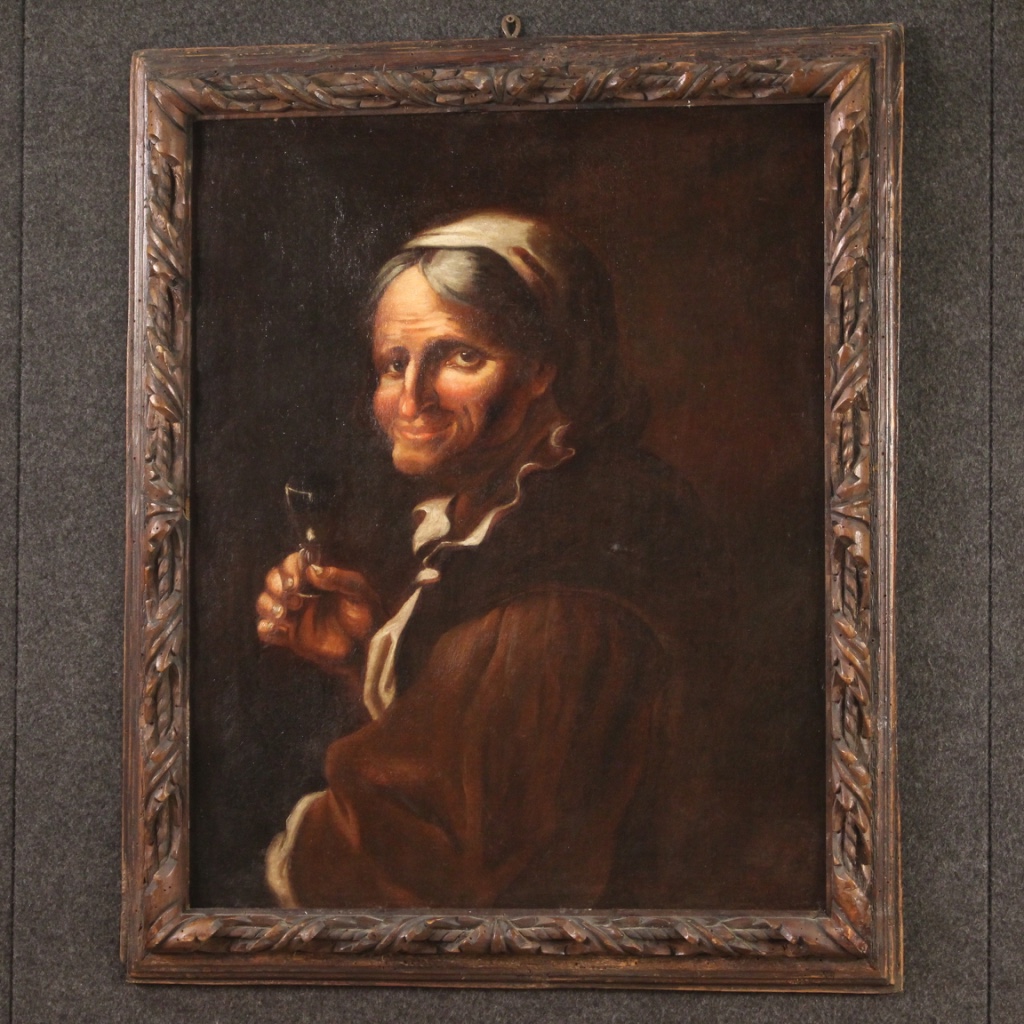 cod. 10245Antique Lombard / Venetian painting from 17th century. Artwork oil on canvas depicting a portrait, a grotesque character in a tavern with a glass of excellent pictorial quality. Painting of good size and proportion adorned with a non-coeval wooden frame, pleasantly sculpted, with some small signs of aging (see photo). Painting of great character, note the hand of the character clearly inspired by Caravaggio and the excellent transparency of the glass, a work for antique dealers, interior decorators and collectors of high-epoch Italian painting. Painting that has undergone a conservative restoration, relining, replacement of the frame and color recovery in some points (see photo). Overall in good condition with some small signs of aging. Sight size H 72 x W 58 cm.