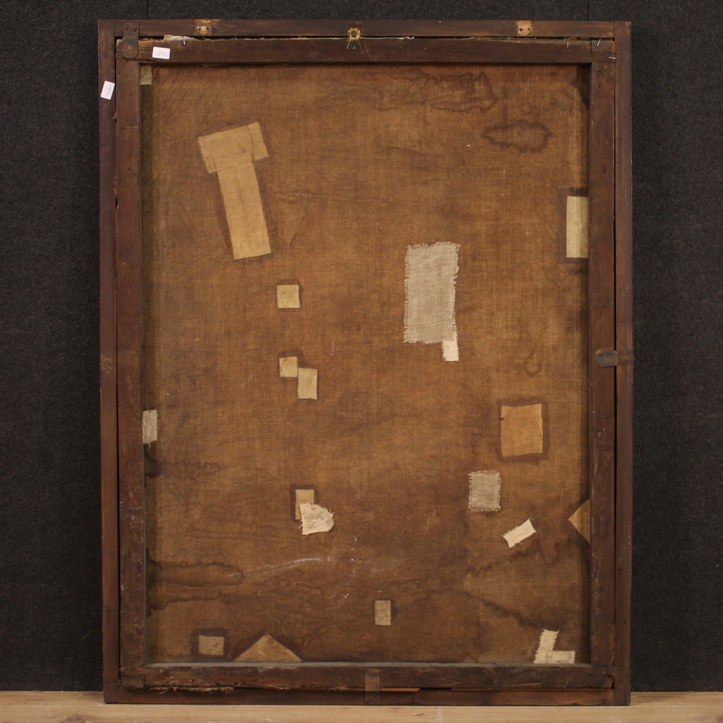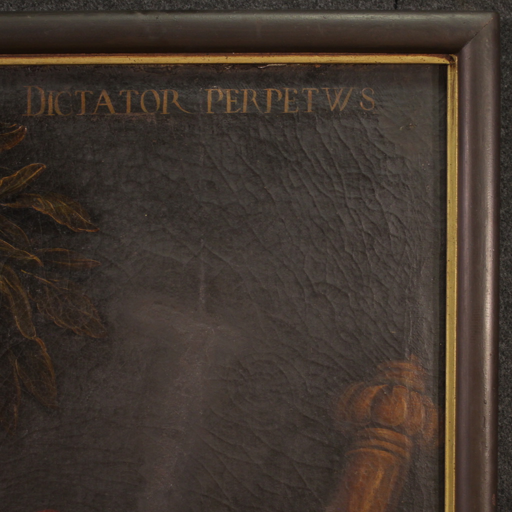 Great Italian painting from the first half of the 17th century. Oil on canvas artwork, first canvas, depicting a splendid portrait of Julius Caesar. The painting in question seems to be inspired by a successful series of portraits of Roman Emperors created by Tiziano Vecellio for Duke Federico II Gonzaga and which adorned the walls of the Ducal Palace in Mantua. These portraits were so successful that many painters, including Bernardino Campi, replicated them to meet the continuous demand of numerous patrons. Since the originals were sold to Charles I of England and then passed to the King of Spain and were destroyed in the fire of the Alcazar in 1734, it was thanks to Campi's replicas that Titian's works are known to us. Our painting depicts Julius Caesar with the typical symbols of the victorious general: a magnificently painted laurel wreath, a purple cloak, a scepter and a particular frieze representing Caesar's victory over the Gallic leader Vercingetorix with his beheading. It also has an inscription at the top Iulius Caes Rom-Imp-I Dictator Perpetws". A painting of notable pictorial quality and difficult to find, for antique dealers and collectors of high-period portraits. 20th century wooden frame in good condition and beautifully decorated. Work that has undergone restoration work with the closing of some tears and subsequent application of patches on the back and recovery of color in small spots (see photo). Overall in a beautiful patina and good state of conservation. Sight size H 130.5 x W 99 cm."