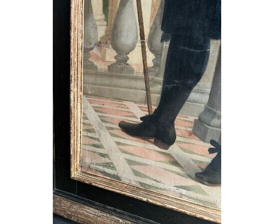 Il quadro è racchiuso in una cornice coeva in legno dorato e laccato nero, che ne valorizza ulteriormente la presenza scenica.