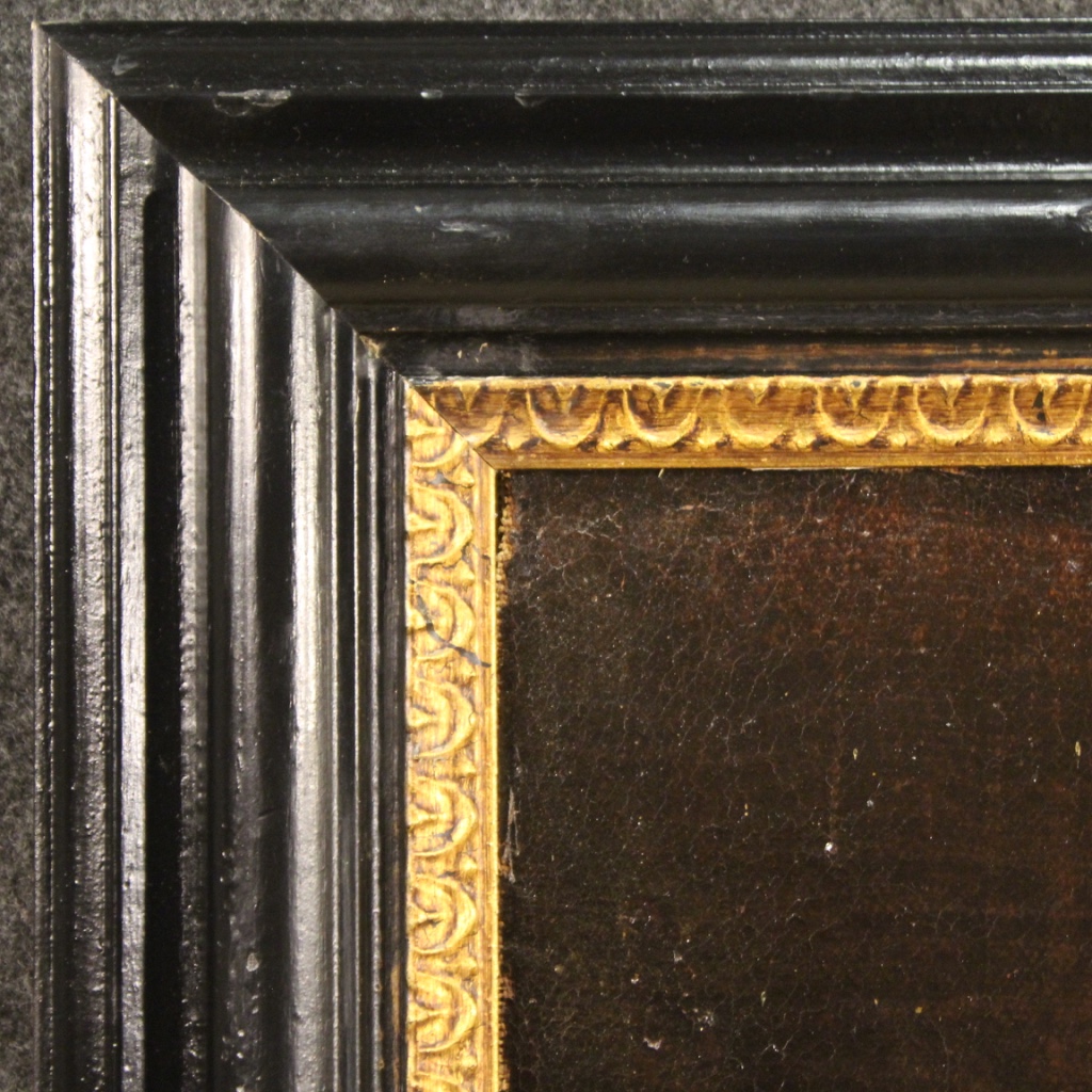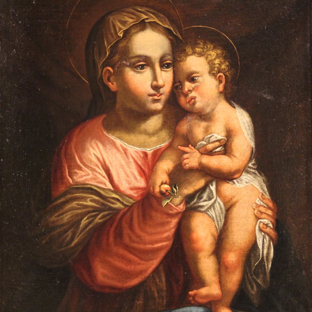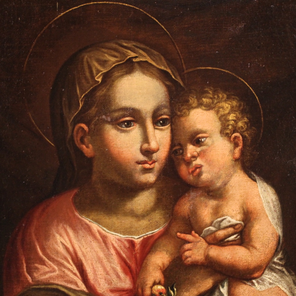 Antique Italian painting from the late 17th century. Framework oil on canvas depicting a religious subject Virgin with child of good pictorial quality. Framework of excellent proportion and quality finely represented in detail. Interesting is the presence of a fruit in the right hand of Jesus (see photo).