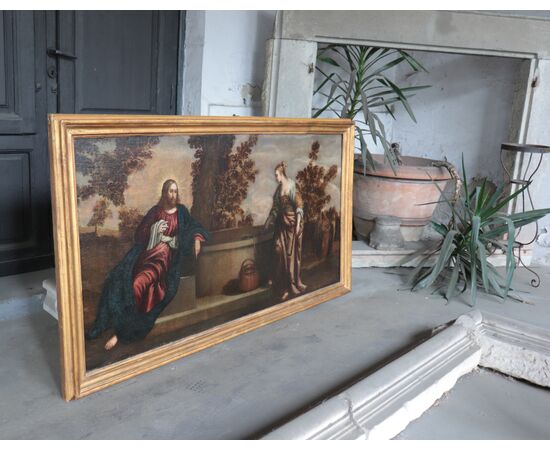 Dipinto ad olio su tela raffigurante "Cristo con la Samaratina al Pozzo"