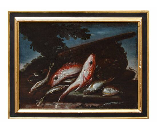 Il dipinto qui analizzato costituisce un'interessante testimonianza da affiancare alla migliore e tipica produzione realizzata da Elena Recco, come sottolineato nel libro Nature morte del Seicento e del Settecento (A cura di Patrizia Consigli Valente, Parma, 1987, pp. 10-11). La disposizione in primo piano dei pesci, attraverso un'abbondante costruzione, si ritrova in alcuni dei suoi più felici saggi. Nella composizione in analisi si riscontrano appieno le caratteristiche distintive della produzione della Recco: il piano d’appoggio contiene il pescato esposto, immerso in una smorzata ma diffusa luce proveniente dal paesaggio alle spalle. I pesci in primo piano, presentano i caratteri peculiari delle sue opere: le particolari tinte rosate, verdine e grigio azzurre delle squame, unite ad una sprizzante vitalità delle prede appena pescate, che brillano di riflessi argentei, denunciando la loro vitalità, espressa dalla lucentezza degli occhi, grandi ed aperti, e dalle contorsioni dei corpi.
