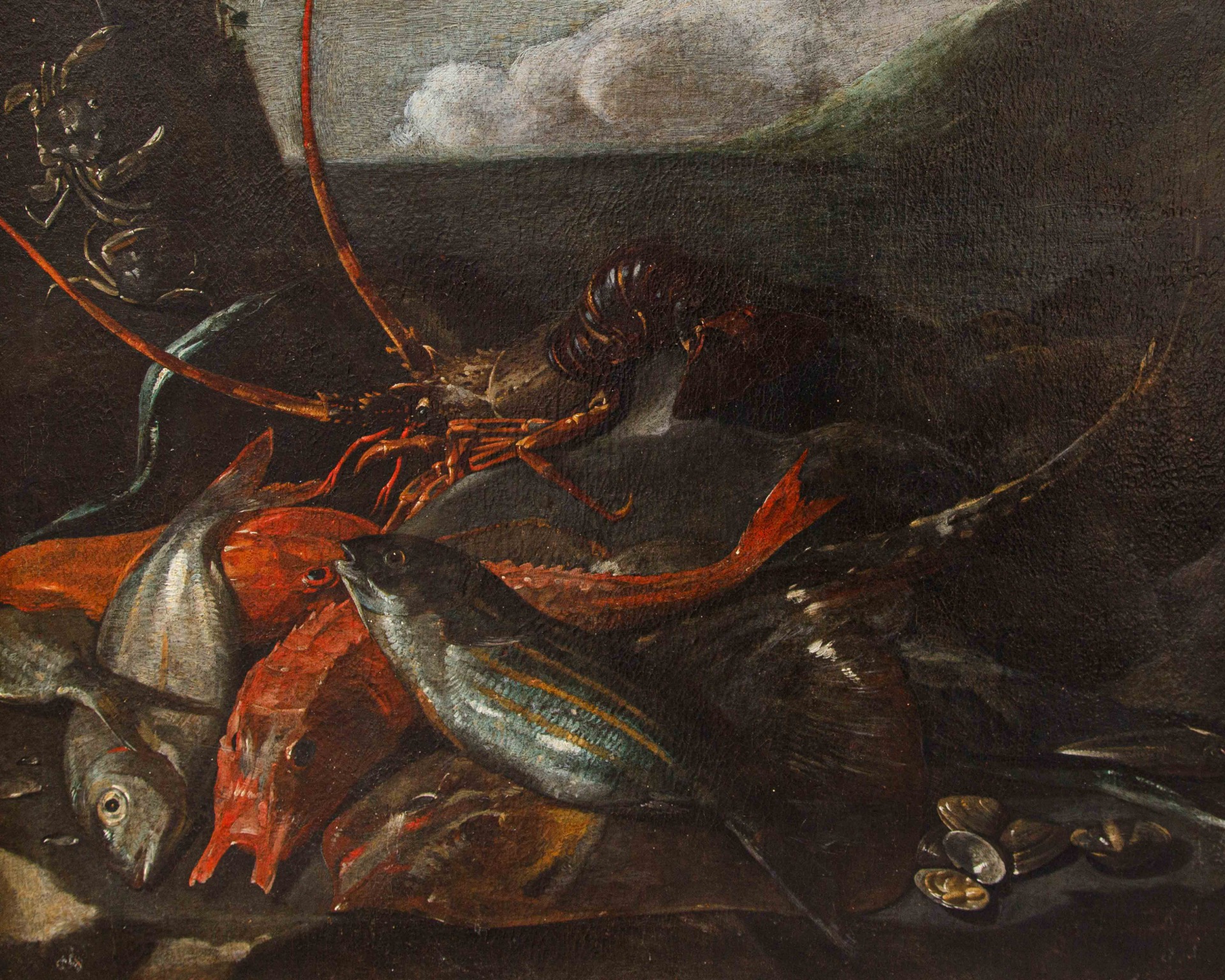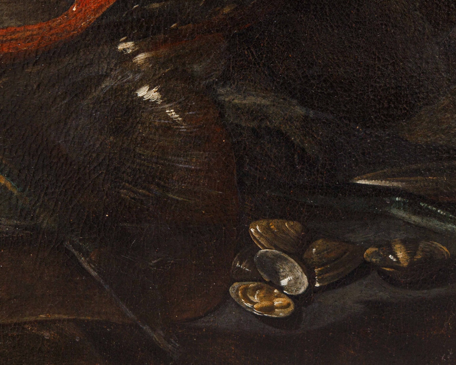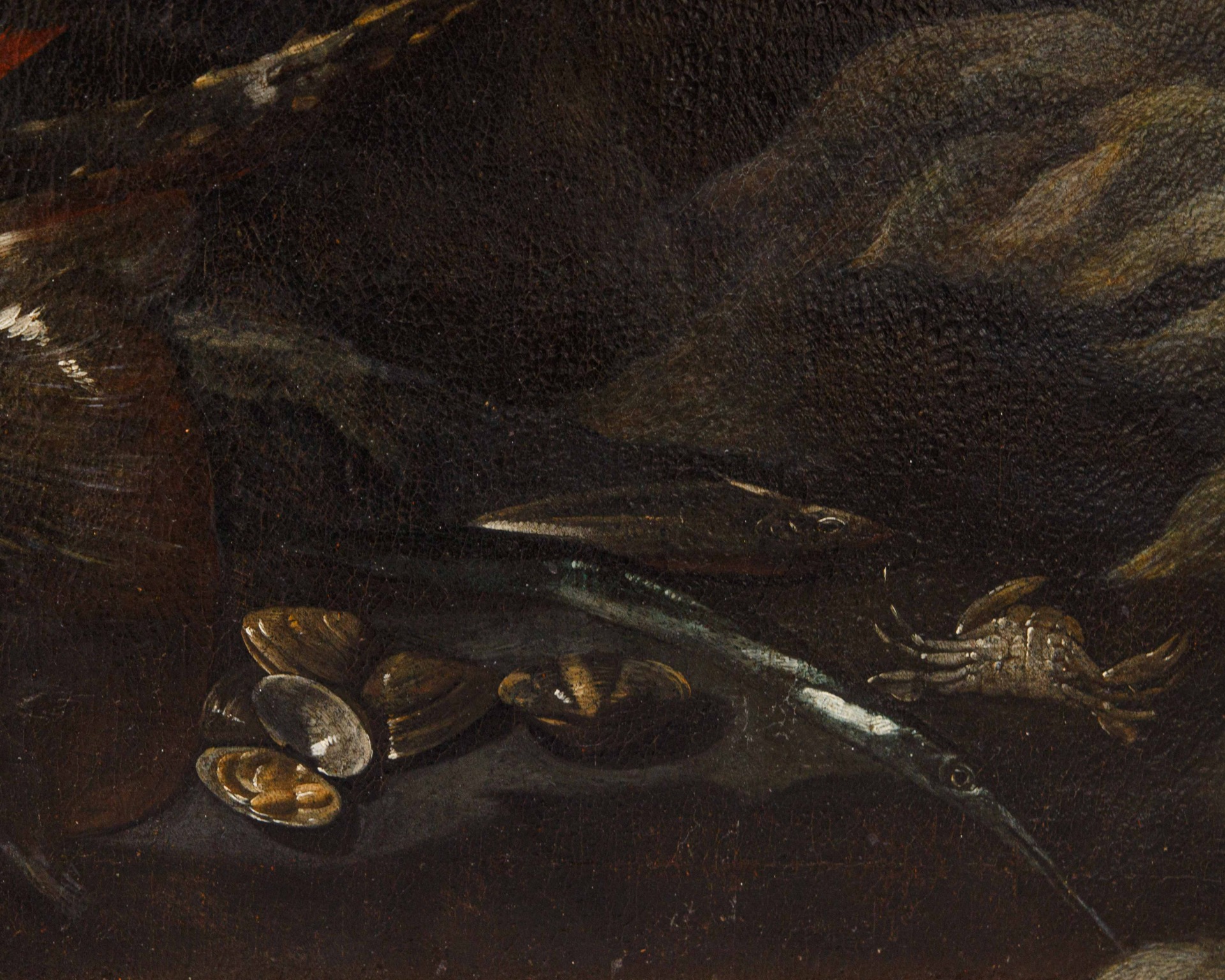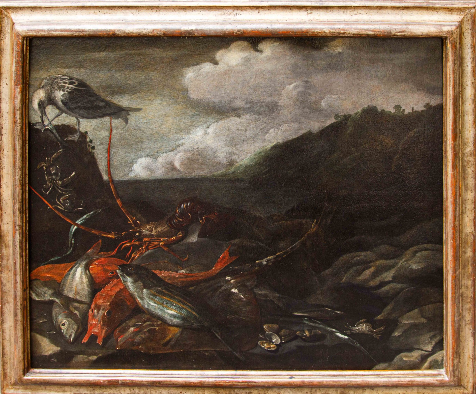 The still life presented here is part of the trend that developed in Naples during the seventeenth century and continued into the following century. Among the various subjects, such as flowers, food, fruits, or musical instruments, used and revisited over the decades by various exponents of the Neapolitan school, there were also paintings with a purely ichthyic theme, set in markets, fishmongers, or, as in this case, along coastal landscapes, thus further accentuating the realism already inherent in the genre through a plausible and concrete contextualization. In particular, among the many exponents of the genre present in the Neapolitan city, we find similarities and coincidences, especially from the point of view of the layout and arrangement of the various elements, with the production of Nicola Maria Recco, one of the twelve children of Giuseppe Recco (1634-1695), namely one of the most illustrious representatives of Neapolitan still life. Following in his father's footsteps, as did Elena, another daughter of Giuseppe, he specialized in still life, however developing a preference for representations of fish, crustaceans and molluscs, which abound in his production and of which the painting described here shows us a wide repertoire: the clams in the lower right, the gilt-head bream, the threadfin needlefish, the gurnards with warm and bright colors, the lobster still alive moving on the stones, the small crabs clinging to the rock where a young herring gull, as can be seen from the greyish plumage, holds its small prey in its beak. The iridescent colors of the fish stand out against a cloudy and dark background, along which unfolds a low rocky coast that ends with a steep promontory in the distance. The more blurred brushstrokes and the more approximate and vague contours of the landscape backdrop contrast with the minute details of the foreground, enhanced by the evident highlights on the scales of the fish or on the shells of the crabs, as is also noted, even with greater intensity, in the other fish-themed still lifes of the author. This particular arrangement, which leaves room for the landscape element, is found in the other works of Nicola Maria Recco, with fish and molluscs in the foreground, often placed to the side and not in the center, and behind them the marine landscape, rendered with a more generic clarity compared to the lenticular details of the still life. Although the information on the painter is less than that of his father, we know that he worked mostly in Naples and that he was able to collect his father's legacy in the choice of subjects and the pictorial genre, although in a more vibratile form through the iridescent and contrasting colors and the highlights; moreover, the clear choice of an outdoor setting, with glimpses that complete and expand the subject, defines his figure as a still life artist thanks to a compositional originality different and distinct from that of his father and contemporary colleagues active in the city.