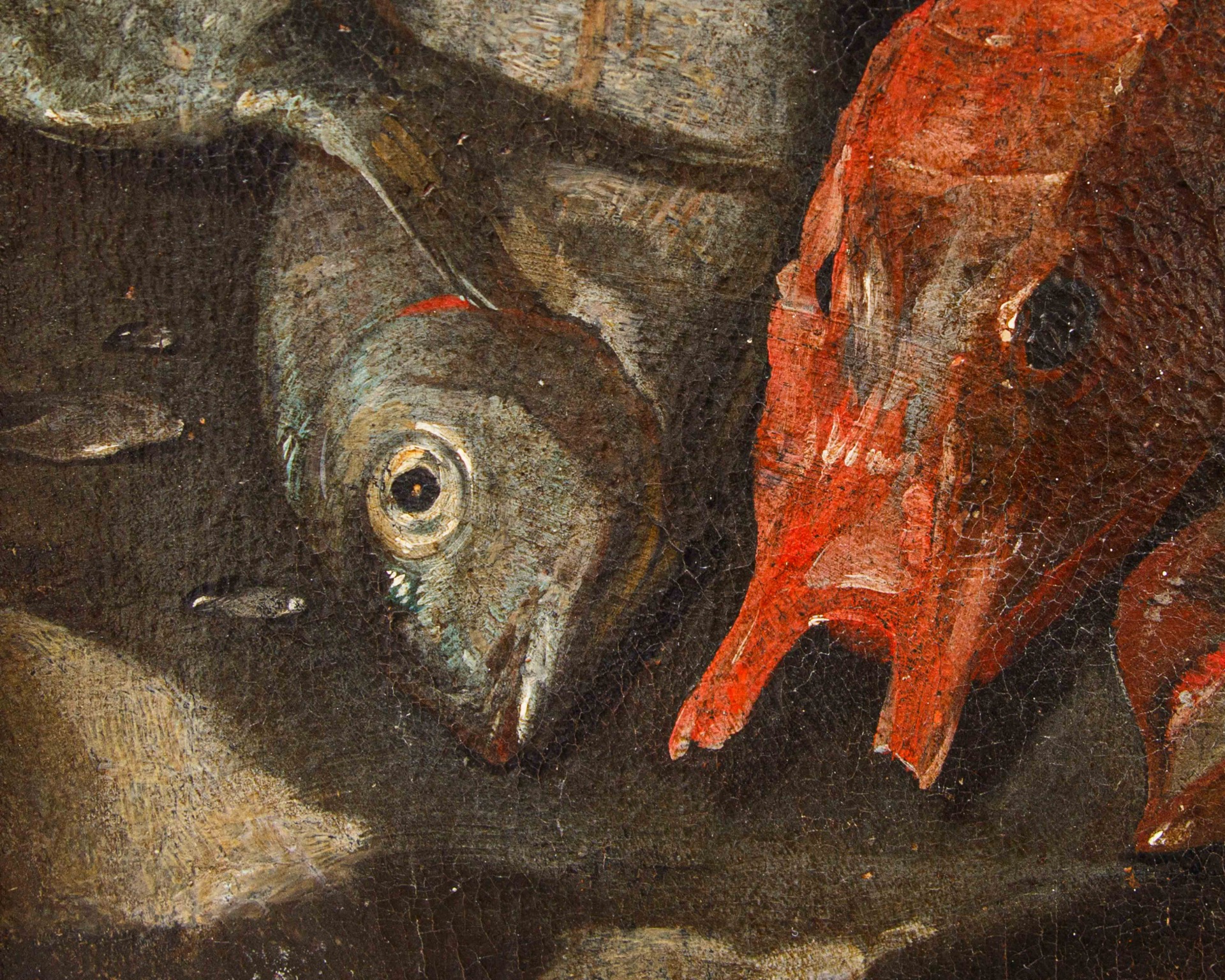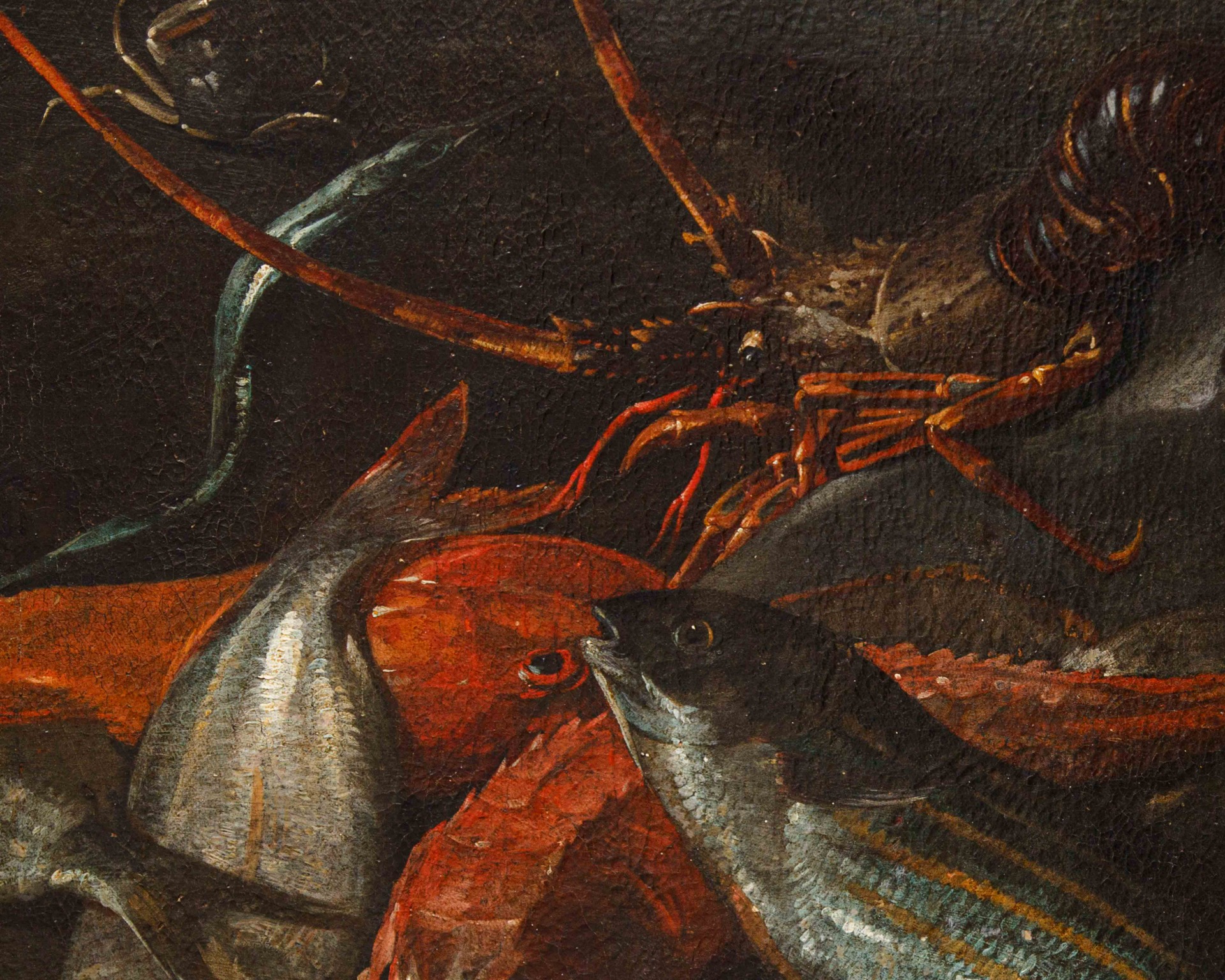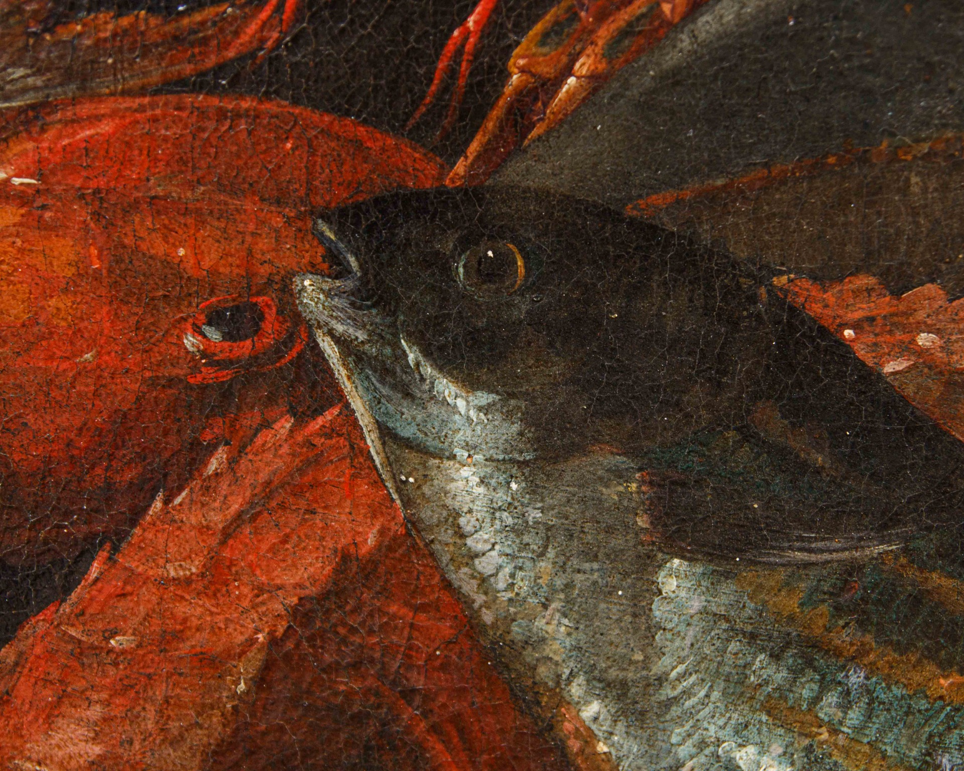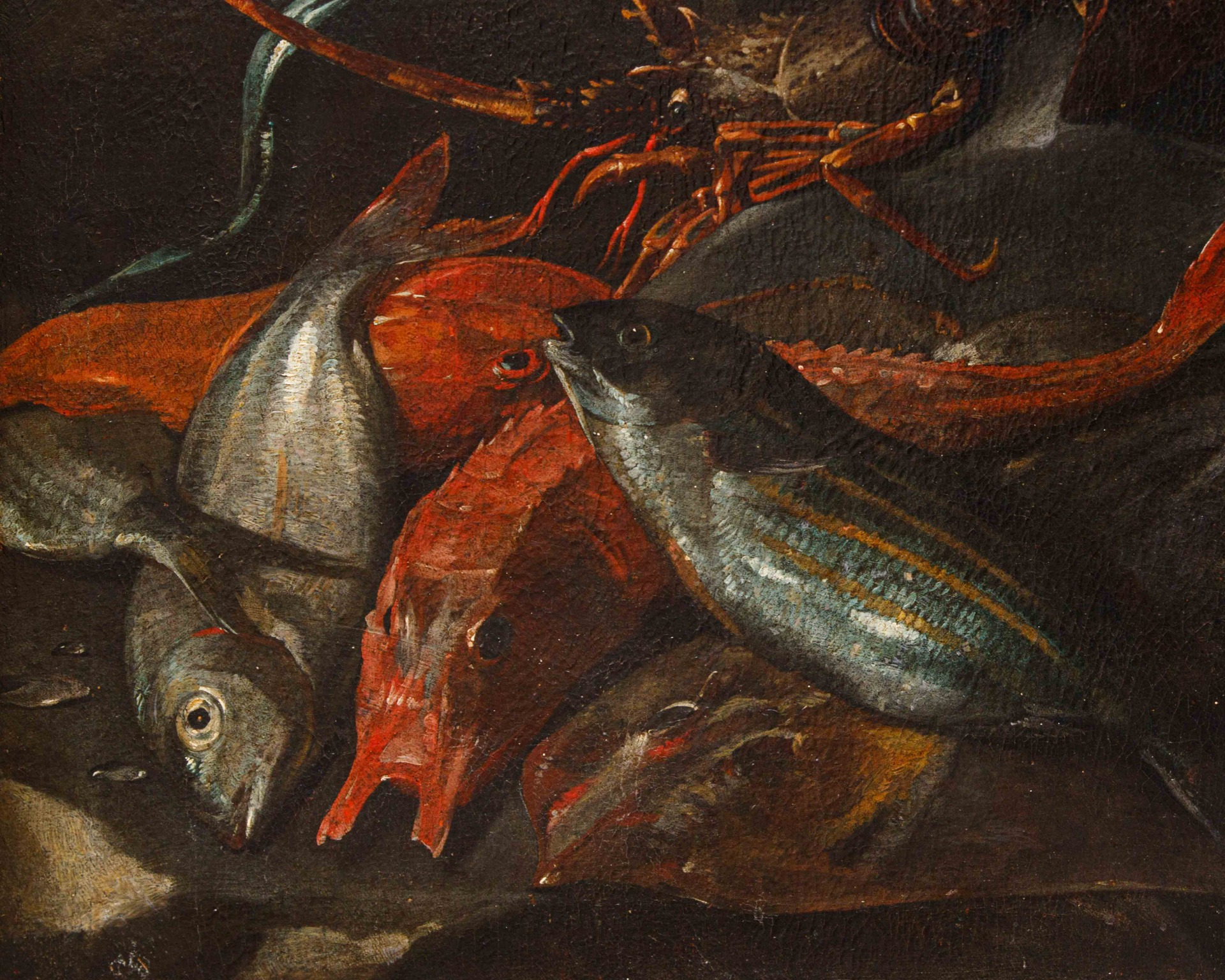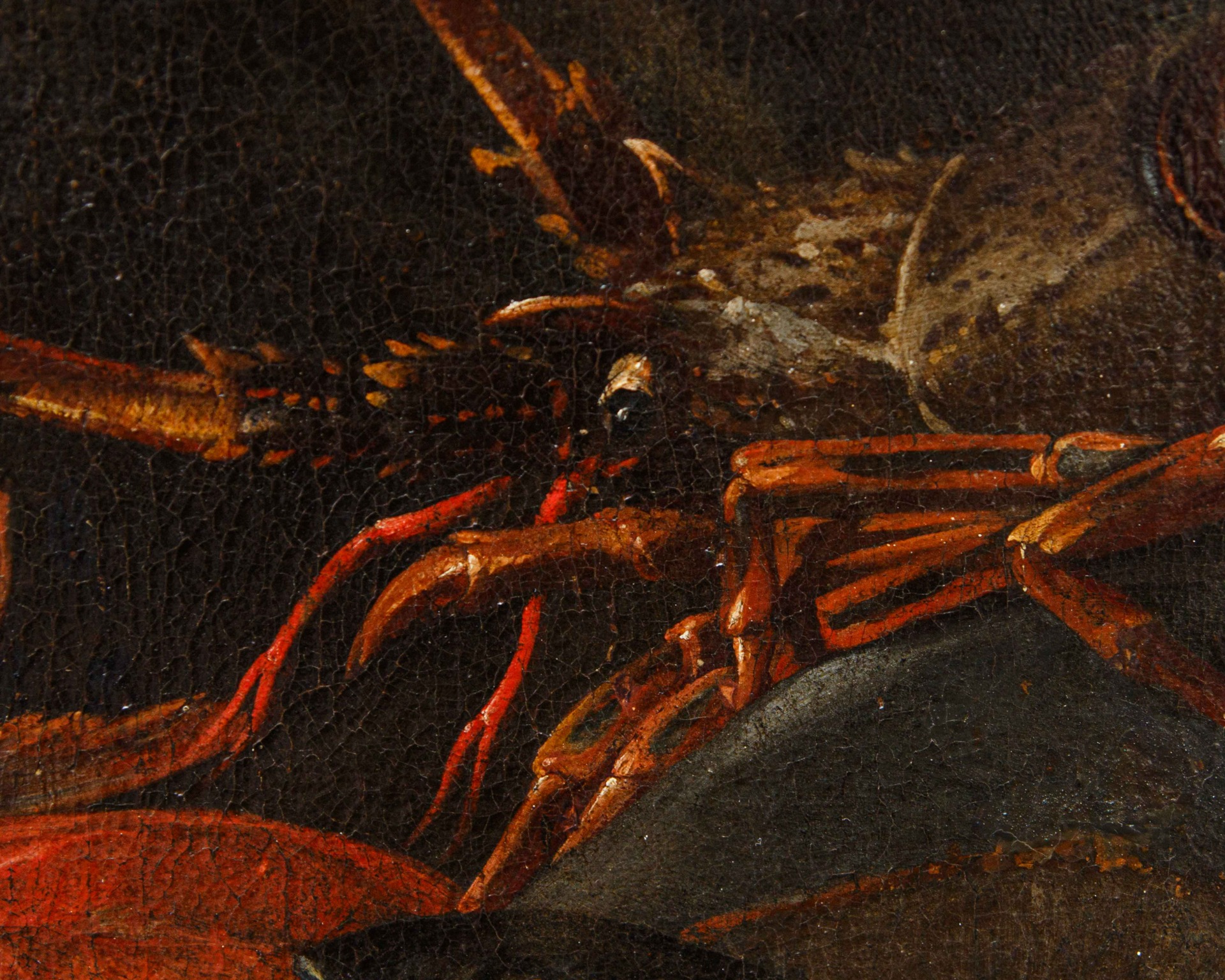 The still life presented here is part of the trend that developed in Naples during the seventeenth century and continued into the following century. Among the various subjects, such as flowers, food, fruits, or musical instruments, used and revisited over the decades by various exponents of the Neapolitan school, there were also paintings with a purely ichthyic theme, set in markets, fishmongers, or, as in this case, along coastal landscapes, thus further accentuating the realism already inherent in the genre through a plausible and concrete contextualization. In particular, among the many exponents of the genre present in the Neapolitan city, we find similarities and coincidences, especially from the point of view of the layout and arrangement of the various elements, with the production of Nicola Maria Recco, one of the twelve children of Giuseppe Recco (1634-1695), namely one of the most illustrious representatives of Neapolitan still life. Following in his father's footsteps, as did Elena, another daughter of Giuseppe, he specialized in still life, however developing a preference for representations of fish, crustaceans and molluscs, which abound in his production and of which the painting described here shows us a wide repertoire: the clams in the lower right, the gilt-head bream, the threadfin needlefish, the gurnards with warm and bright colors, the lobster still alive moving on the stones, the small crabs clinging to the rock where a young herring gull, as can be seen from the greyish plumage, holds its small prey in its beak. The iridescent colors of the fish stand out against a cloudy and dark background, along which unfolds a low rocky coast that ends with a steep promontory in the distance. The more blurred brushstrokes and the more approximate and vague contours of the landscape backdrop contrast with the minute details of the foreground, enhanced by the evident highlights on the scales of the fish or on the shells of the crabs, as is also noted, even with greater intensity, in the other fish-themed still lifes of the author. This particular arrangement, which leaves room for the landscape element, is found in the other works of Nicola Maria Recco, with fish and molluscs in the foreground, often placed to the side and not in the center, and behind them the marine landscape, rendered with a more generic clarity compared to the lenticular details of the still life. Although the information on the painter is less than that of his father, we know that he worked mostly in Naples and that he was able to collect his father's legacy in the choice of subjects and the pictorial genre, although in a more vibratile form through the iridescent and contrasting colors and the highlights; moreover, the clear choice of an outdoor setting, with glimpses that complete and expand the subject, defines his figure as a still life artist thanks to a compositional originality different and distinct from that of his father and contemporary colleagues active in the city.