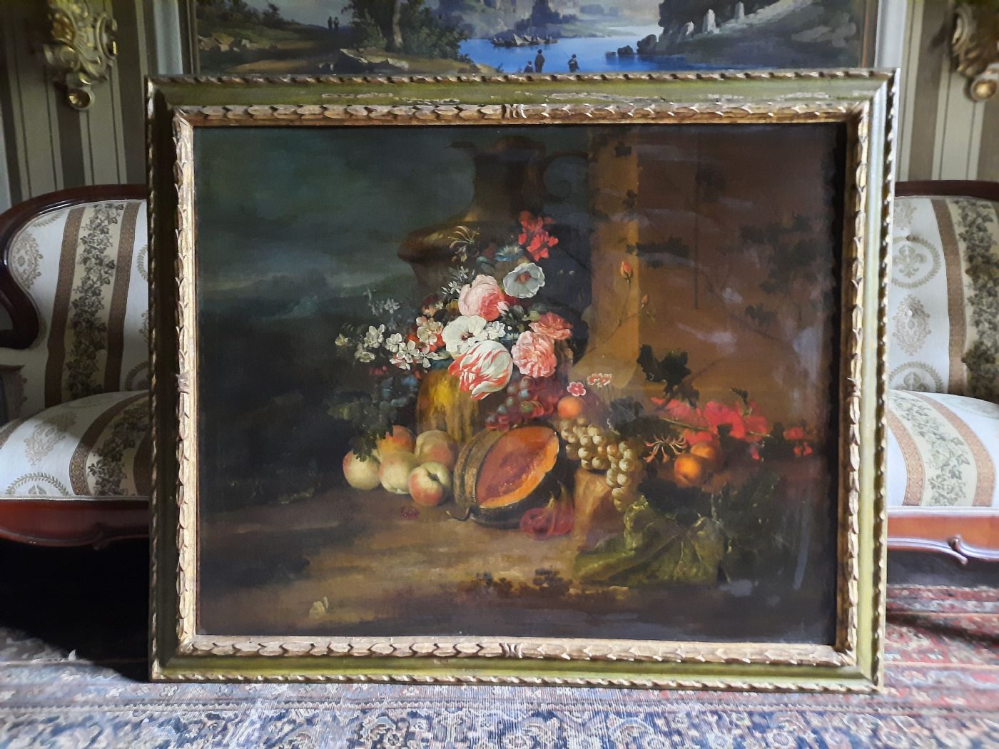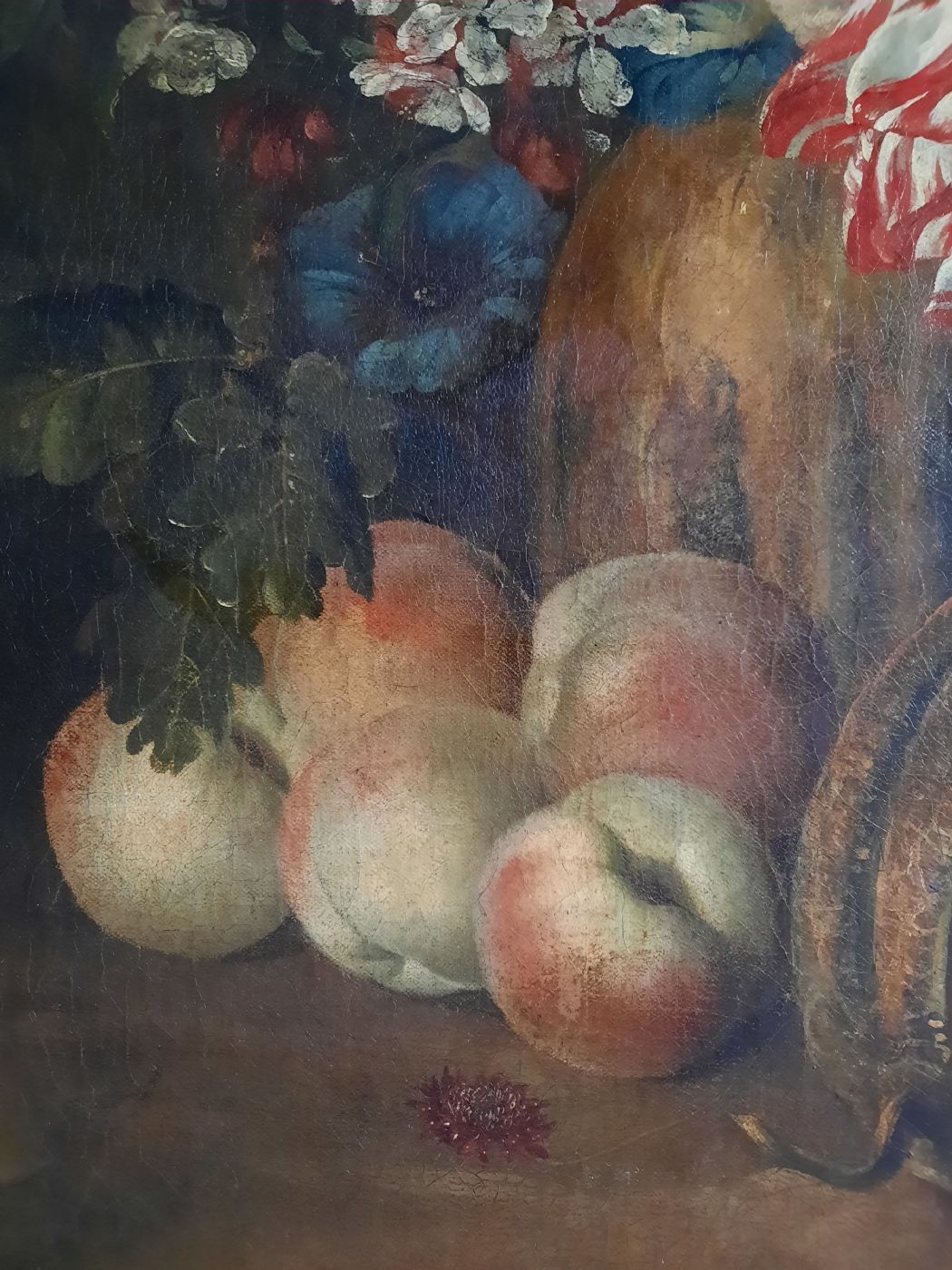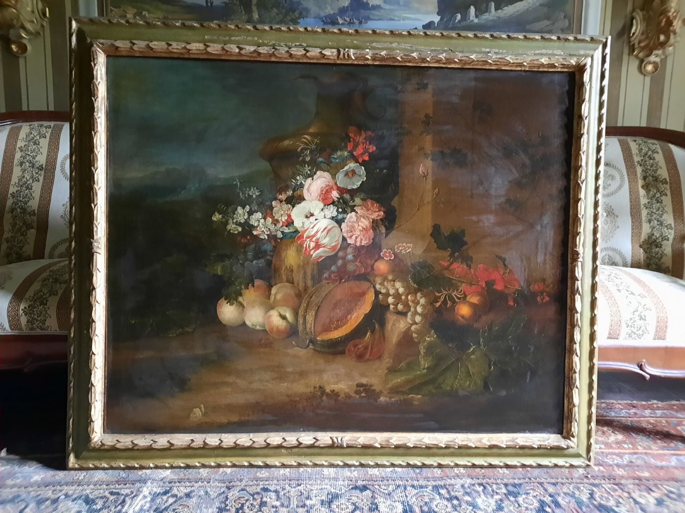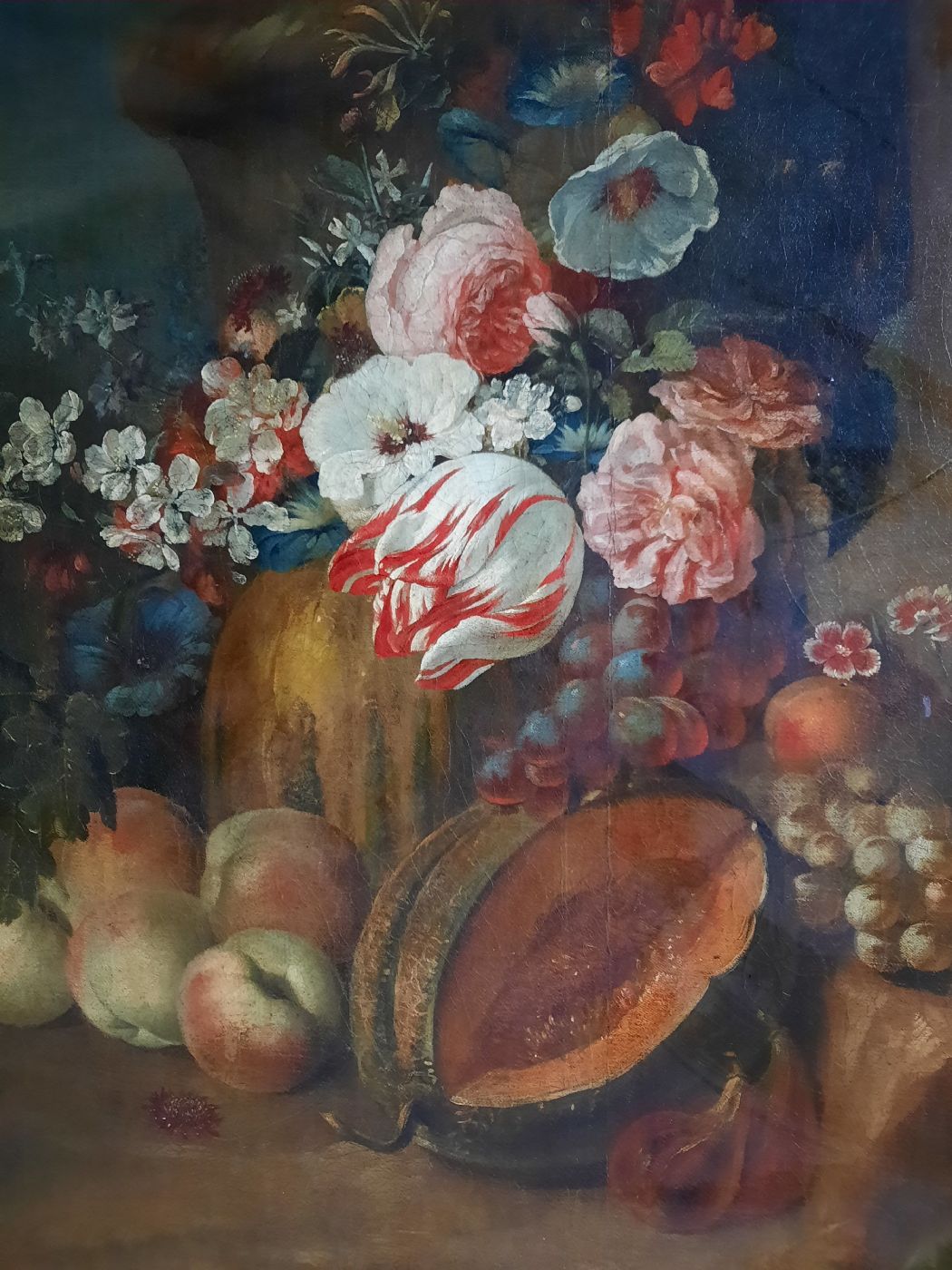 Importante natura morta di fiori e frutti del maestro Felice Boselli (Piacenza 1650 - Parma 1732). Olio su tela rintelato, pronto da appendere.
