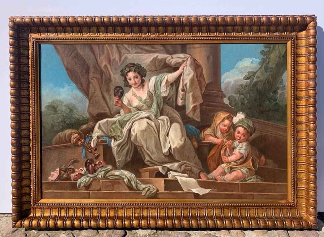 Charles-André van Loo (Nice 1705 - Paris 1765) attrib. to - Allegory of Comedy. 54 x 83 cm without frame, 70.5 x 99.5 cm with frame. Antique oil on canvas painting, in carved and gilded wooden frame. Condition report: Original canvas. Good condition of the painted surface. - All shipments within the EU are free and professionally packed. - Each item is sold with a certificate of authenticity with legal validity. - Further details on the condition report are available upon request. - Viezzi Arte guarantees quality and professionalism at competitive prices, contact us at info@viezziarte.it or via WhatsApp at +39 3402841279. *Message to non-Italian buyers: Please note that this work has not yet obtained the export license from Italy from the Superintendency of Cultural Heritage. This document certifies that the work is not part of Italian cultural heritage. Normally the release times for the certificates are 40 days from the date of the appointment: The new legislation in force since 2021 provides, for amounts declared less than €13,500, shorter times at the discretion of the commission of experts. All costs of this operation are included.