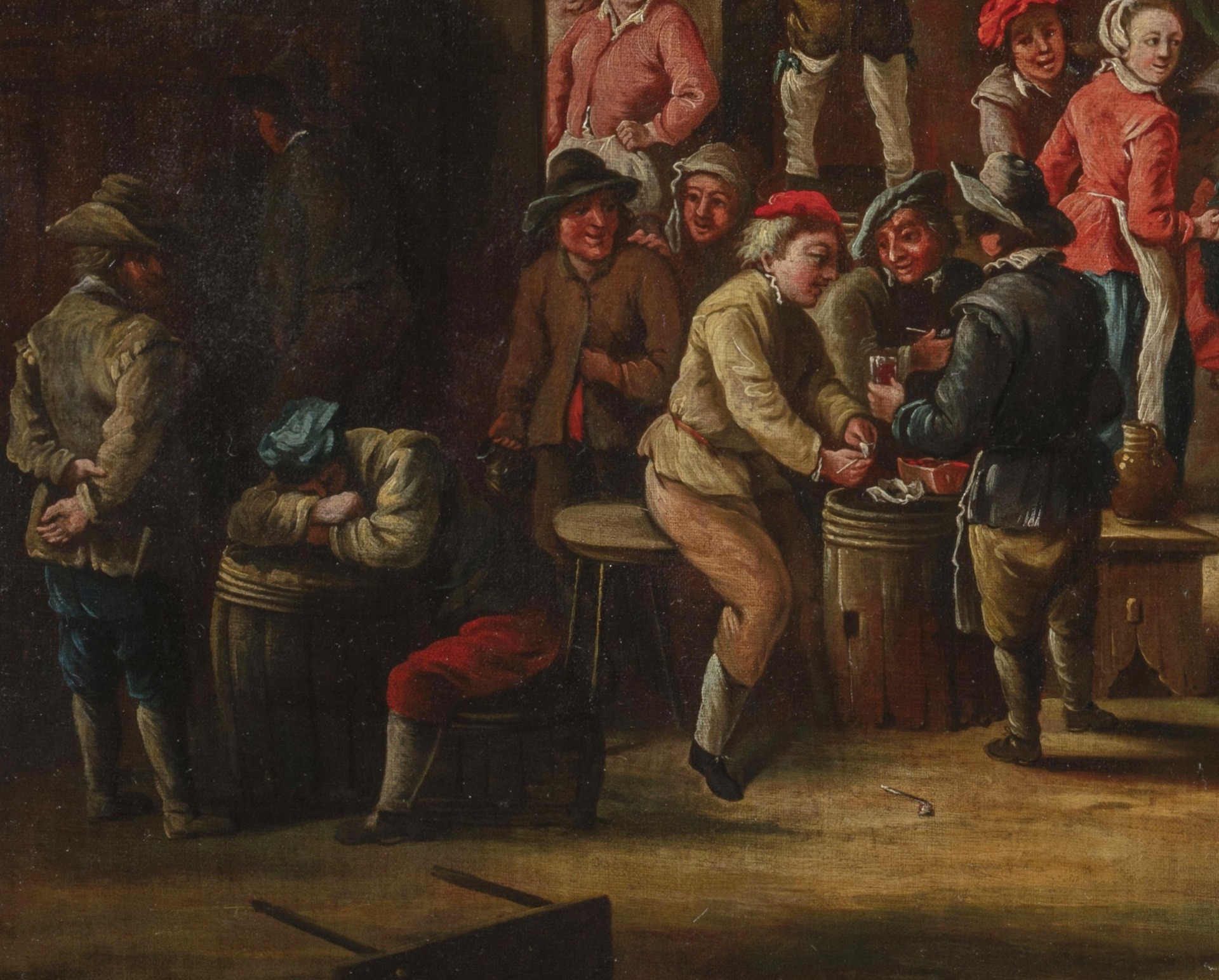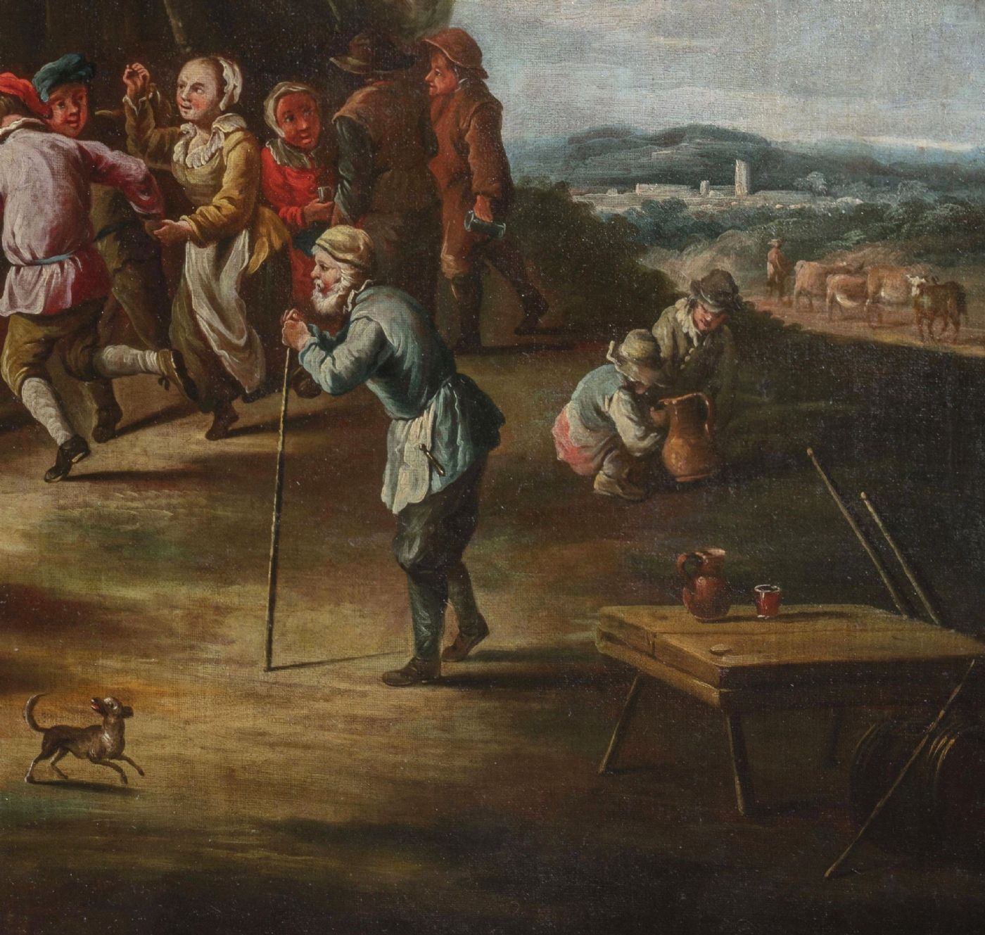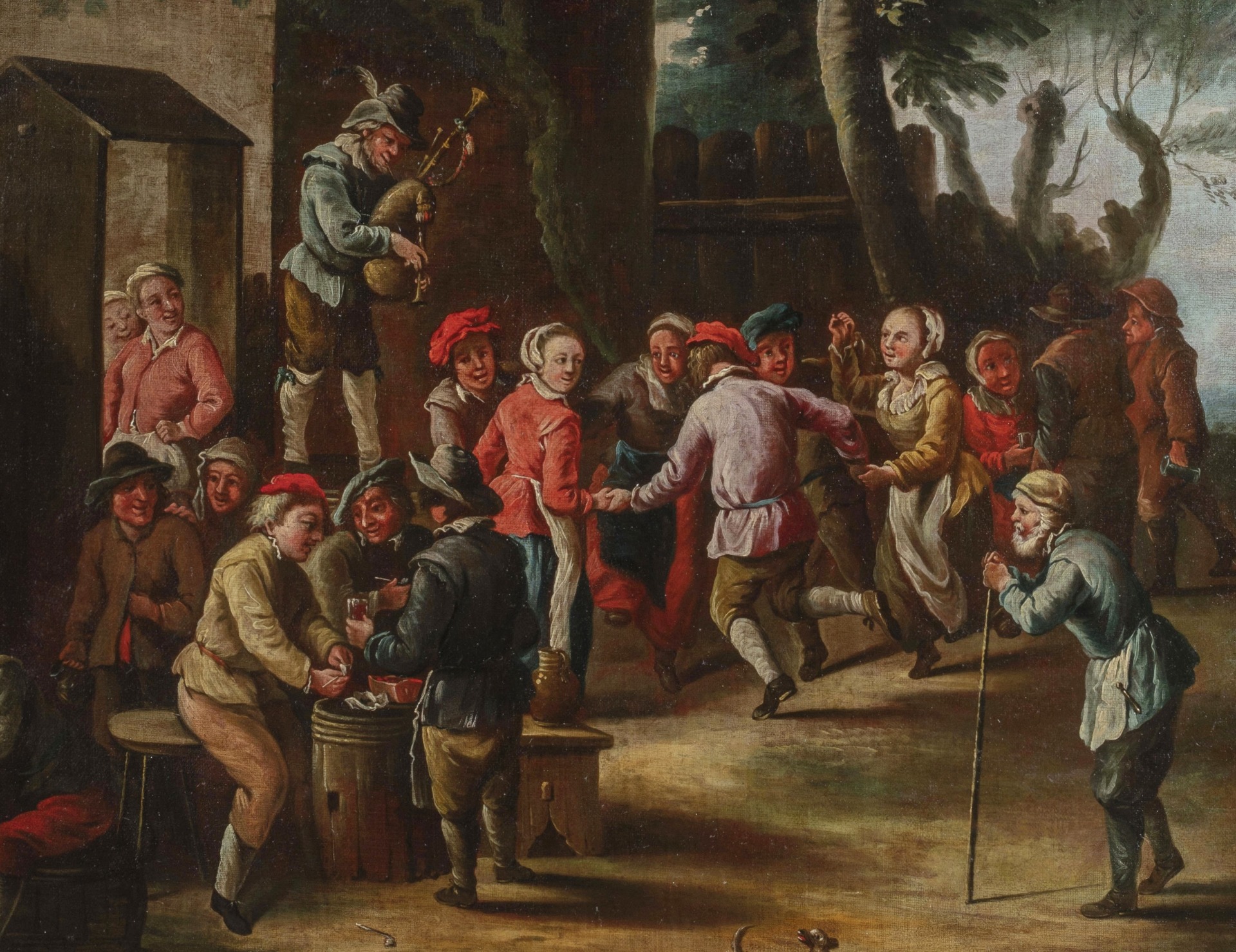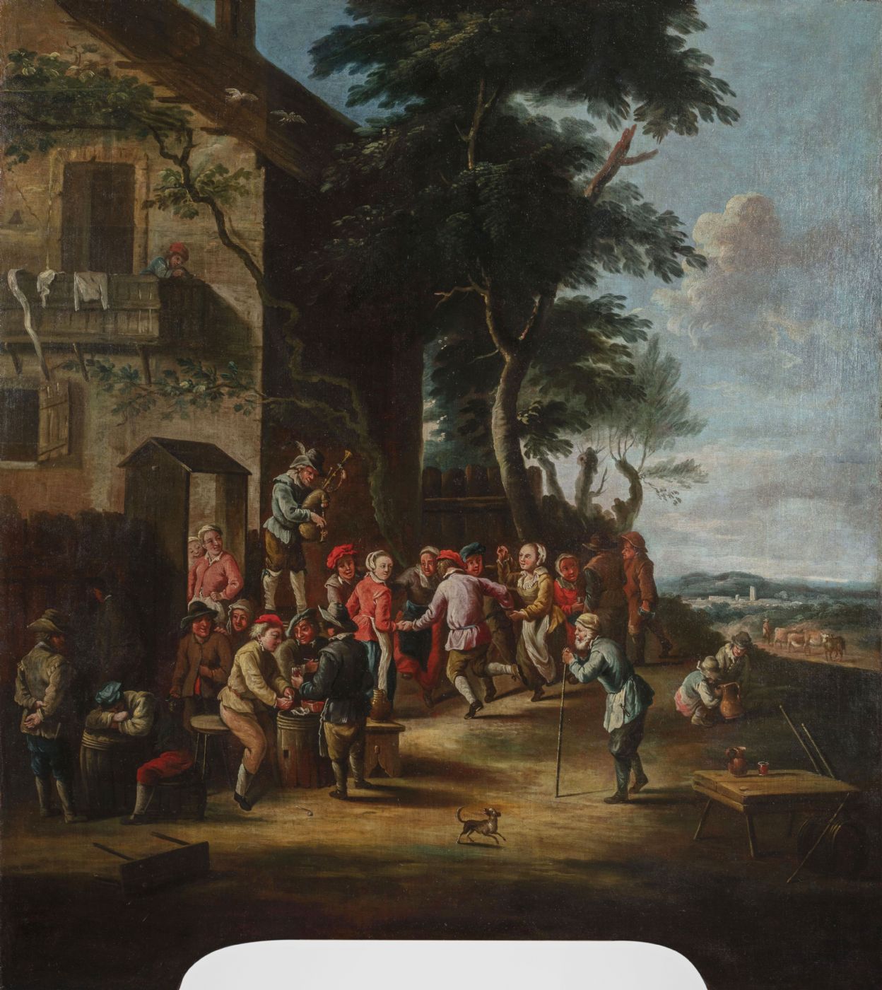 The painting, executed in oil on canvas, depicts a festive moment where some peasants or commoners dance and drink in front of a tavern. The style and quality indicate the authorship of a well-known Piedmontese "bambocciante": Giovanni Michele Graneri, one of the protagonists of the fertile Savoy season of this pictorial genre. For a time, Graneri was parallel to and then a continuator of the work of the head of the school, Pietro Domenico Ollivero, of whom, according to contemporary sources, he was a pupil. The depicted characters, such as the group of dancers in a circle, the old man with the stick, the bassoon player, the drunken peasant sleeping on the barrel, and some observers looking out from the doors, windows, or balconies, are characteristic of this type of representation, which is defined as "bambocciata". The "bambocciata" is a genre of painting aimed at representing, with figurative liveliness and with animated effects of light and color, popular scenes of streets, taverns, markets, gypsies, in open contrast with the grand official Baroque painting. It spread widely throughout the eighteenth century, and in Piedmont, among the major exponents, we remember Pietro Domenico Ollivero (Turin, 1679 - 1755) and Giovanni Michele Graneri (Turin, 1708-1762). The concave shape on the lower side of the frame suggests that the canvas was originally placed in a boiserie in the grand rooms of a noble palace.