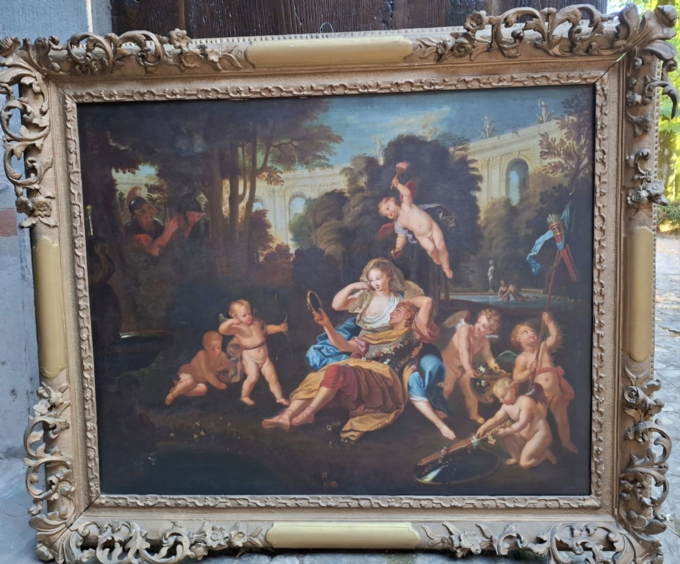 Splendido e raffinato olio su tela del Settecento, di gusto rococò, che ritrae una scena mitologica dal fascino intramontabile. Al centro, una dama nobile dall’eleganza classica è circondata da vivaci putti alati, in un’atmosfera festosa che celebra amore e bellezza. Sullo sfondo, un paesaggio architettonico con arcate monumentali incornicia la composizione, donando profondità e suggestione. La tavolozza luminosa e la resa teatrale delle figure testimoniano la mano di un abile pittore del periodo, capace di coniugare grazia narrativa e ricchezza cromatica. Il dipinto è arricchito da una vecchia cornice in legno intagliato e dorato, di grande impatto decorativo, che valorizza ulteriormente l’opera. Un pezzo da collezione ideale per amatori d’arte antica e arredi d’epoca, capace di impreziosire qualsiasi ambiente con eleganza aristocratica.
