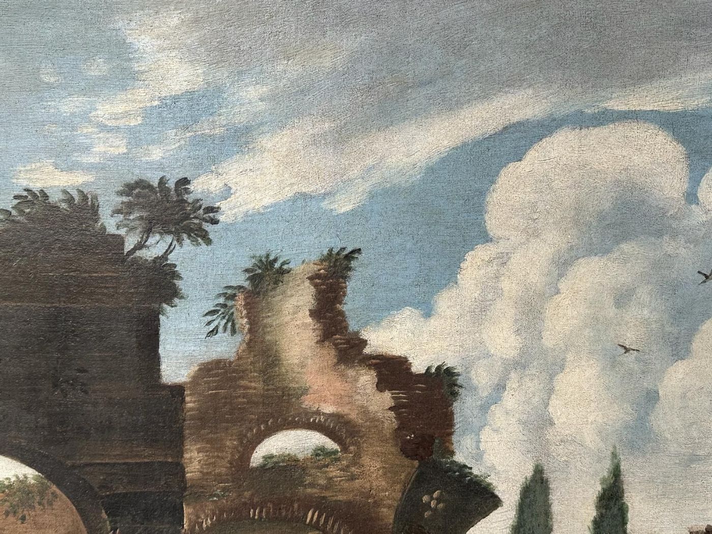 Grande dipinto olio su tela rintelato da appendere. Pittore Romano seguace del Cerquozzi per questo spendido dipinto in perfetto stato di conservazione, che appare immacolato, senza neppure un ritocco alla lampada. Misure dipinto: cm 148x99h Misure in cornice dorata successiva: cm 161x112h
