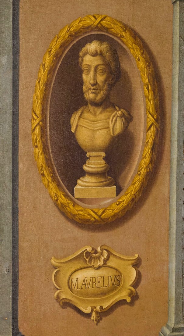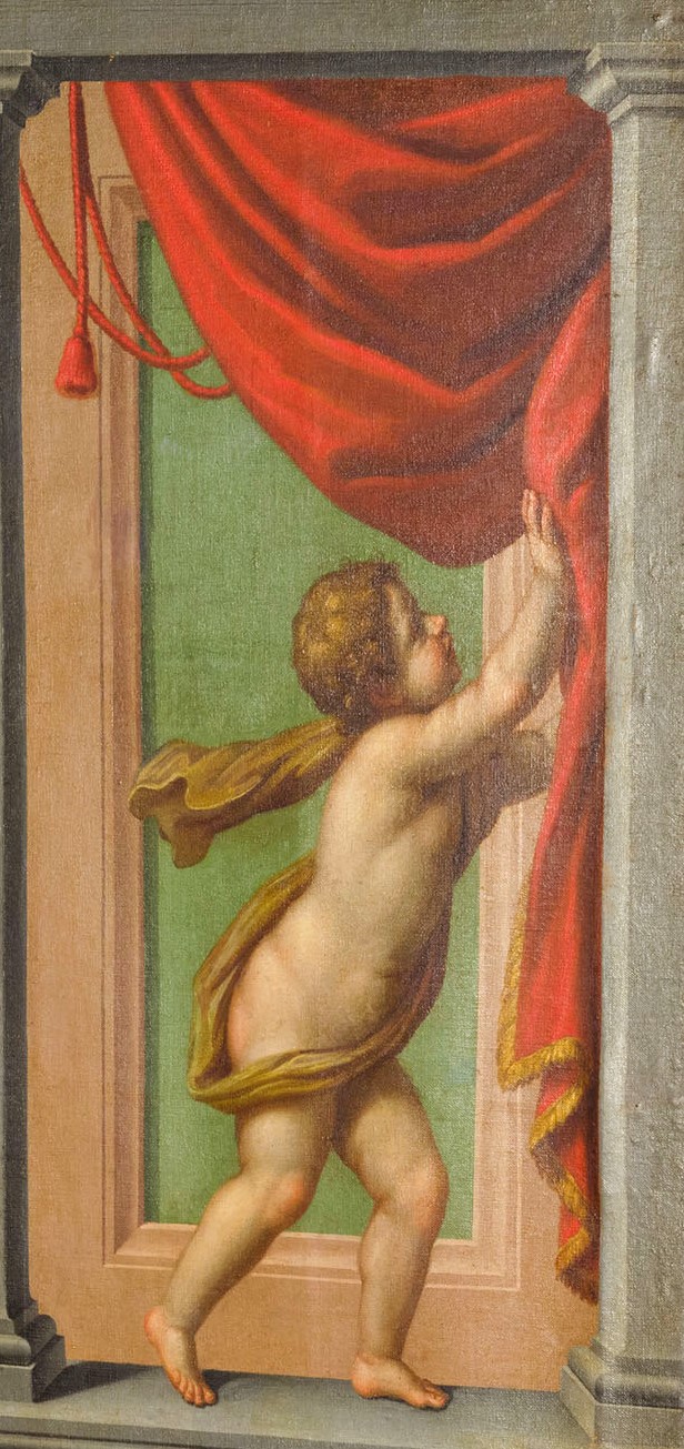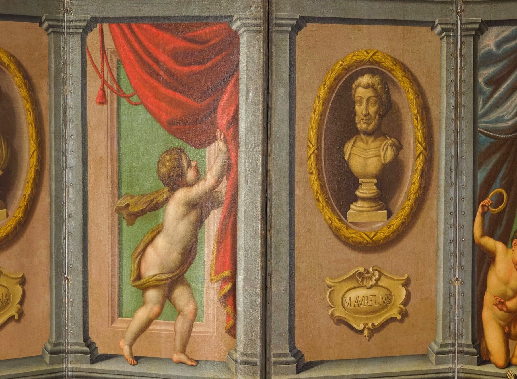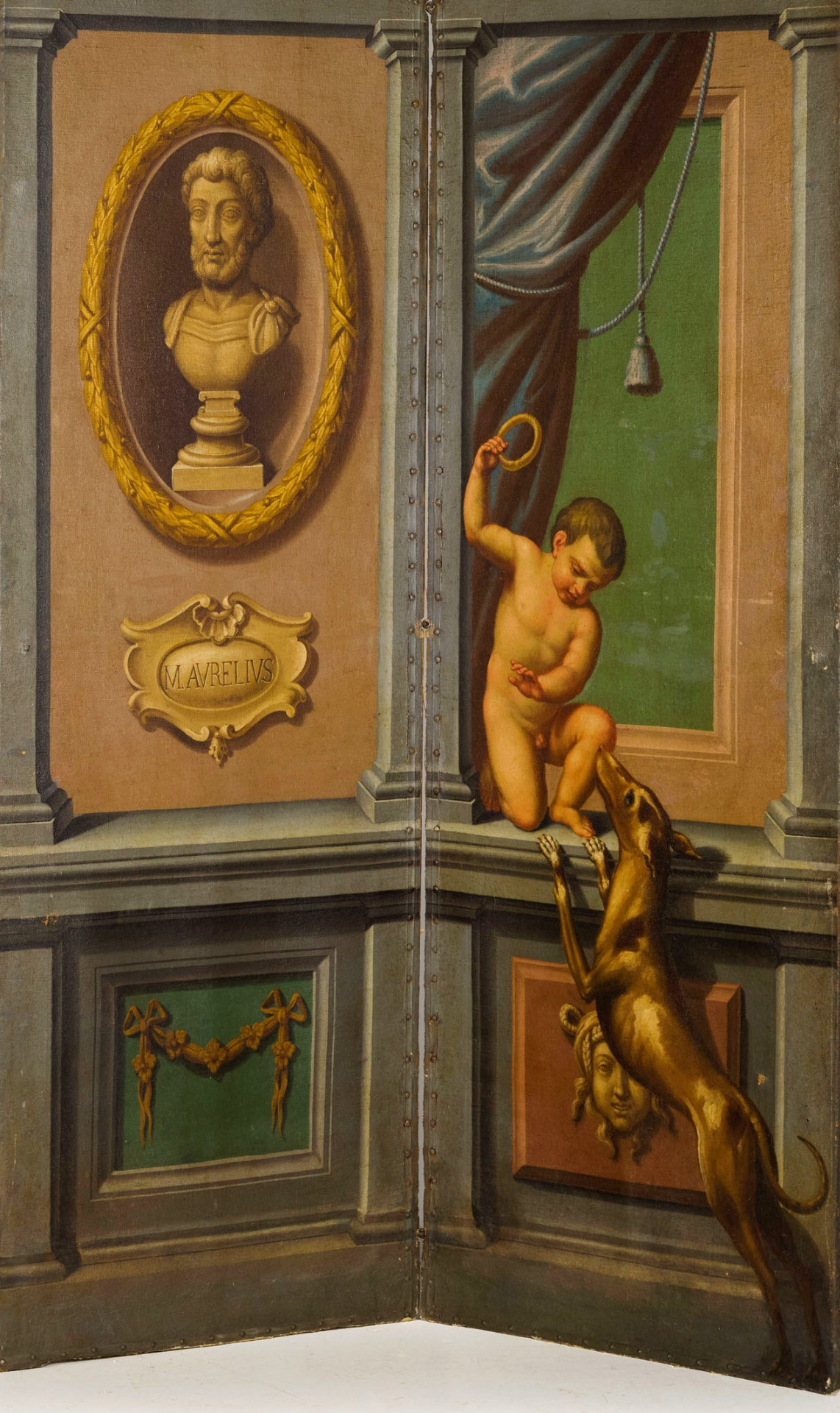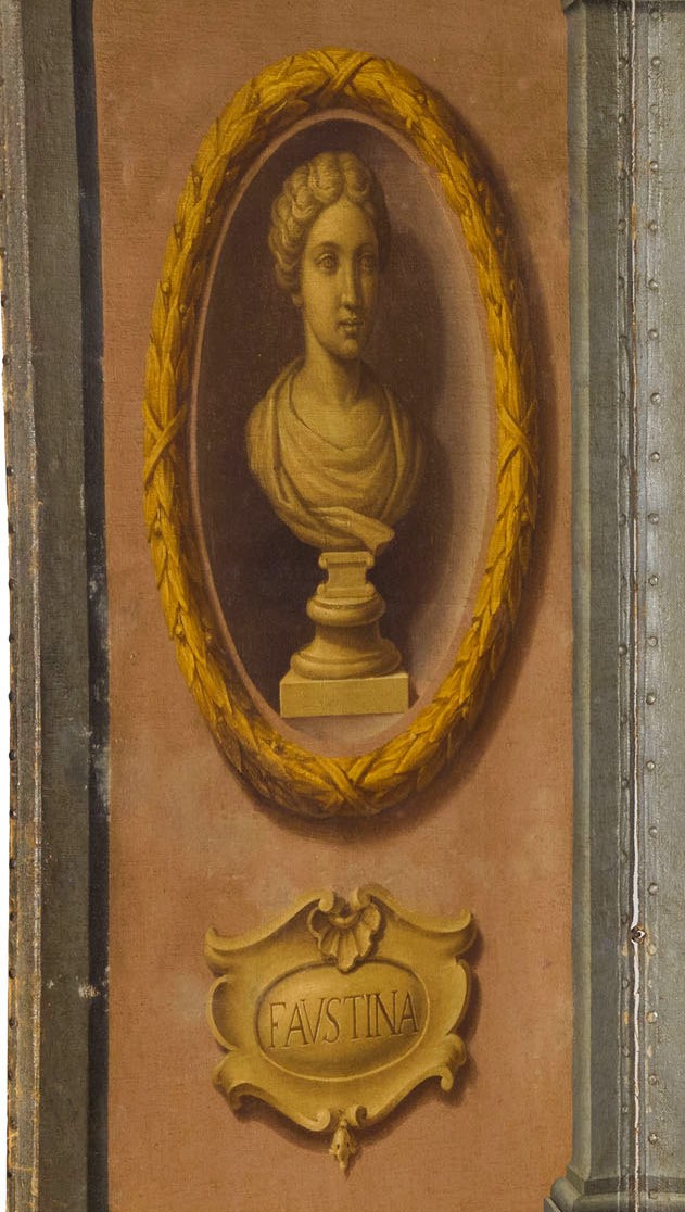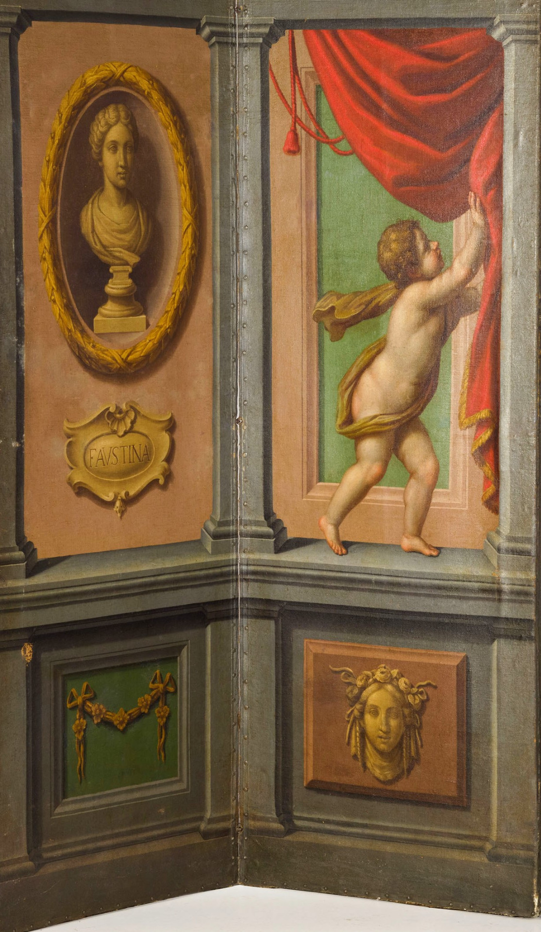 Each panel depicts a trompe l'oeil, that is a fake architecture of classical taste with square-section marble columns and a wide plinth. Inside the rosy mirrors of the first and third panels are painted, as if inserted in a niche with bronze frame, of ancient marble busts: these are, as can be read from the fake marble cartouches below, the busts of the emperor Marcus Aurelius and his wife Annia Galeria Faustina. In the lower register, in green mirrors, garlands of ribbons, bows and flowers are depicted. On the other panels, the painter plays with the fake architecture by painting two large pink marble frames, partially covered by two large, soft and voluminous draped curtains, one red and the other in shades of blue. On the thickness of the plinth are depicted two cherubs: the first is trying to move the red curtain, while the other is playing with a greyhound that from the ground tries to reach him. In the lower portion are represented two female heads in grisaille, which simulate marble sculptures. Iconographically, the goddess Ceres or Demeter must be recognized, the maternal divinity of the earth and fertility, the tutelary deity of harvests and birth. The frame of the upper frame is molded with soft and sinuous lines that lighten the architectural structure and increase its decorativeness.