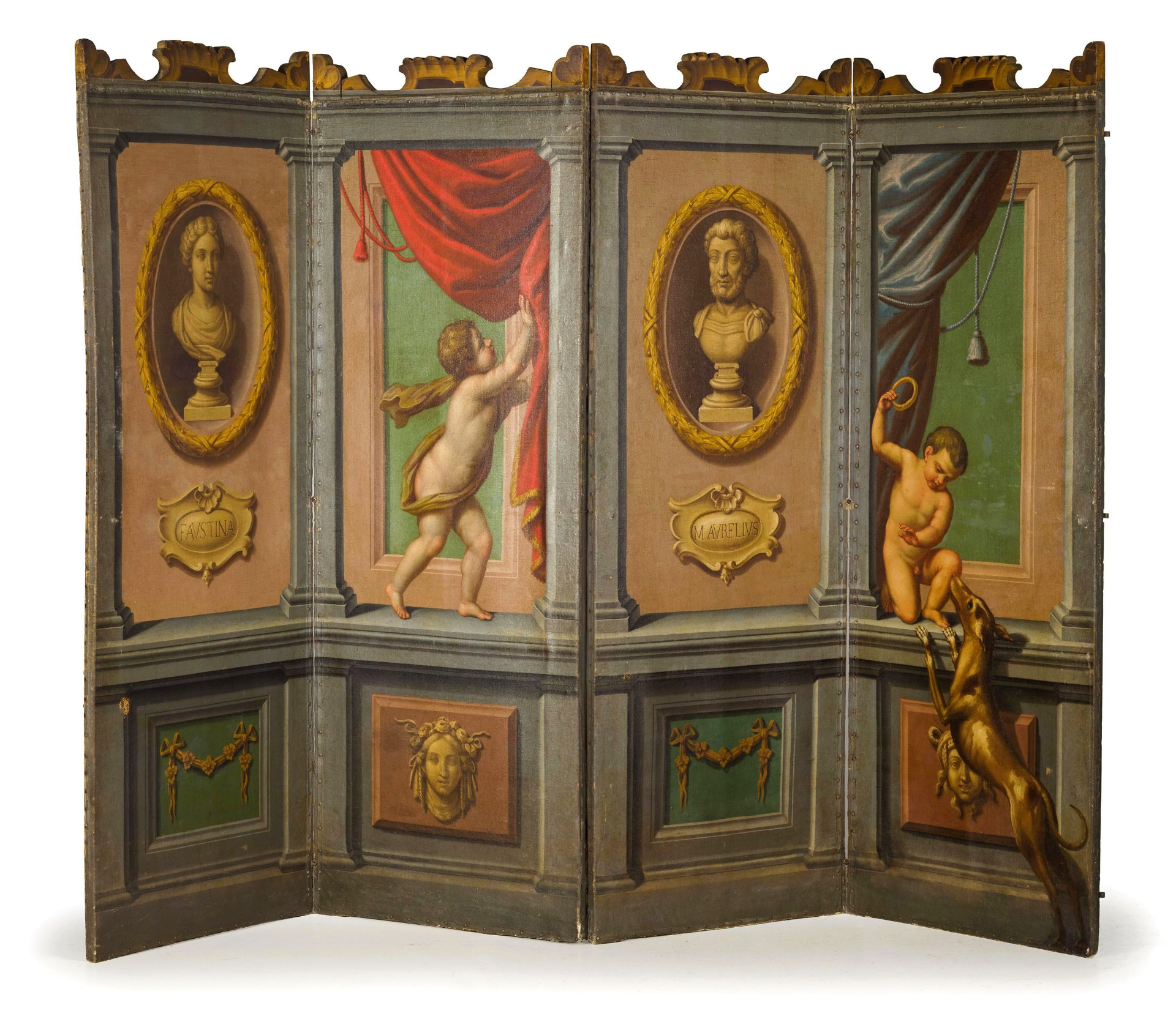 Large neoclassical screen with four panels painted in oil on canvas, Italy, second half of the 18th century