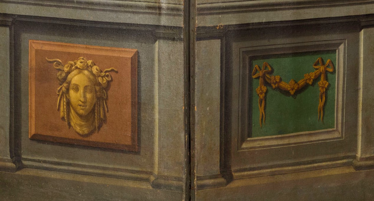 The large screen is composed of four oil-painted canvas panels. In neoclassical style, it dates back to the second half of the 18th century.