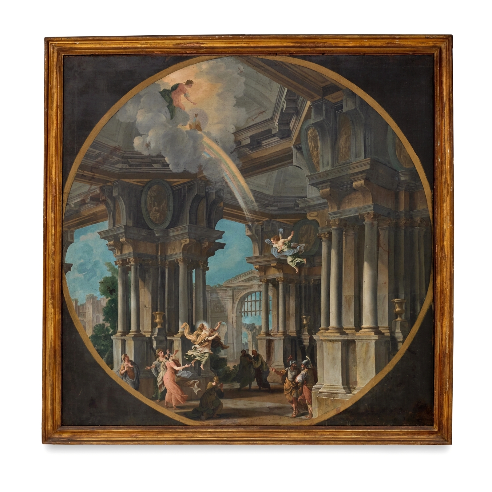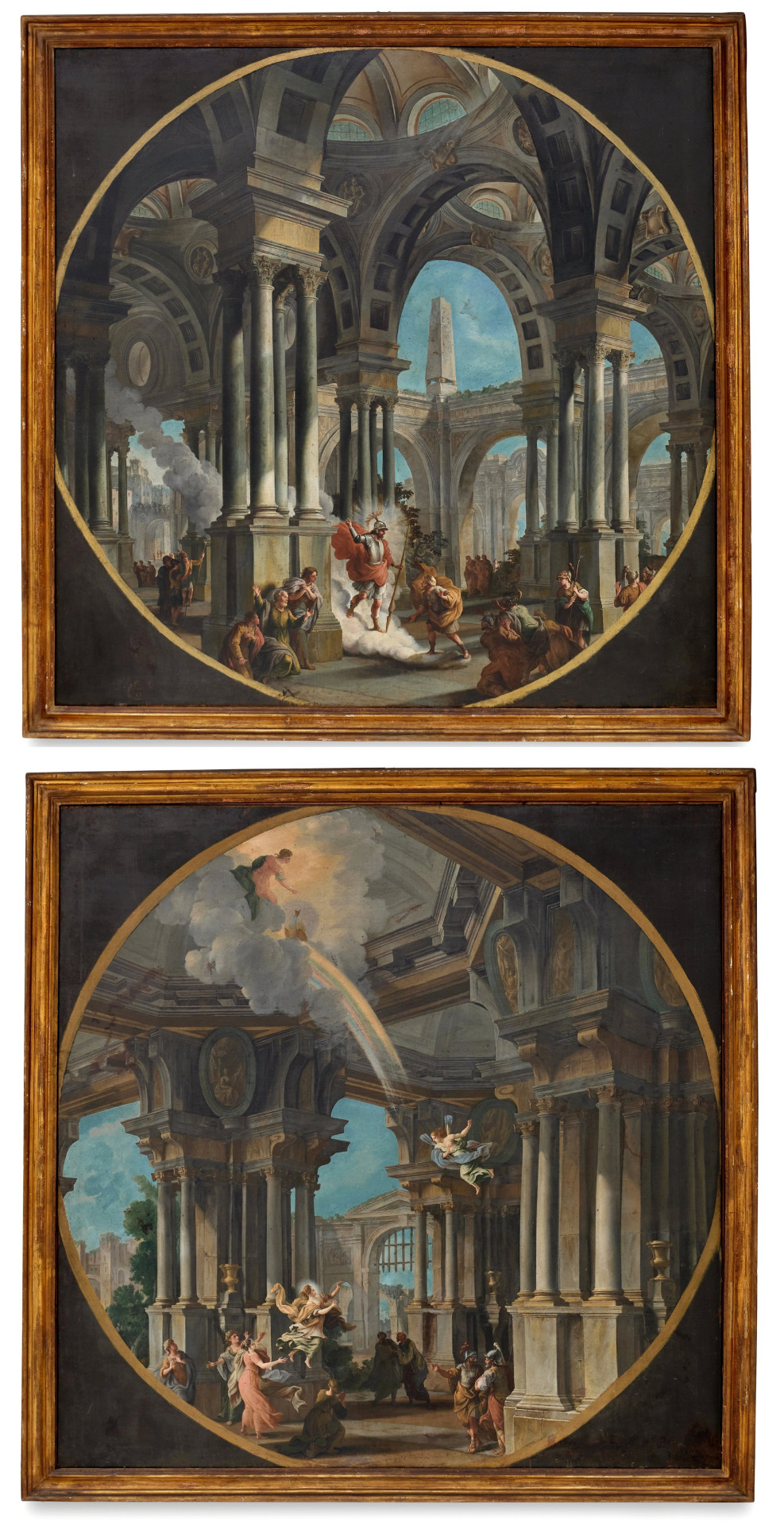 Pair of architectural capriccios with mythological scenes, oil on canvas, Bolognese painter active in the 18th century