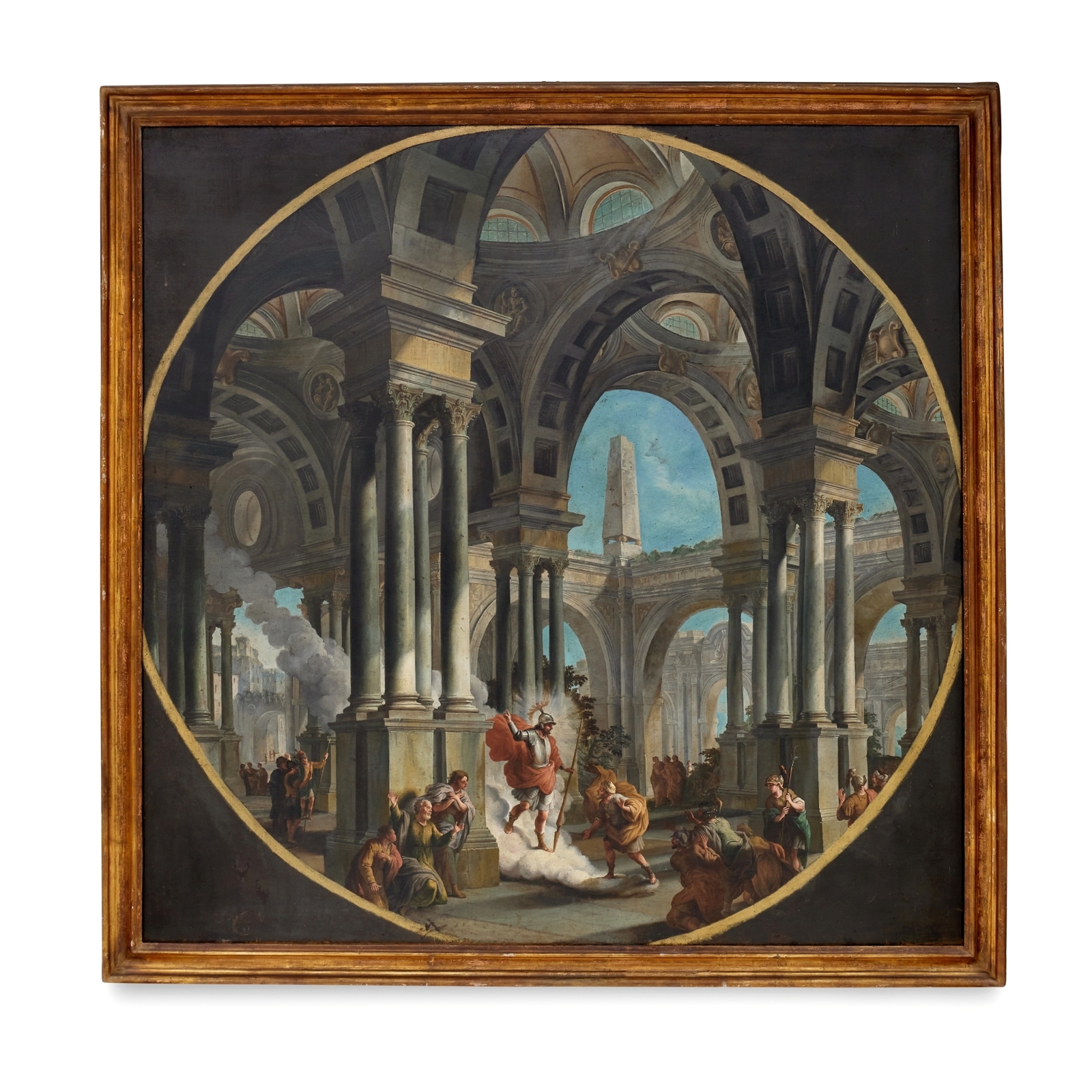 Majestic and decorative, the square-shaped canvases present the architectural capriccios inside a circle bordered by an ochre fillet that simulates a frame. A scenographic ploy much loved during the Baroque era which gives the whole greater lightness and facilitates its inclusion in a picture gallery.