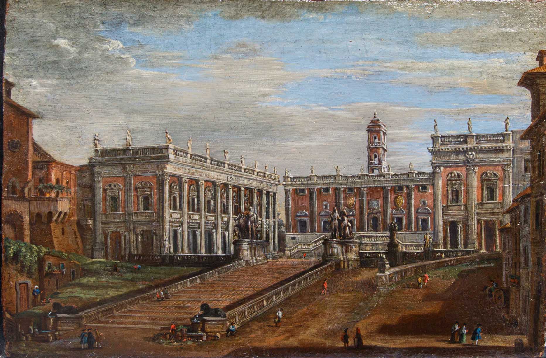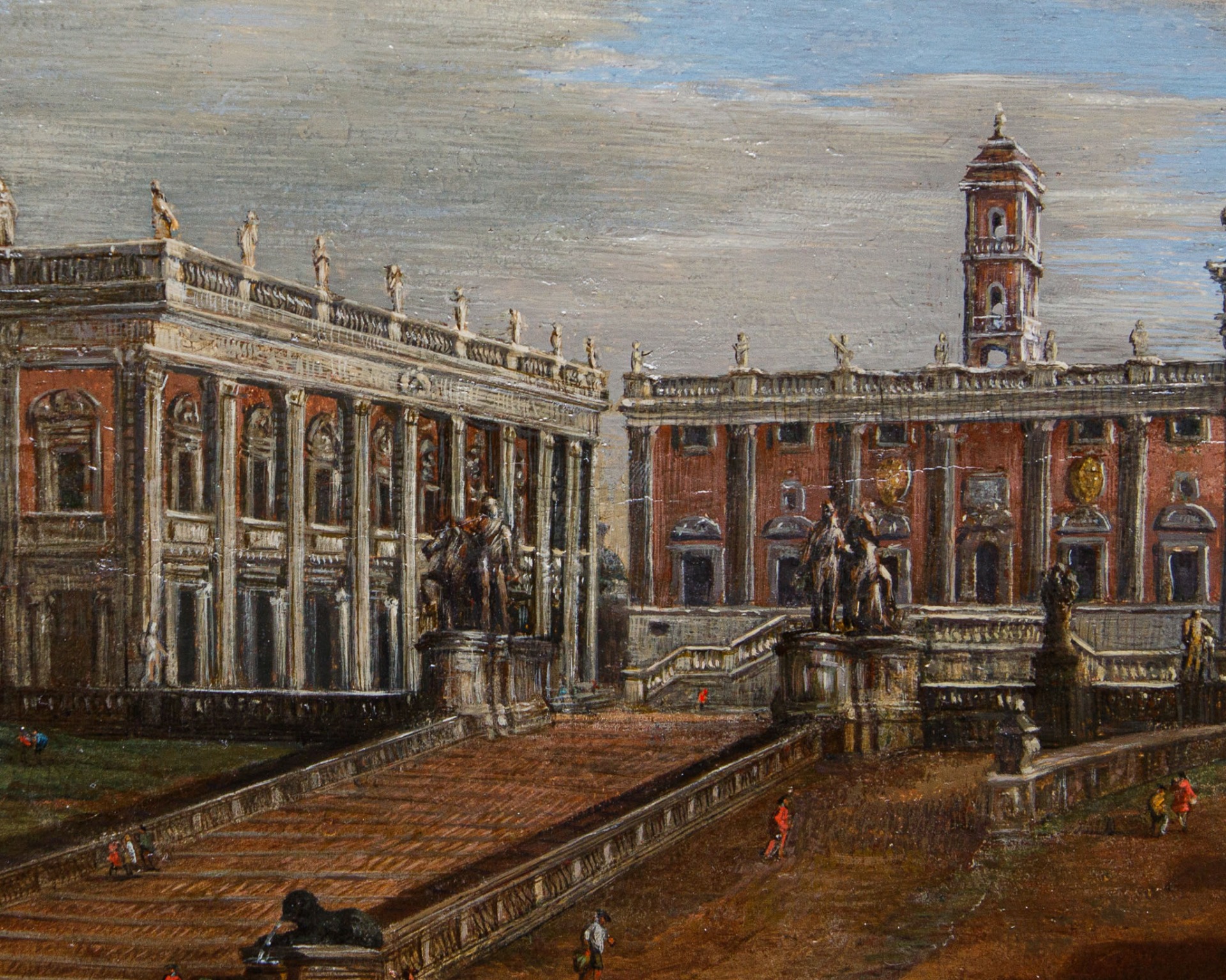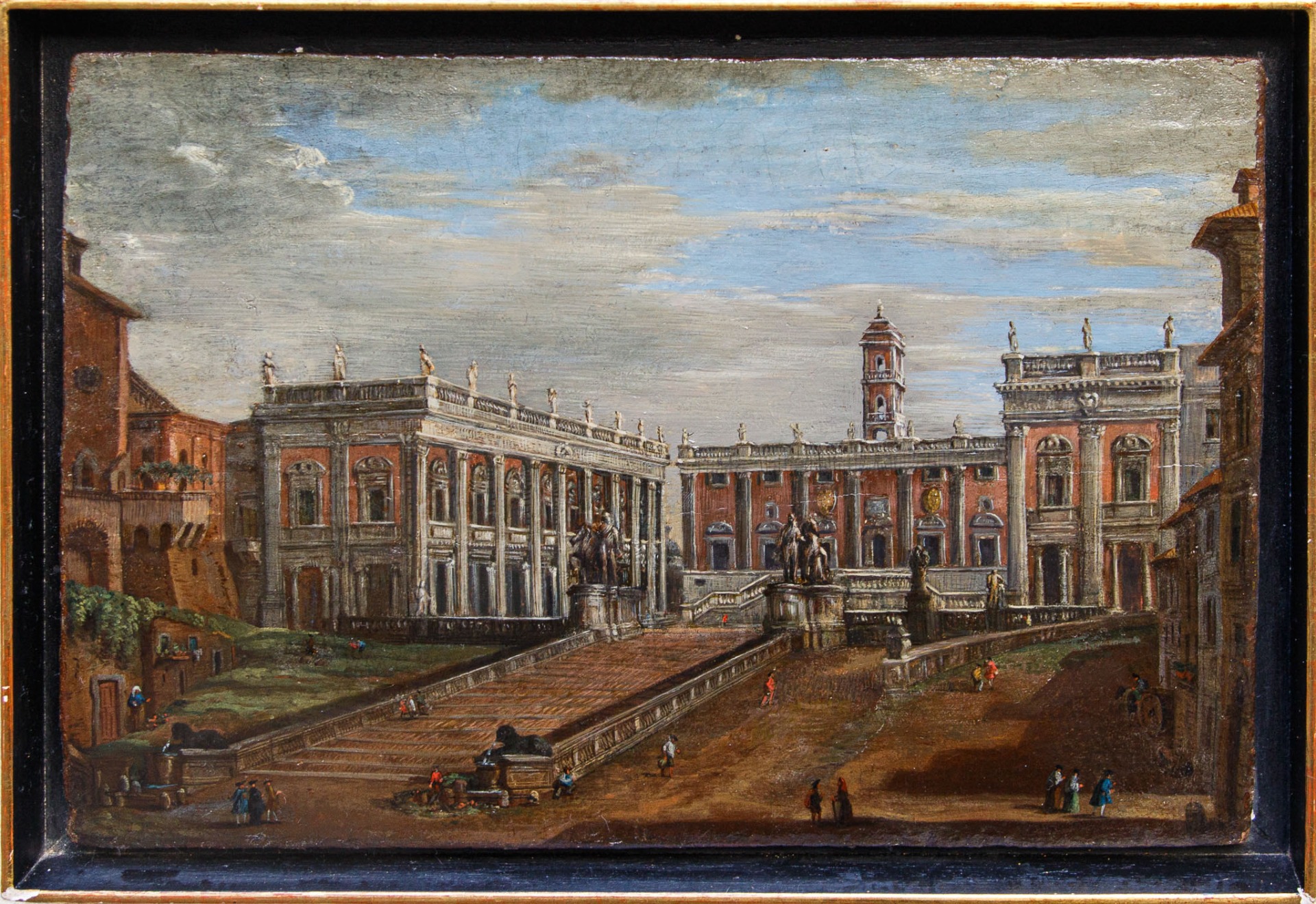 In this view of the Capitoline Hill, we find the characteristic features of the Italian veduta tradition, which developed during the 18th century as a continuation of the landscape painting that had already characterized Baroque art in the previous century. A primary distinction from earlier examples is a preference for the exact and objective depiction of the subject, in contrast to the architectural capriccios and fantasy landscapes that, while persisting in the artistic production of the 18th century, had been more popular with artists of the Baroque era. Attention to detail is most evident in urban views like the one under examination, where one notices a carefully calibrated perspective foreshortening of the square, the staircase, and the perimeter buildings, without omitting any detail and without any cursory treatment of the architectural particulars. Symbolic places of the great Italian art cities, such as Venice, Florence, and, indeed, Rome, were among the preferred subjects of the painters of this genre, including the author of this panel: Salvatore Colonnelli Sciarra, active in Rome in the first half of the 18th century. Little is known about the biography of this artist, a prominent Roman painter and restorer known for his specialization in landscape painting and for his role in the recovery of important works of art through his drawings. His perfection in the field of veduta painting placed him in an artistic context dominated by figures such as Giovanni Paolo Panini, of whom he has been mistakenly considered a mere follower by some historians, and Antonio Joli, despite his works, such as the one under examination, showing a quality and a distinctive style that elevate him beyond the role of a simple imitator. His views, such as this View of the Capitoline Hill, that of Villa Sacchetti, or the View of Piazza del Pantheon, demonstrate a remarkable ability in capturing the architectural details and urban atmospheres of 18th-century Rome. His painting is characterized by a skillful use of light, which highlights the volumes of the buildings and creates depth. The atmospheres are often clear and limpid, with blue skies that contrast with the earthy color of the ruins. The human figures, although small, are vital and animate the scenes, adding a sense of movement and daily life. The artist also demonstrates a profound knowledge of classical architecture: every detail, from columns to capitals to facades, is reproduced with almost scientific precision, a characteristic that also consecrated him as an important documentarian of the urban appearance of Rome in the 18th century.