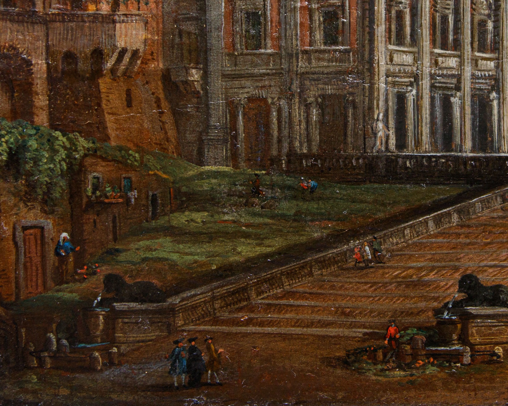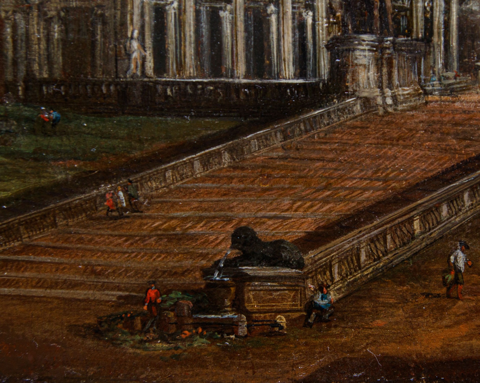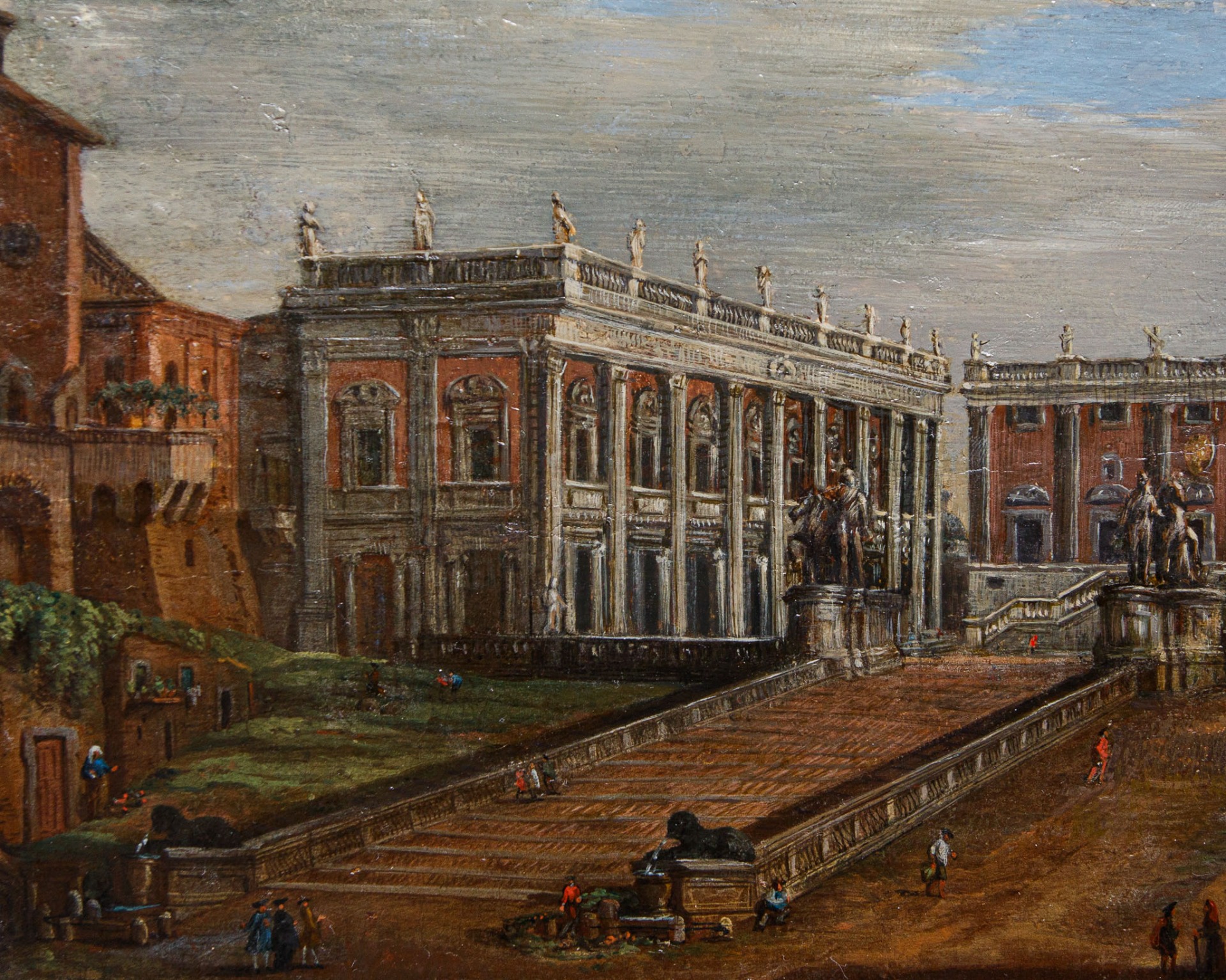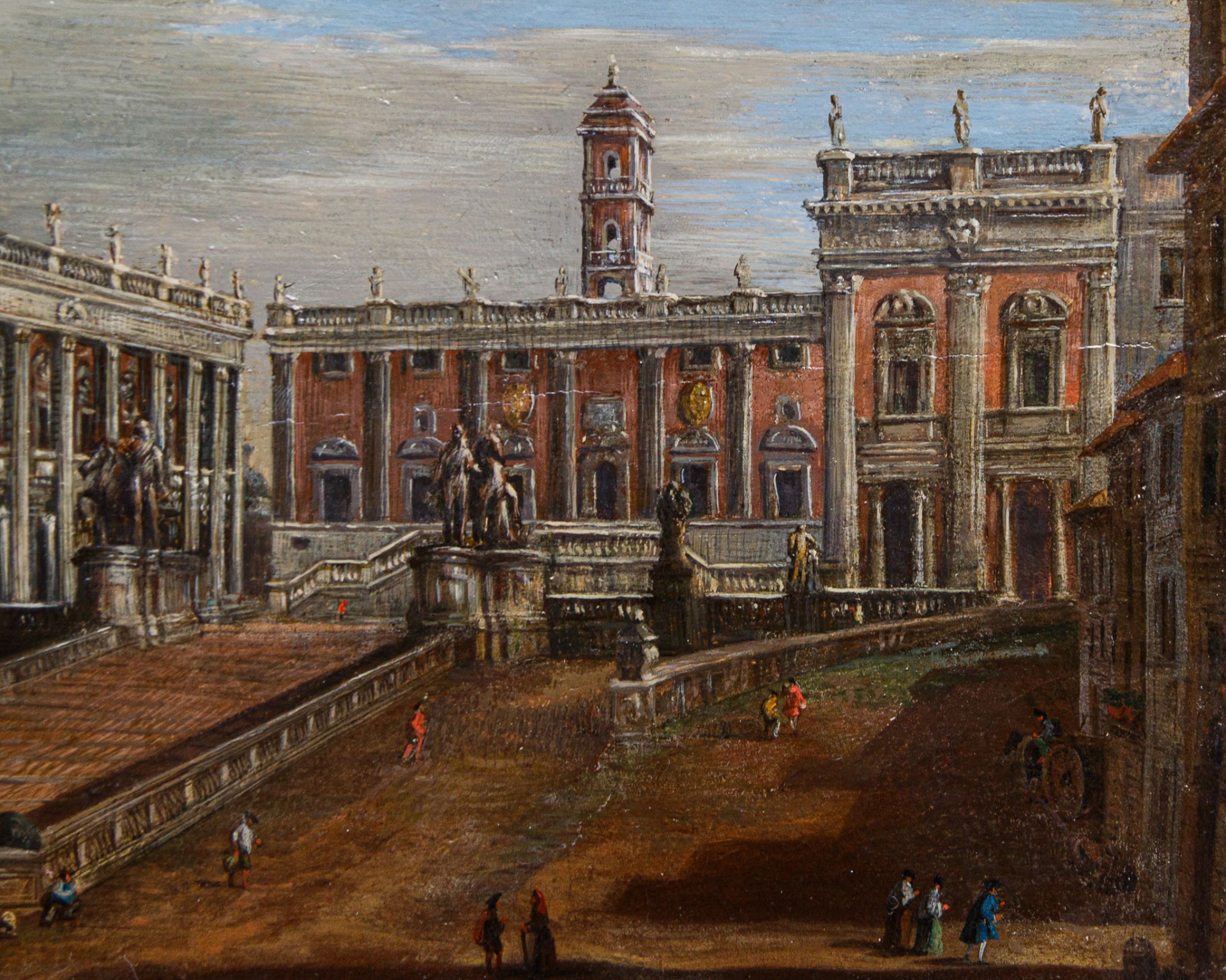 In this view of the Capitoline Hill, we find the characteristic features of the Italian veduta tradition, which developed during the 18th century as a continuation of the landscape painting that had already characterized Baroque art in the previous century. A primary distinction from earlier examples is a preference for the exact and objective depiction of the subject, in contrast to the architectural capriccios and fantasy landscapes that, while persisting in the artistic production of the 18th century, had been more popular with artists of the Baroque era. Attention to detail is most evident in urban views like the one under examination, where one notices a carefully calibrated perspective foreshortening of the square, the staircase, and the perimeter buildings, without omitting any detail and without any cursory treatment of the architectural particulars. Symbolic places of the great Italian art cities, such as Venice, Florence, and, indeed, Rome, were among the preferred subjects of the painters of this genre, including the author of this panel: Salvatore Colonnelli Sciarra, active in Rome in the first half of the 18th century. Little is known about the biography of this artist, a prominent Roman painter and restorer known for his specialization in landscape painting and for his role in the recovery of important works of art through his drawings. His perfection in the field of veduta painting placed him in an artistic context dominated by figures such as Giovanni Paolo Panini, of whom he has been mistakenly considered a mere follower by some historians, and Antonio Joli, despite his works, such as the one under examination, showing a quality and a distinctive style that elevate him beyond the role of a simple imitator. His views, such as this View of the Capitoline Hill, that of Villa Sacchetti, or the View of Piazza del Pantheon, demonstrate a remarkable ability in capturing the architectural details and urban atmospheres of 18th-century Rome. His painting is characterized by a skillful use of light, which highlights the volumes of the buildings and creates depth. The atmospheres are often clear and limpid, with blue skies that contrast with the earthy color of the ruins. The human figures, although small, are vital and animate the scenes, adding a sense of movement and daily life. The artist also demonstrates a profound knowledge of classical architecture: every detail, from columns to capitals to facades, is reproduced with almost scientific precision, a characteristic that also consecrated him as an important documentarian of the urban appearance of Rome in the 18th century.