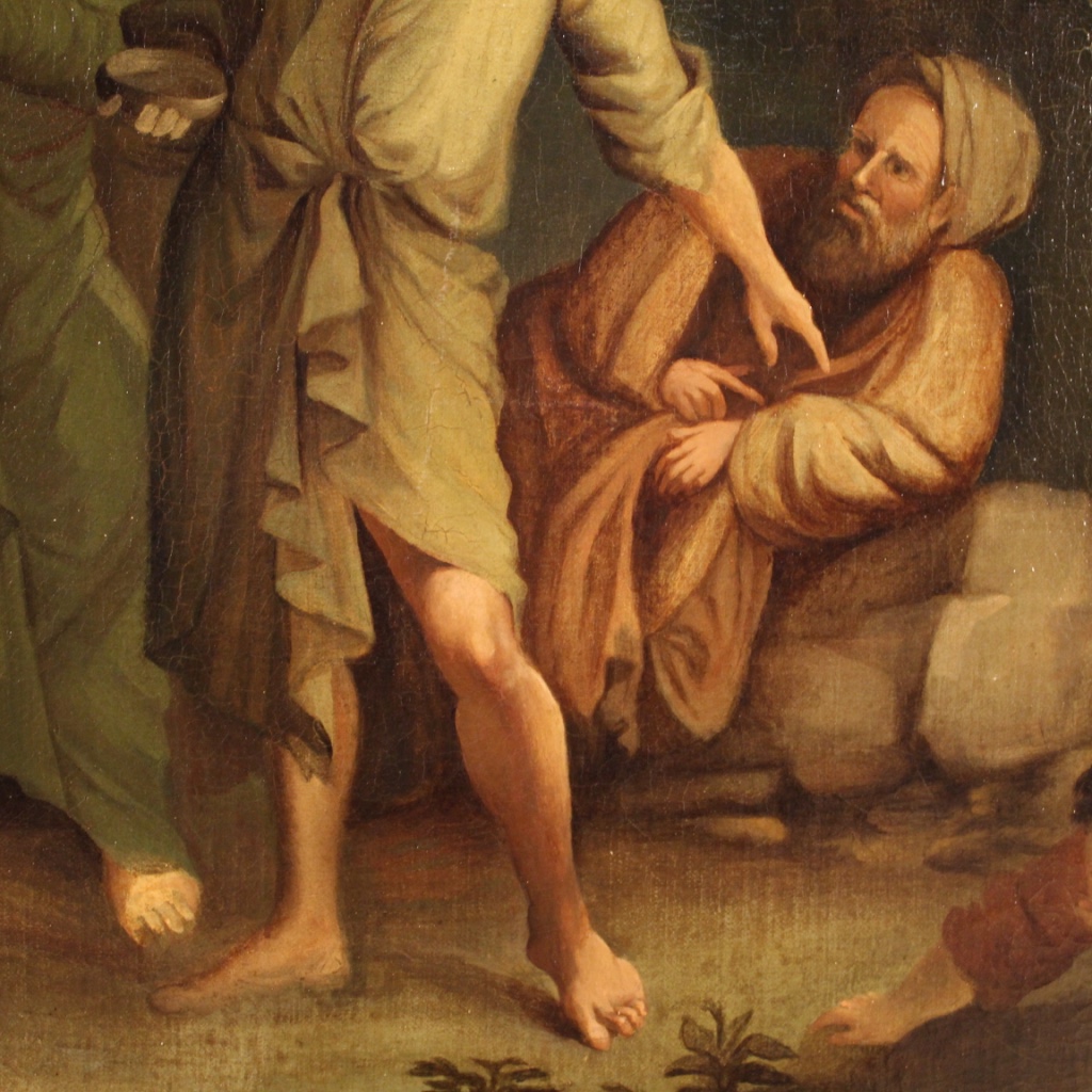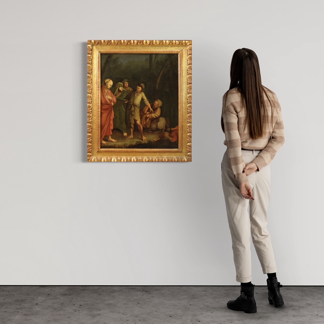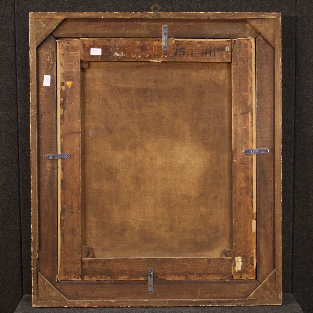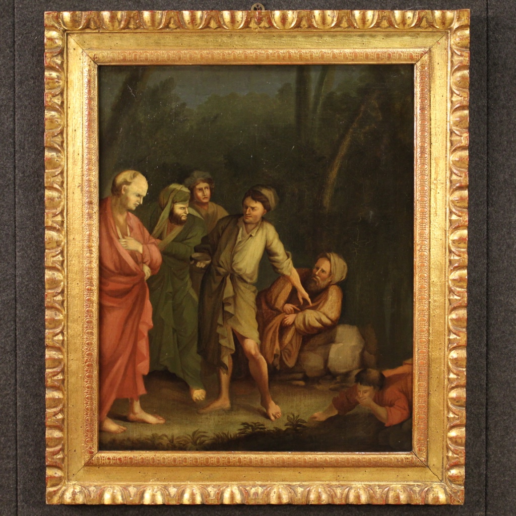 Antique Italian painting from the 18th century. Oil on canvas painting depicting a particular subject with characters (under study) of good pictorial quality. Modern carved and gilded wooden frame of beautiful decoration. Nice size framework, for antique dealers, interior decorators and collectors of ancient Italian painting. Painting that has undergone a conservative restoration during the second half of the twentieth century. In good condition. Sight size H 73 X W 59 cm