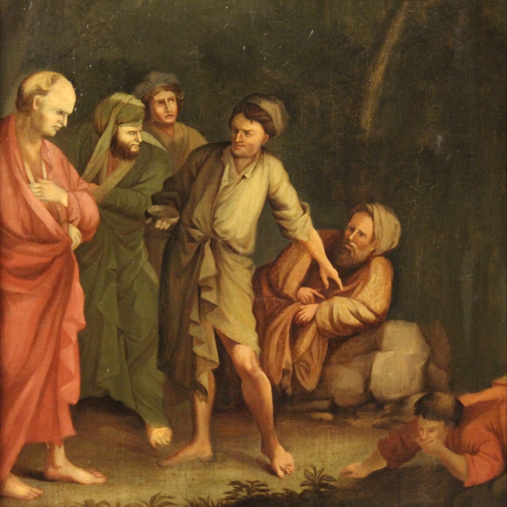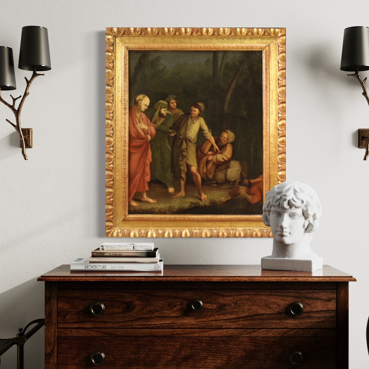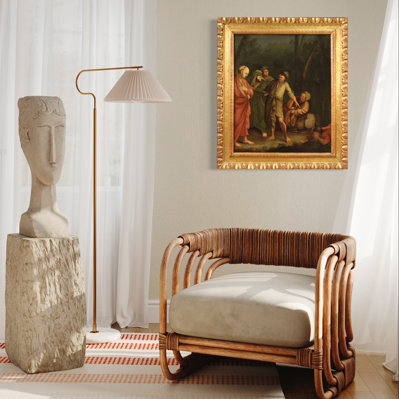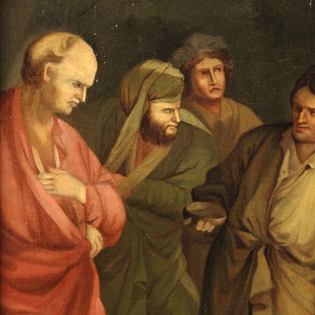 Antique Italian painting from the 18th century. Oil on canvas painting depicting a particular subject with characters (under study) of good pictorial quality. Modern carved and gilded wooden frame of beautiful decoration. Nice size framework, for antique dealers, interior decorators and collectors of ancient Italian painting. Painting that has undergone a conservative restoration during the second half of the twentieth century. In good condition. Sight size H 73 X W 59 cm