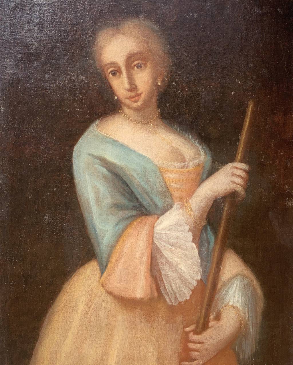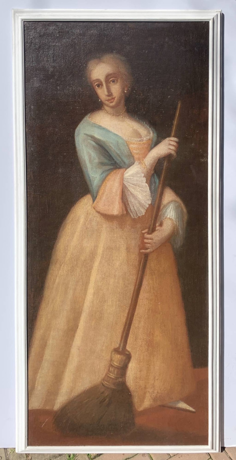 Antique oil painting on canvas, in a white lacquered wooden frame.