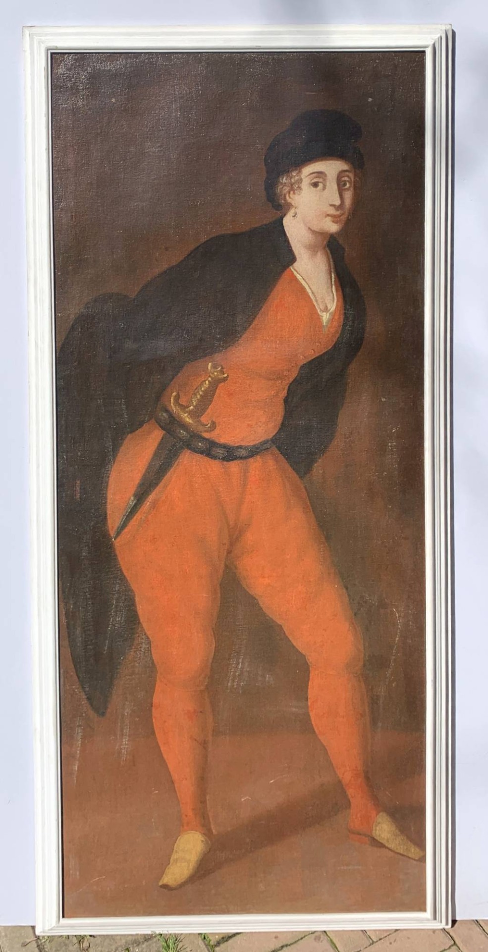 Antique oil painting on canvas, in a white lacquered wooden frame.