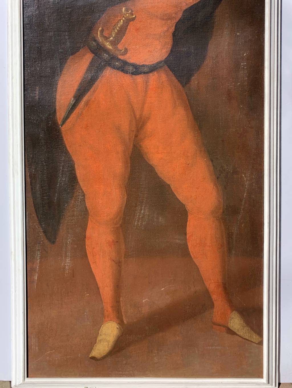 Antique oil painting on canvas, in a white lacquered wooden frame.