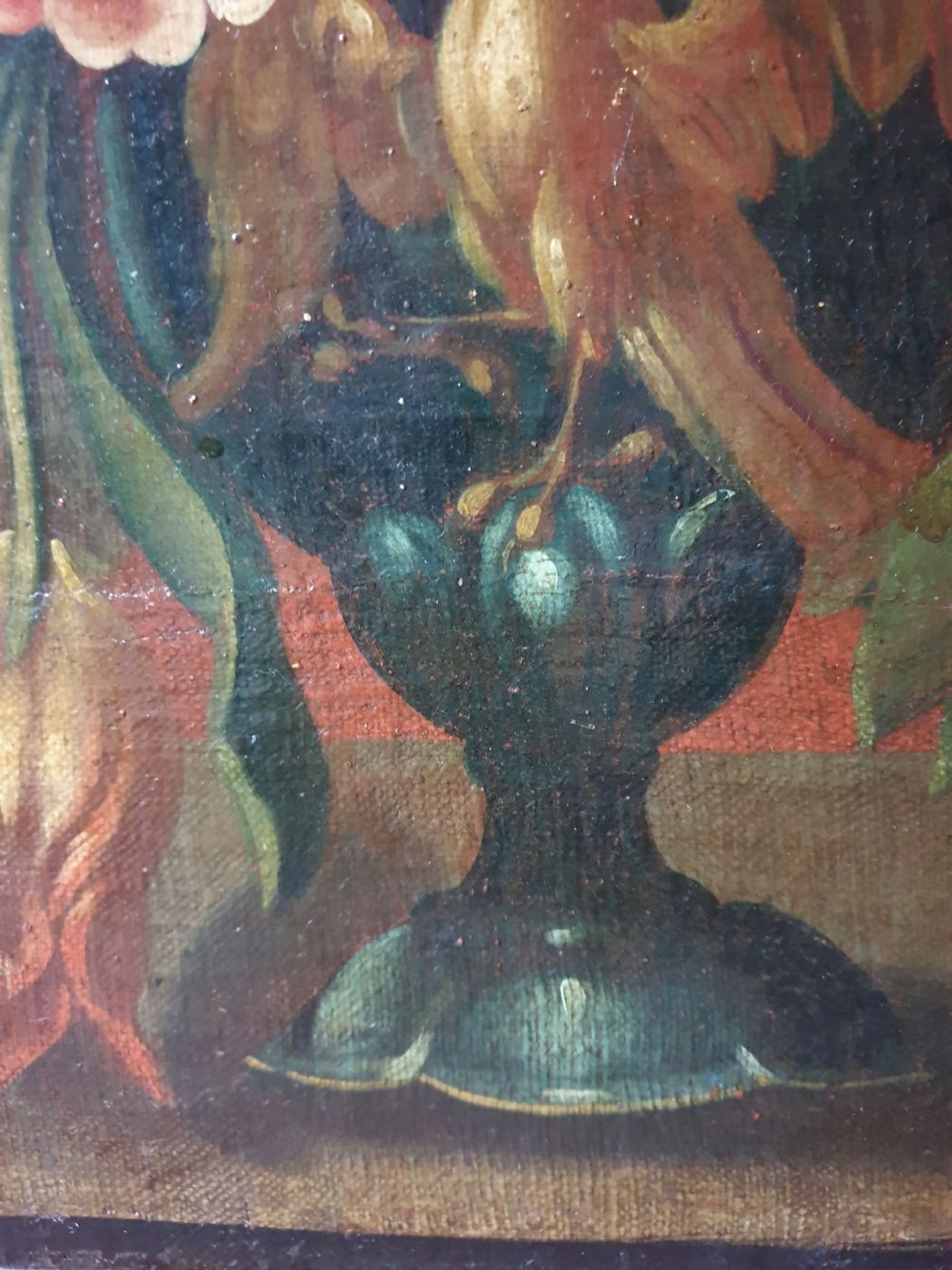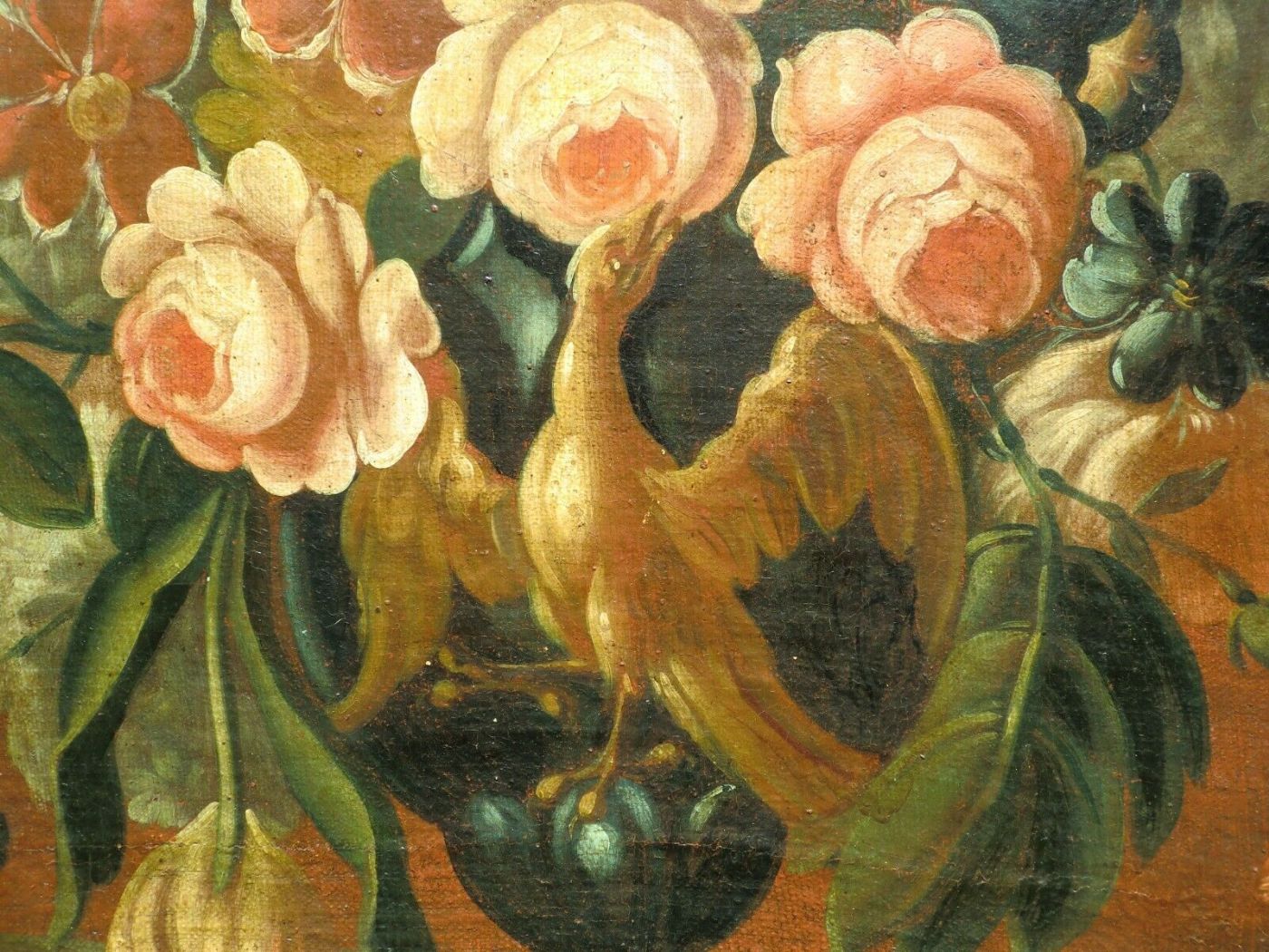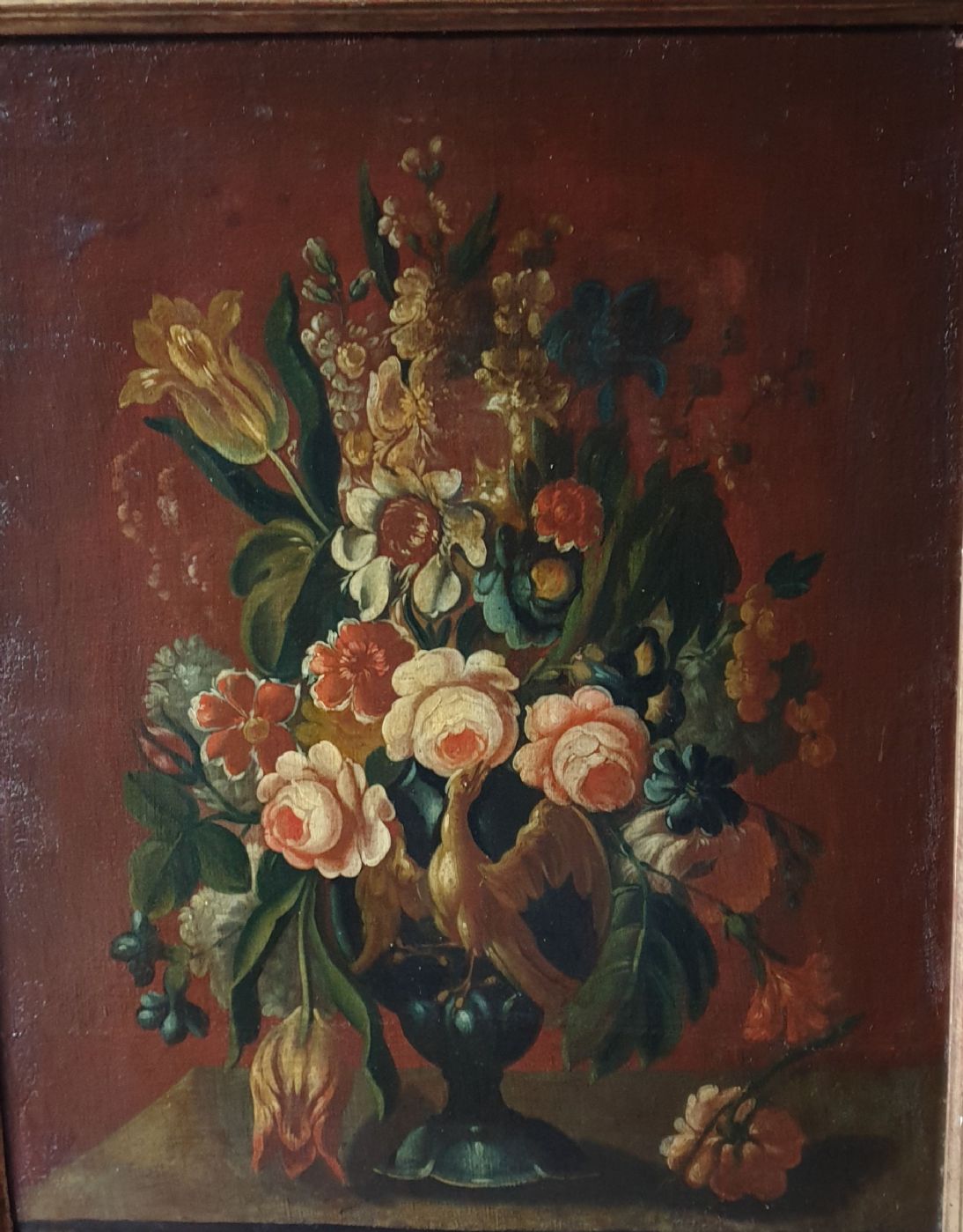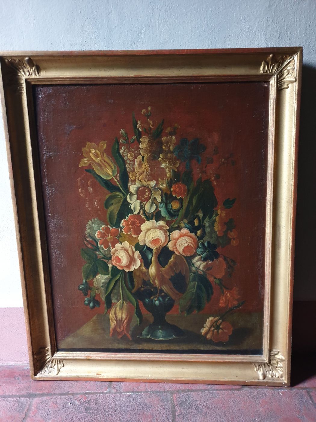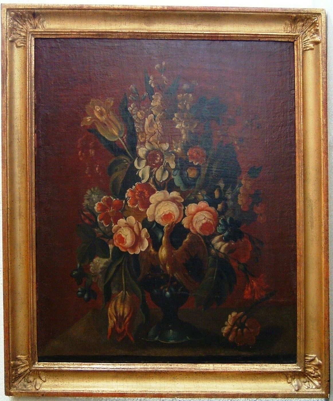 Il dipinto qui presentato,in ottimo stato di conservazione, raffigura un vaso con un ricco mazzo di fiori davanti al quale è ritratto un volatile dalle piume dorate.La sua esecuzione può essere ascritta ad un pittore specializzato in opere decorative attivo con probabilità in Italia del Nord, forse sotto influenze mitteleuropee, anche se il vaso ricorda il sapore mediceo, nello sile del maestro delle grottesche. Caratterizzato da tonalità caldo-marronastre, riprende le tipiche composizioni di fiori che tanto andavano di moda negli arredi dell’epoca: realizzato con pennellate veloci e descrittive, la sua esecuzione puo' essere ricondotta agli inizi del secolo XVIII, ancora con reminiscenze del secolo precedente, per stile e Modus Operandi. Le misure sono 62x50 cm e 73x61 cm totali, corredato da antica cornice a gesso e oro. La tela e' riportata su supporto rigido, e non necessita di alcun intervento. Pronto da appendere