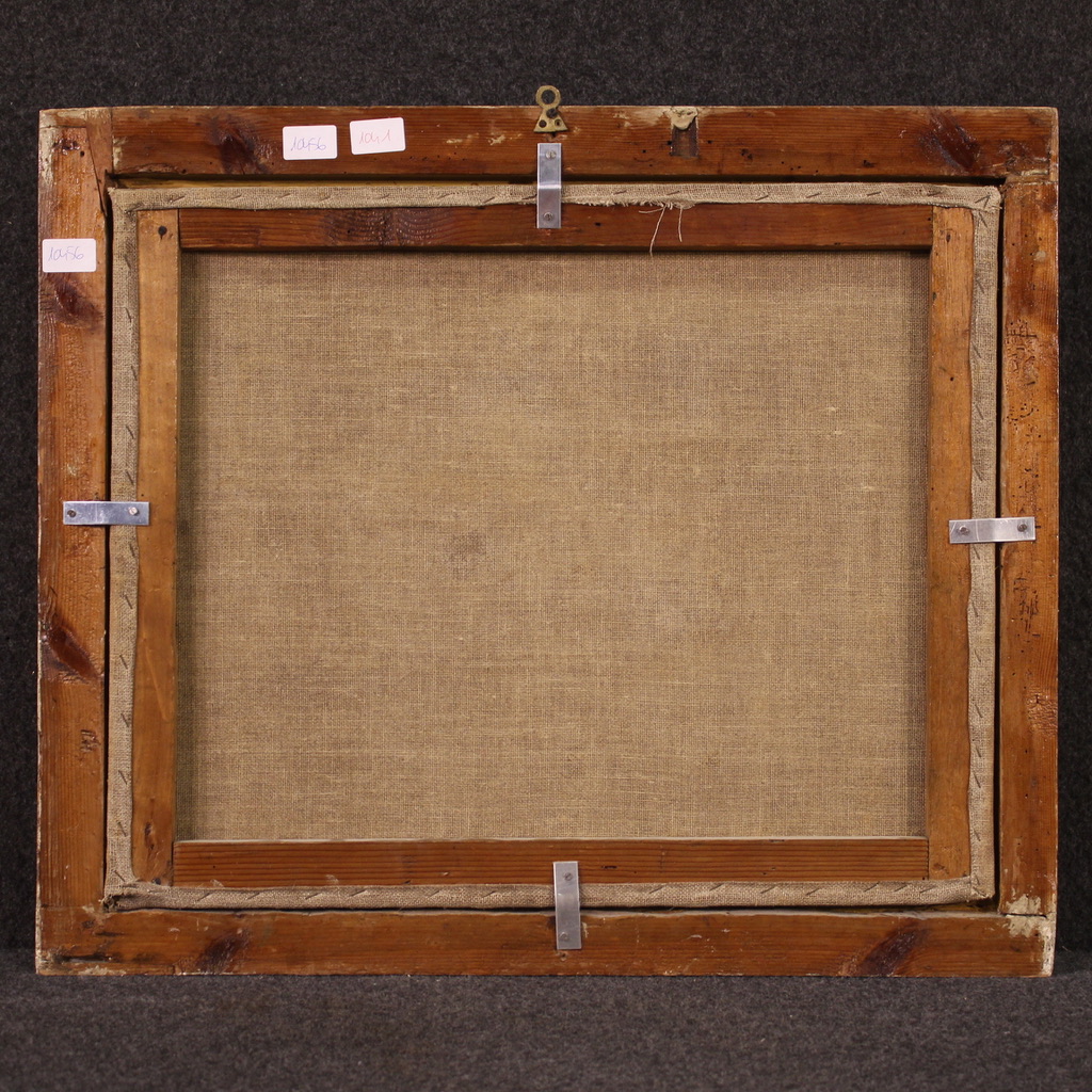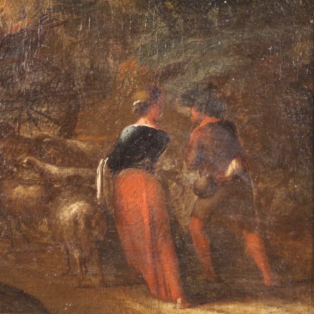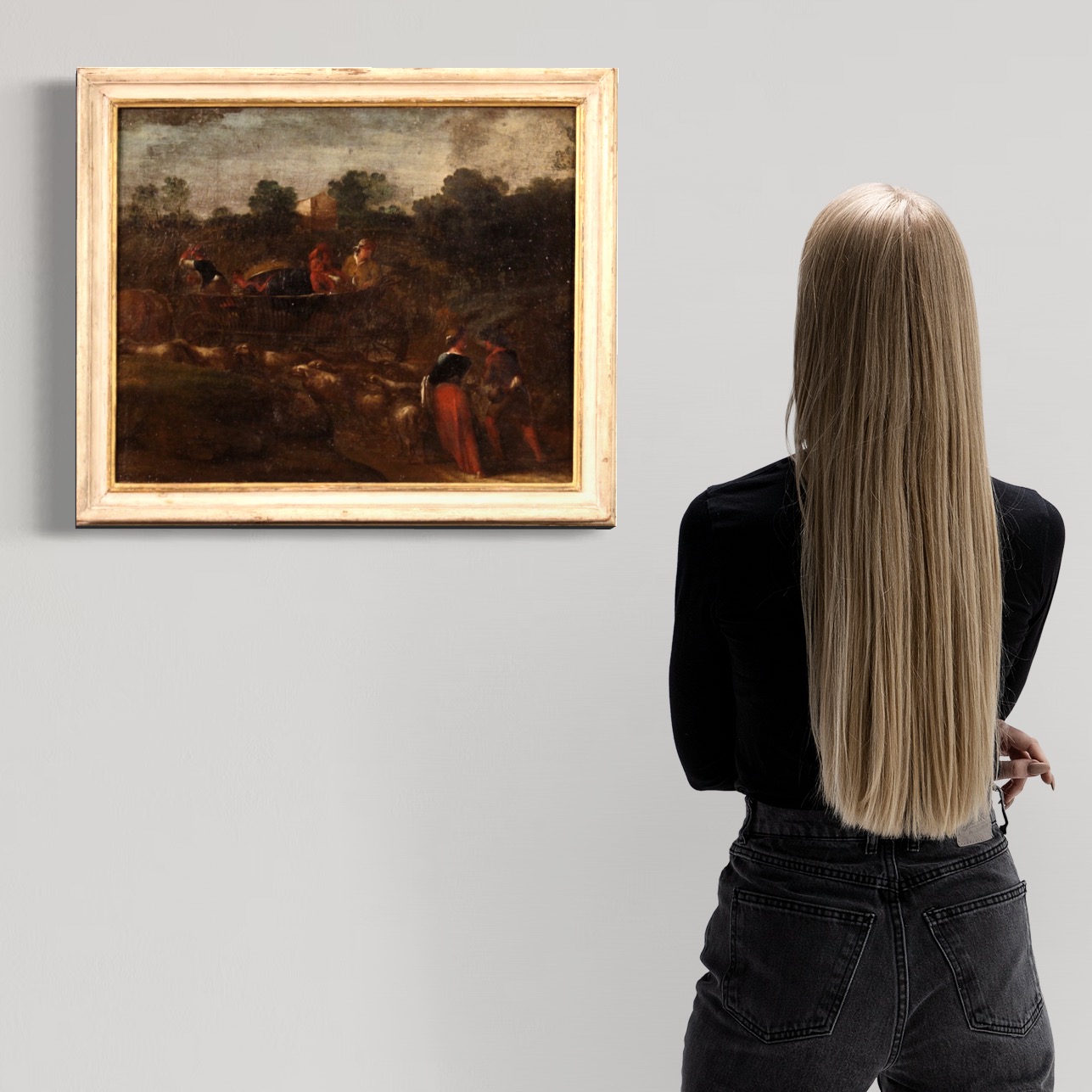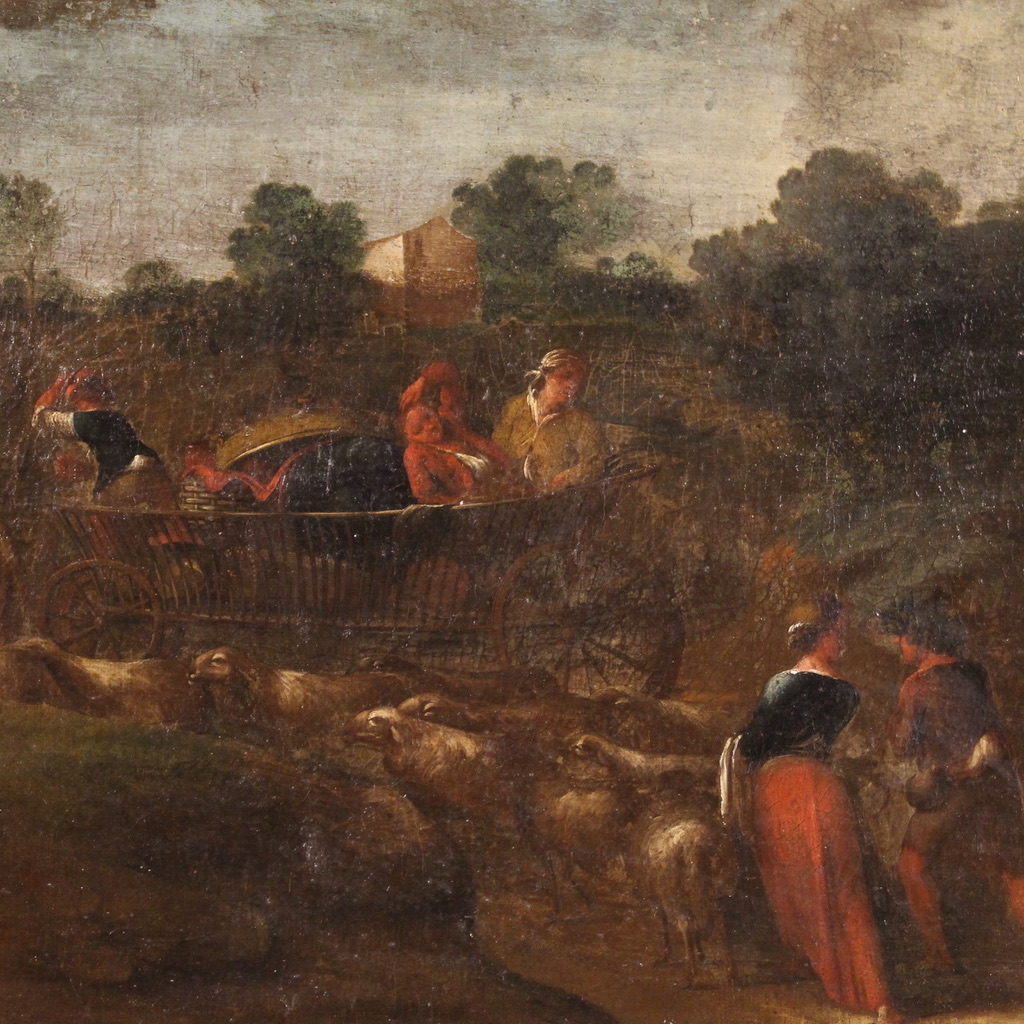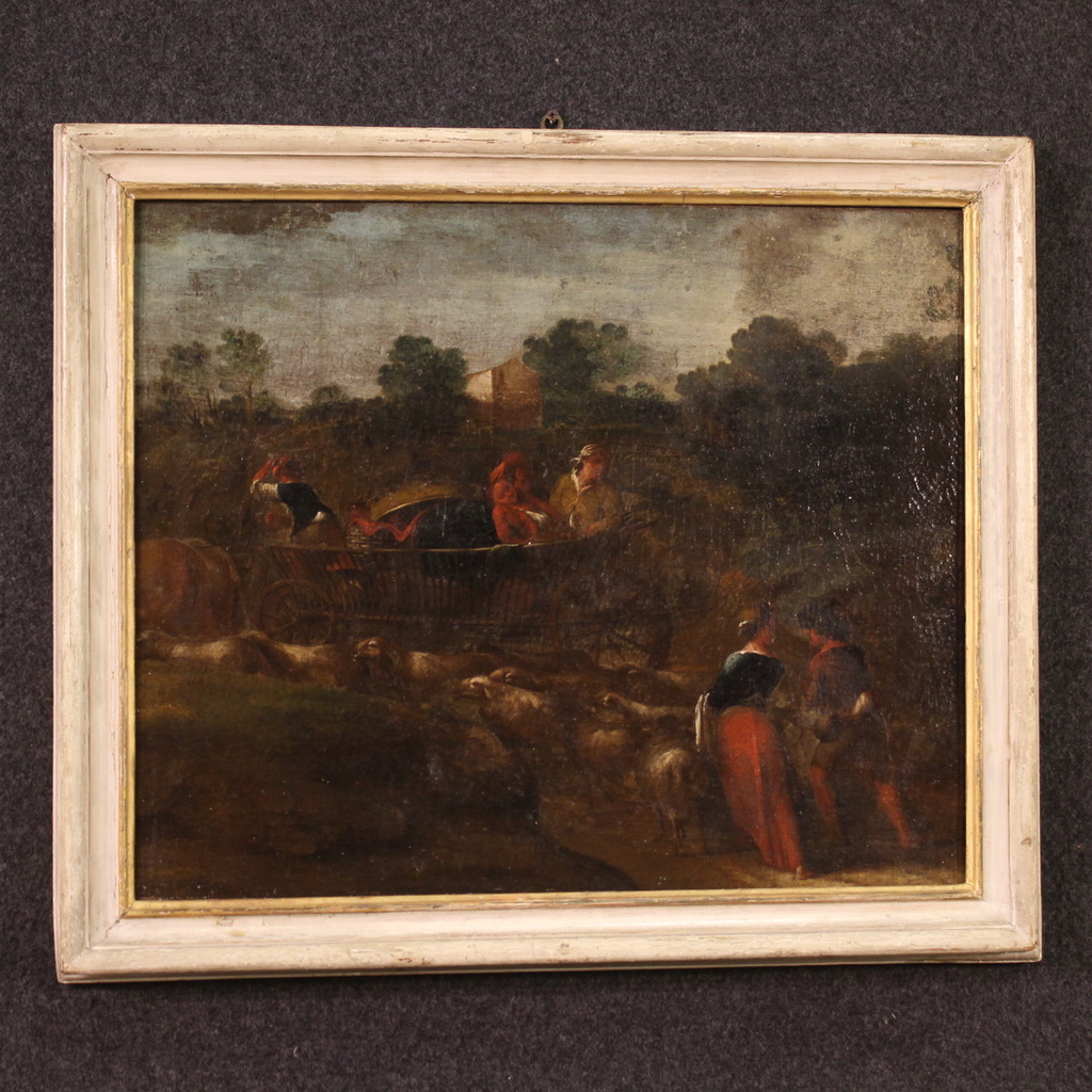 Antique Italian painting from the 18th century. Artwork oil on canvas depicting a bucolic landscape, pastoral scene with chariot of good pictorial quality. Small painting adorned with a lacquered and gilded wooden frame of the 20th century with different color losses and signs of aging (see photo), structurally sound. Painting that pleasant workmanship characterized by the presence of numerous details, animals and characters, of good dynamism. Painting of excellent proportion that can be easily placed in different parts of the house, ideal for a living room. Painting that has undergone a conservative restoration, relining, replacement of the color and recovery in some points (see photo). In nice patina, overall in good state of conservation. Sight size H 45 x W 54 cm.
