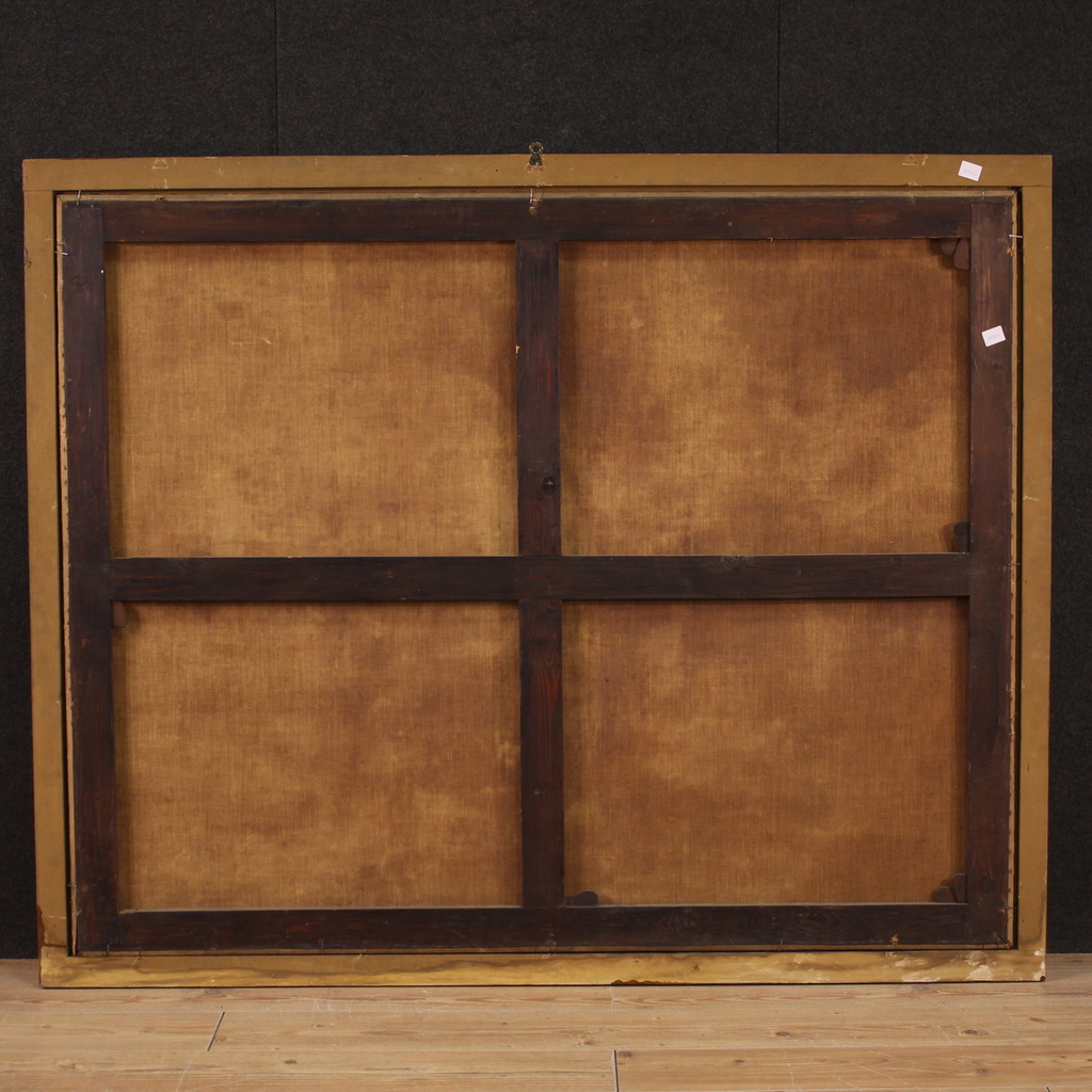 Large Italian landscape from the 18th century. Oil on canvas artwork depicting landscape with architecture and farmers of good pictorial quality. Painting adorned with an antique Louis XVI frame, carved and gilded, of beautiful quality and decoration. Antique frame that has undergone a structural restoration, with modification of the rear load-bearing structure, replaced during the 20th century. Great decorative painting, ideal to place in an important living room or study, for antique dealers and interior designers. Work that develops horizontally with a view of pleasant depth. Canvas that has undergone conservative restoration, backed again, replacement of the frame and color recovery in some places (see photo). In beautiful patina, overall in good state of conservation. Sight size H 136 x W 169 cm.