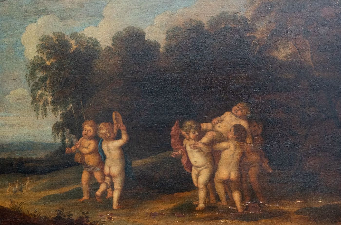 Oil on panel Dimensions: 42 × 29 cm (panel) – 55 × 40 cm (with frame) Period: 1700s Provenance: Private collection, Parma Description: Charming painting depicting a bacchanal of putti, executed on panel and attributable to the Flemish tradition, probably inspired by a model by Rubens or his circle. The scene shows a group of naked children engaged in a festive dance within a wooded landscape, with lively gestures and small musical instruments that recall the famous Baroque bacchic compositions. The soft and warm rendering of the flesh, the diffused luminosity and the circular movement of the composition betray a clear Rubensian taste. The surface has an antique patina that partially attenuates the brilliance of the colors: a professional cleaning would restore its full vitality. Perfect for embellishing both classic and modern environments. Code: 345 Additional info: The work is available in our exhibition space in Badia Polesine (RO) and is sold with a certificate of authenticity. We handle and organize the transport of purchased works, both for Italy and abroad, through professional and insured carriers. Contact us for any information, we will be happy to answer you: +393351010528; artearredoandriollo@gmail.com We also recommend that you consult our website https://www.artearredoandriollo.it/ and our social profiles: https://instagram.com/artearredoandriollo?igshid=YmMyMTA2M2Y= https://www.facebook.com/Arte-Arredo-Andriollo-681724861934185/