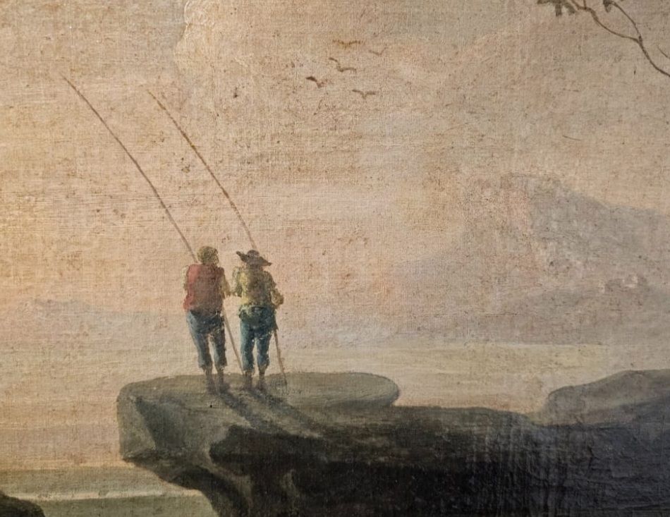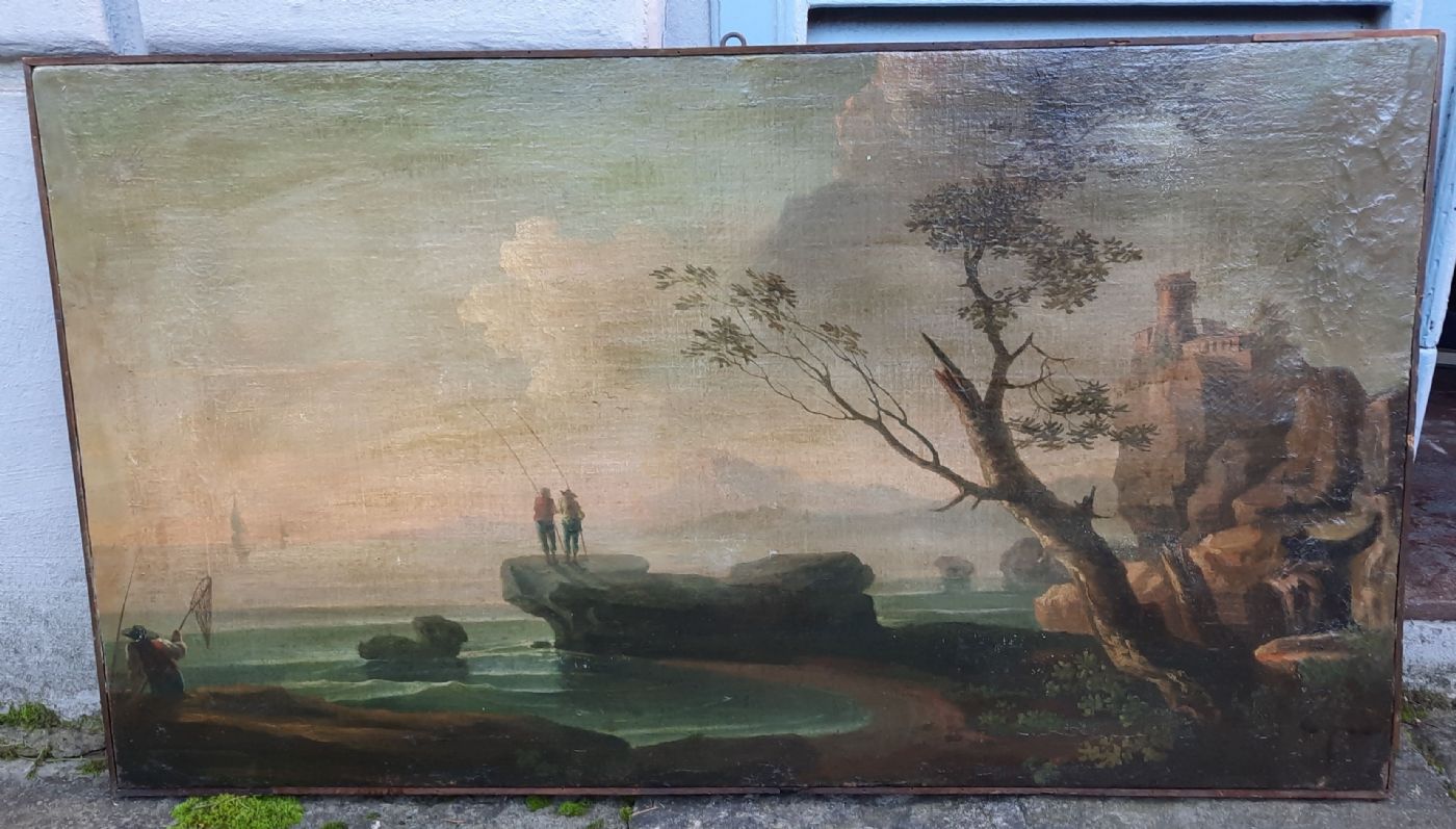 Di grande qualita' questo dipinto rappresentante paesaggio con pescatori da ricondurre alla mano di Charles Grenier De Marseille (1700-1782)