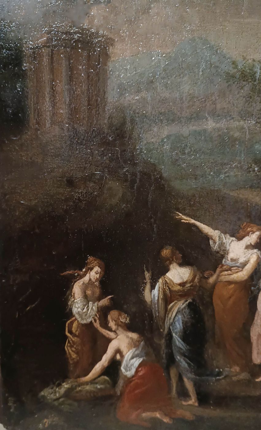 OIL PAINTING ON WOOD PANEL MERCURY AND THE DAUGHTERS OF CECROPS LATE 18TH CENTURY