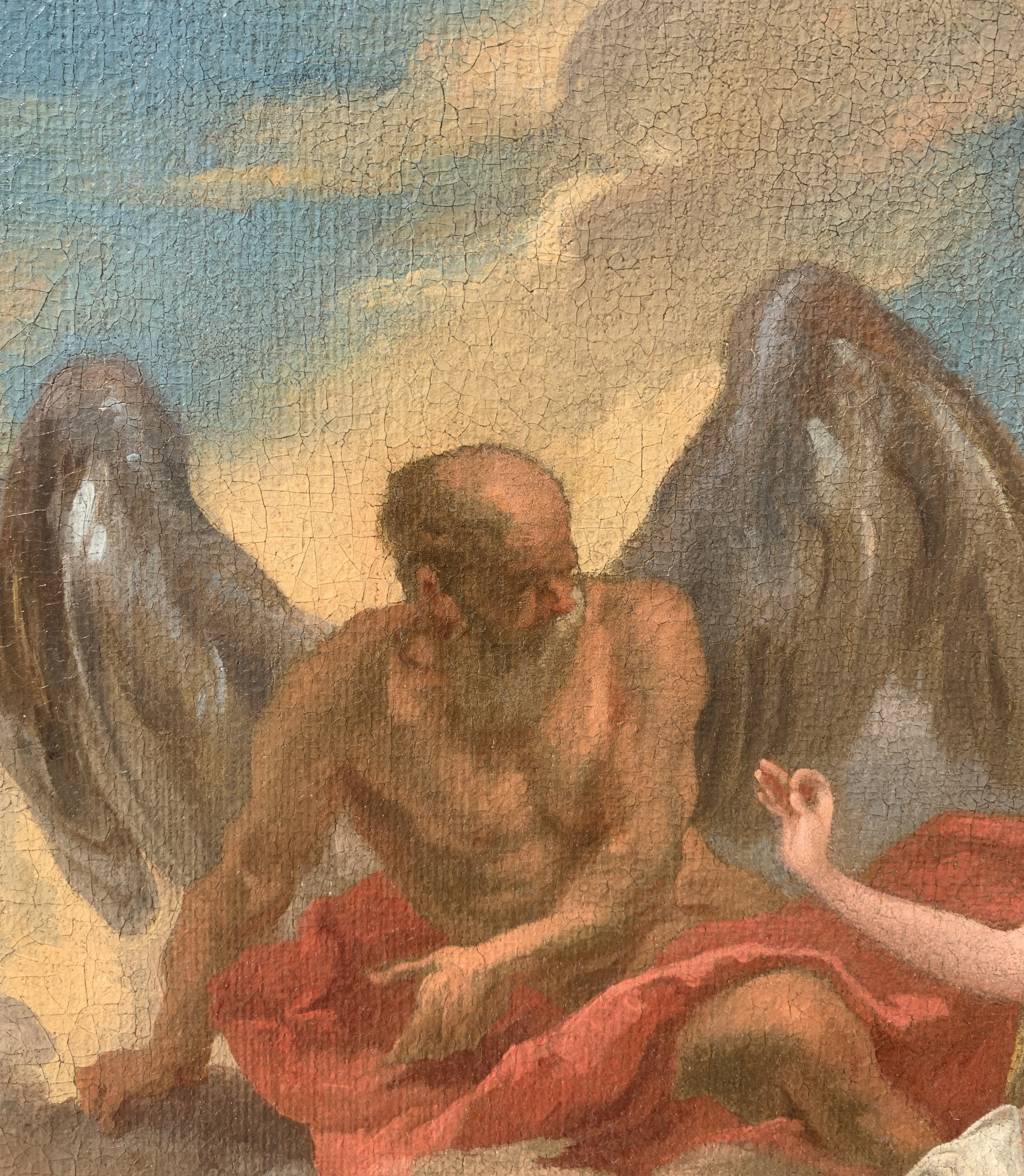 Antique oil painting on canvas, in a carved and gilded wooden frame.