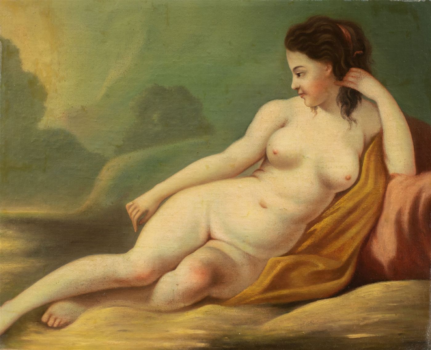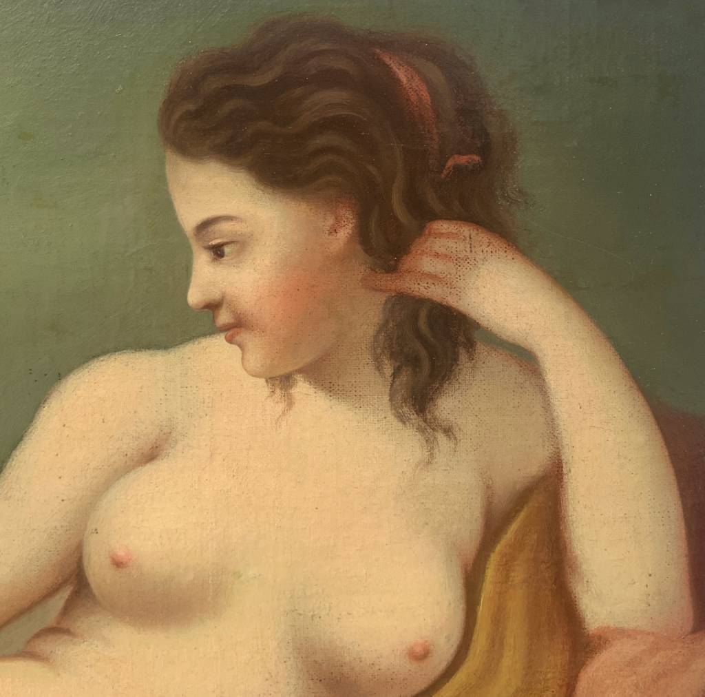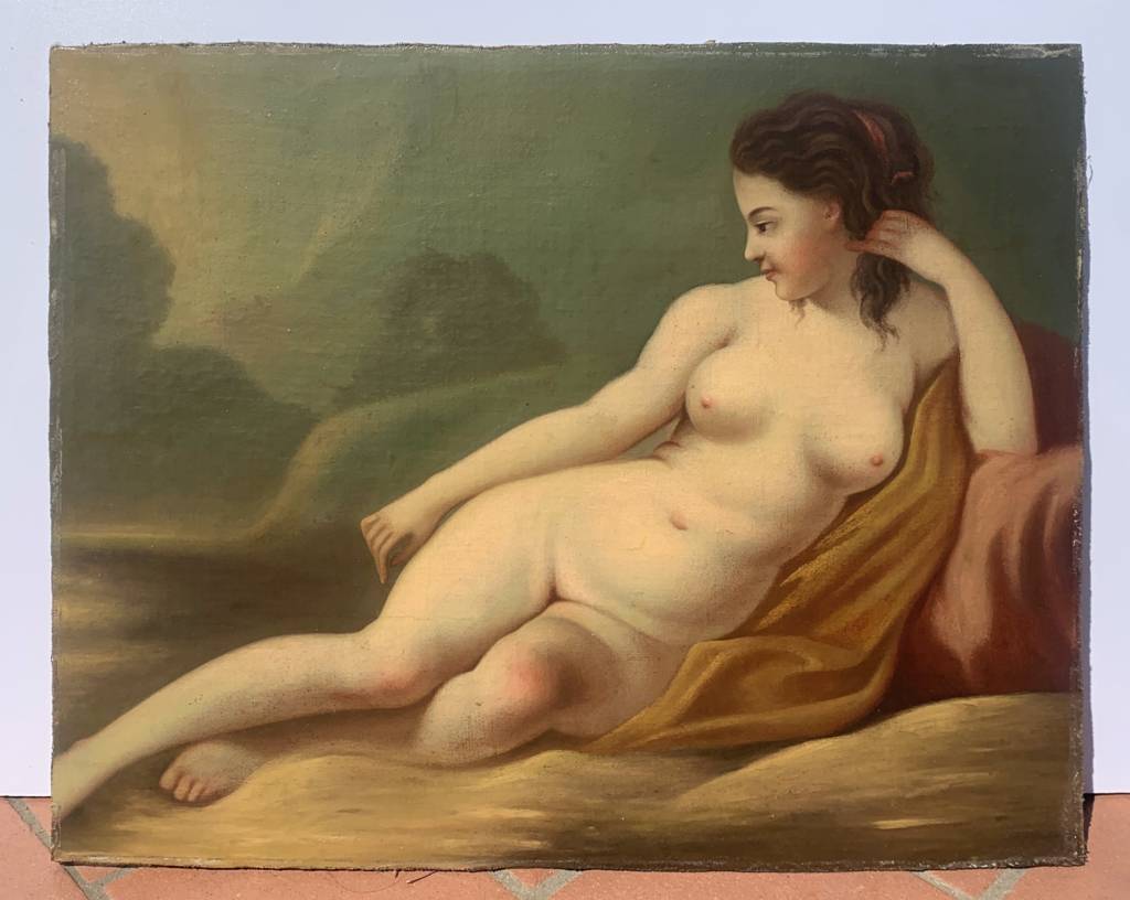 Italian painter (18th-19th century) - Female nude. 44 x 54 cm without frame, 54 x 64 cm with frame. Antique oil painting on canvas laid down on panel, in a carved and gilded wooden frame. Condition report: Good state of preservation of the painted surface, there are traces of old restorations and wear. - All shipments within the EU are free and professionally packed. - Each item is sold with a certificate of authenticity with legal validity. - Further information on the condition report is available upon request. - Viezzi Arte guarantees quality and professionalism at competitive prices, contact us at info@viezziarte.it or via WhatsApp at +39 3402841279. *Message aimed at non-Italian buyers: Please note that this work has not yet obtained the certificate of free export from Italy from the Superintendence of Cultural Heritage. This document certifies that the work is not part of the Italian cultural heritage. Normally, the release times for the certificates are 40 days from the date of the appointment: The new legislation in force since 2021 foresees, for amounts declared less than €13,500, shorter times at the discretion of the expert commission. All costs of this operation are included.