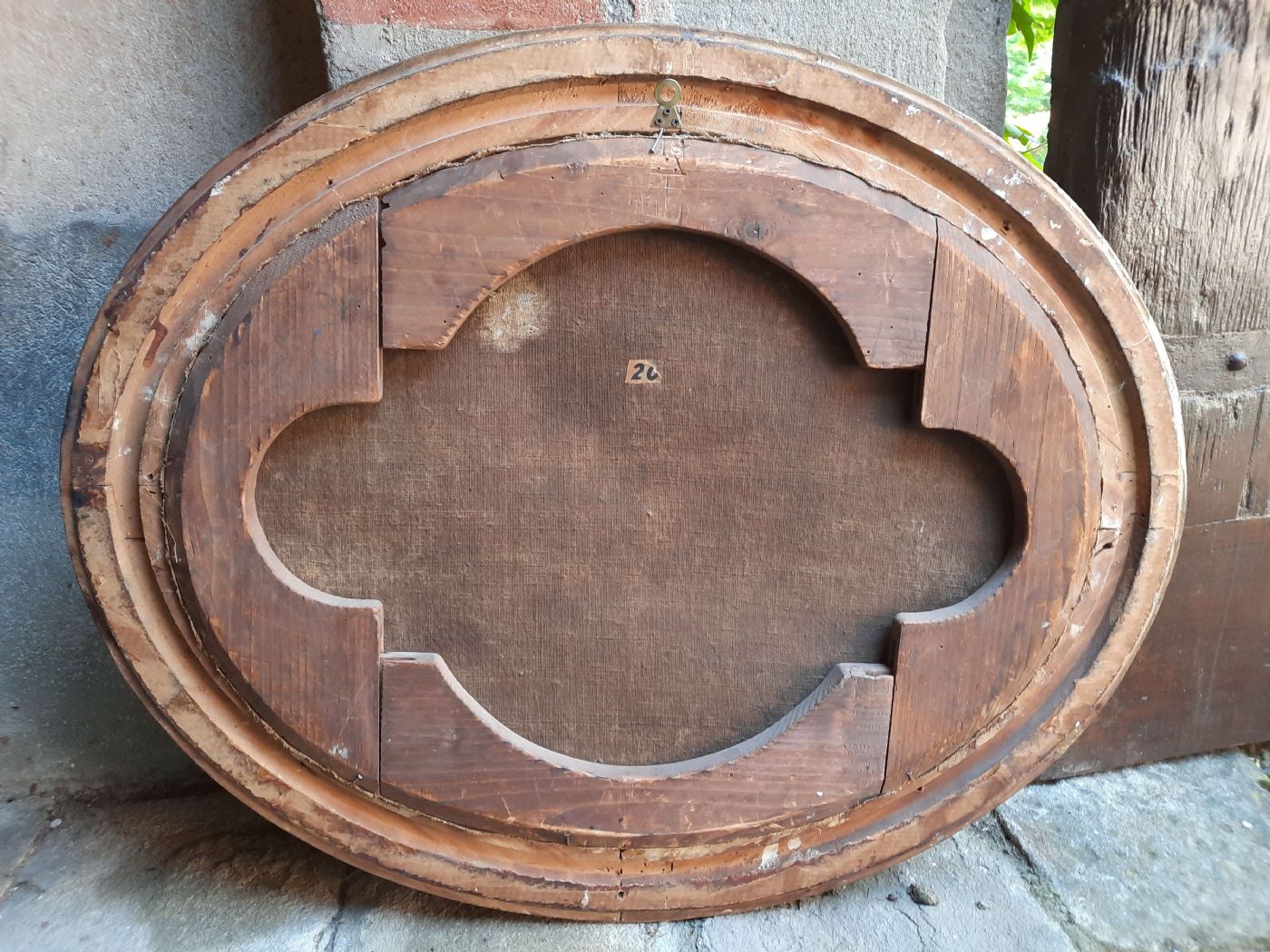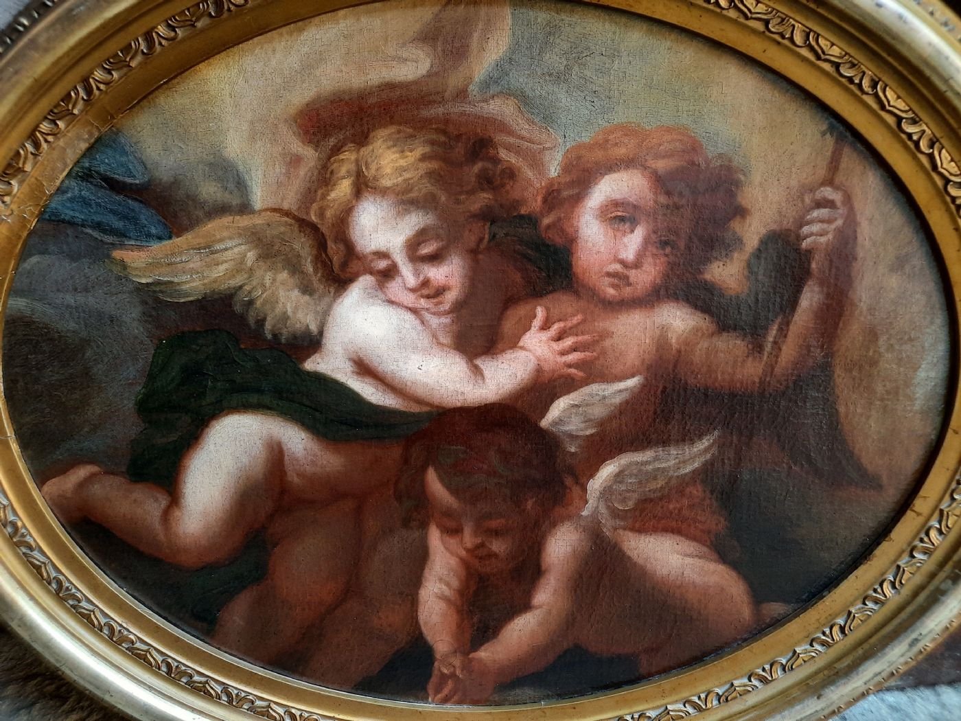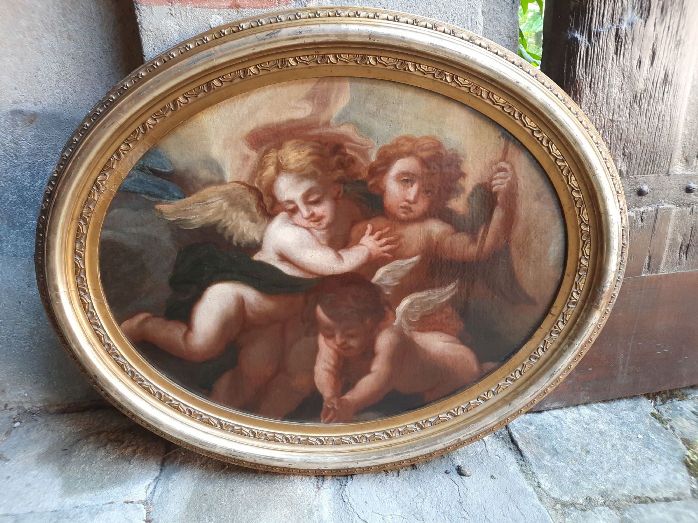 Dipinto in ottime condizioni, di grande maestria e qualità pittorica, opera di un Artista di Scuola italiana primi del sec. XVIII. se non a cavallo.L' Artista dipinge tre angeli sorpresi a guardare dall'alto, la sensazione di grazia che offre la scena è enfatizzata dalle pose aggraziate degli angioletti e dall'uso magistrale della tavolozza. L'opera è un olio su tela di forma ovale e misura cm. 50x65 la sola tela e con la sua cornice dorata cm. 65x80.